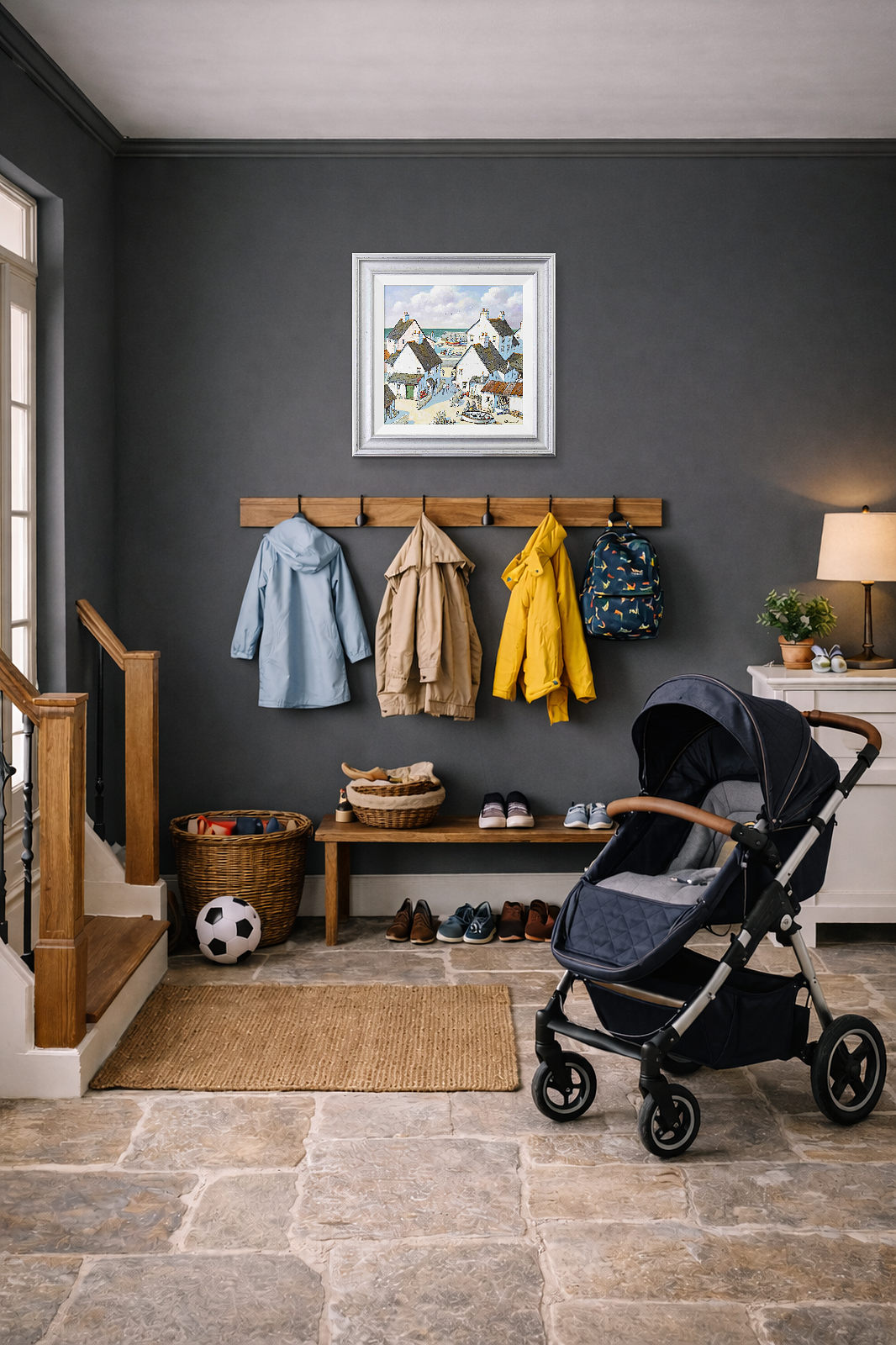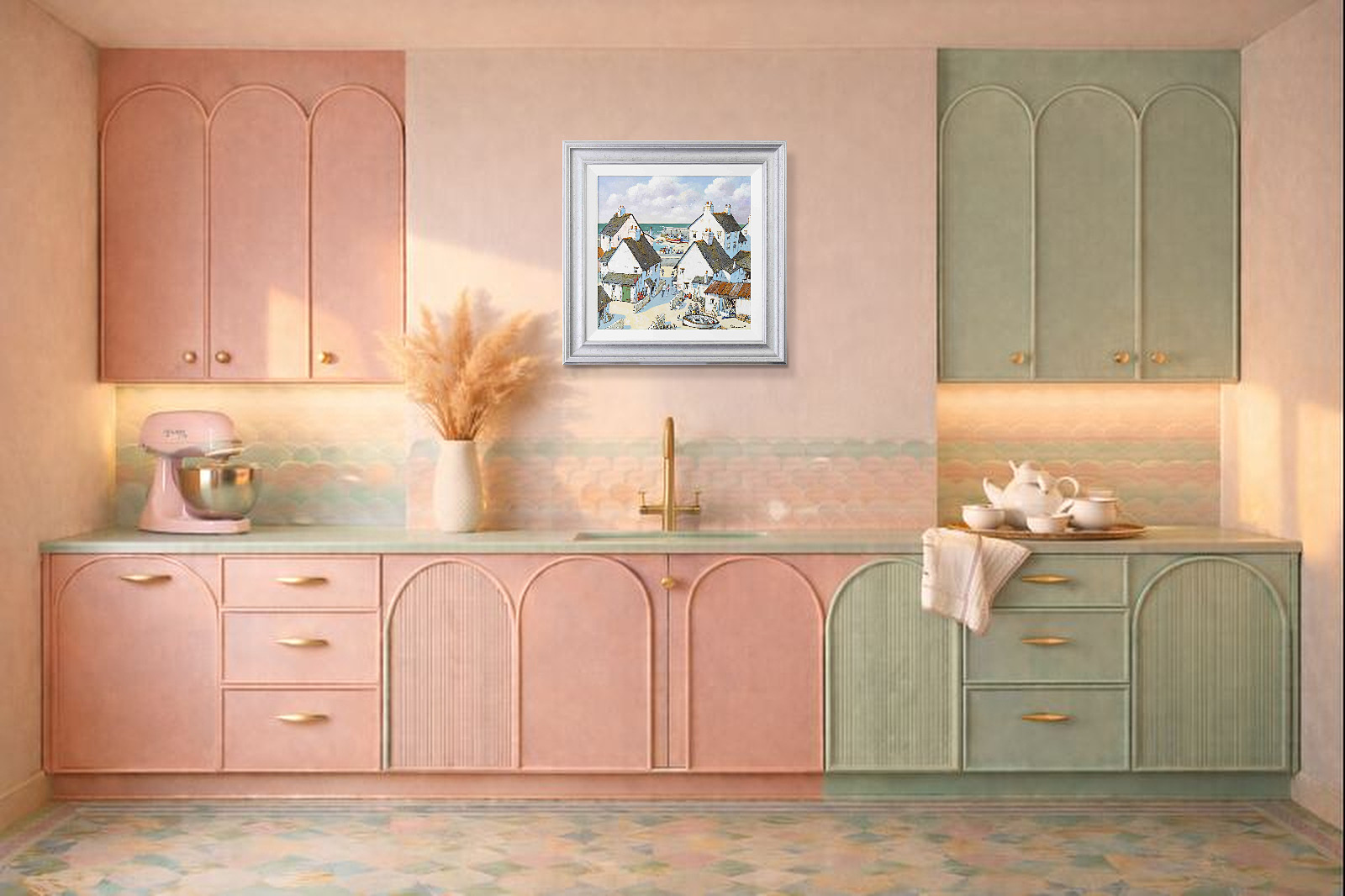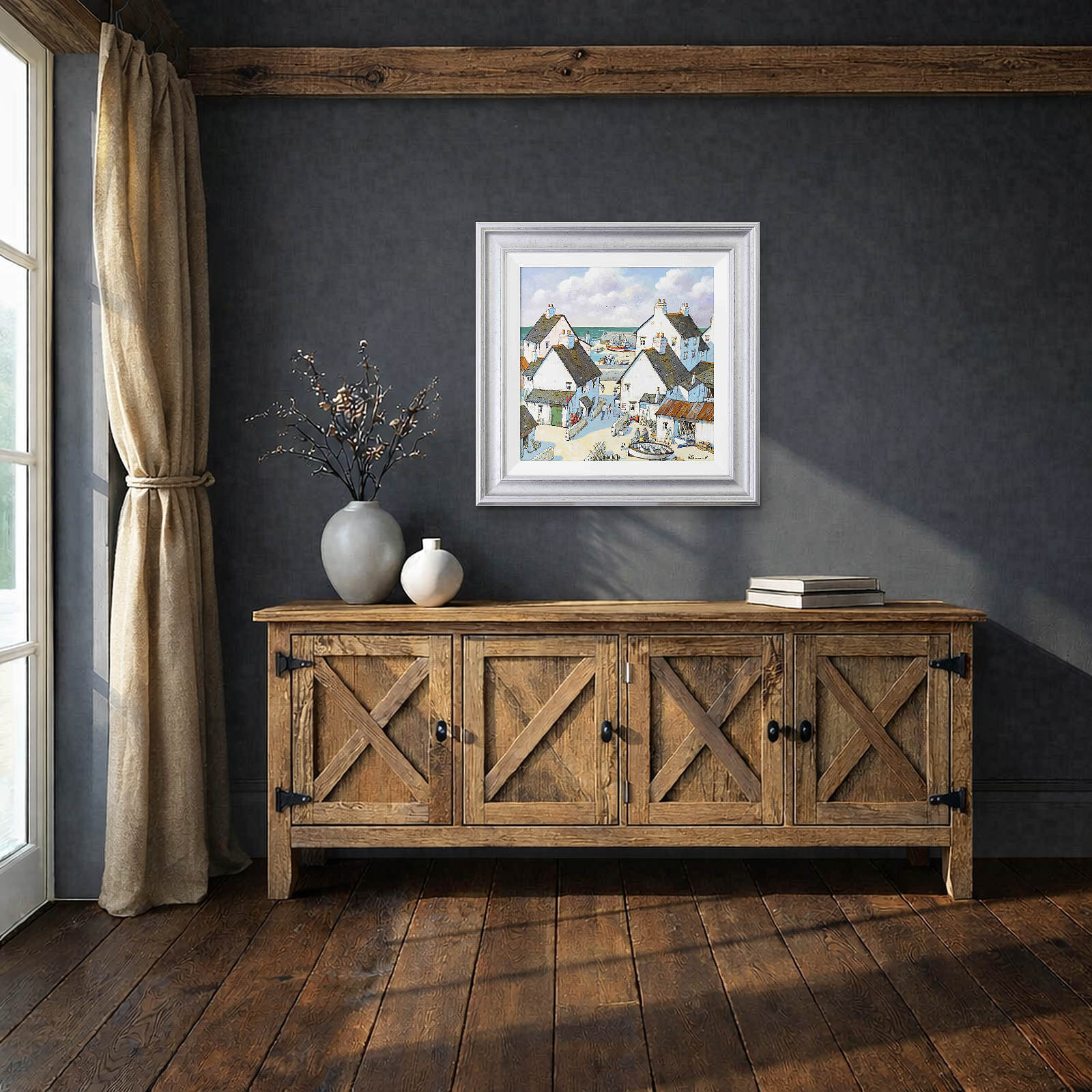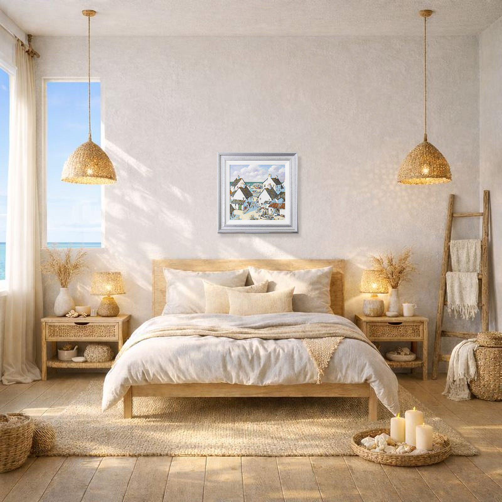 Playful coastal painting inspired the British south coast in Alan Smith’s signature contemporary style. Presented framed in white slip and silver finish frame as shown and ready to hang.