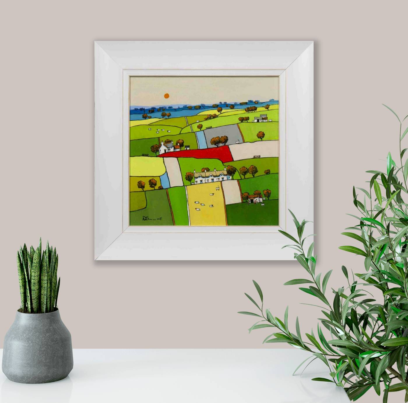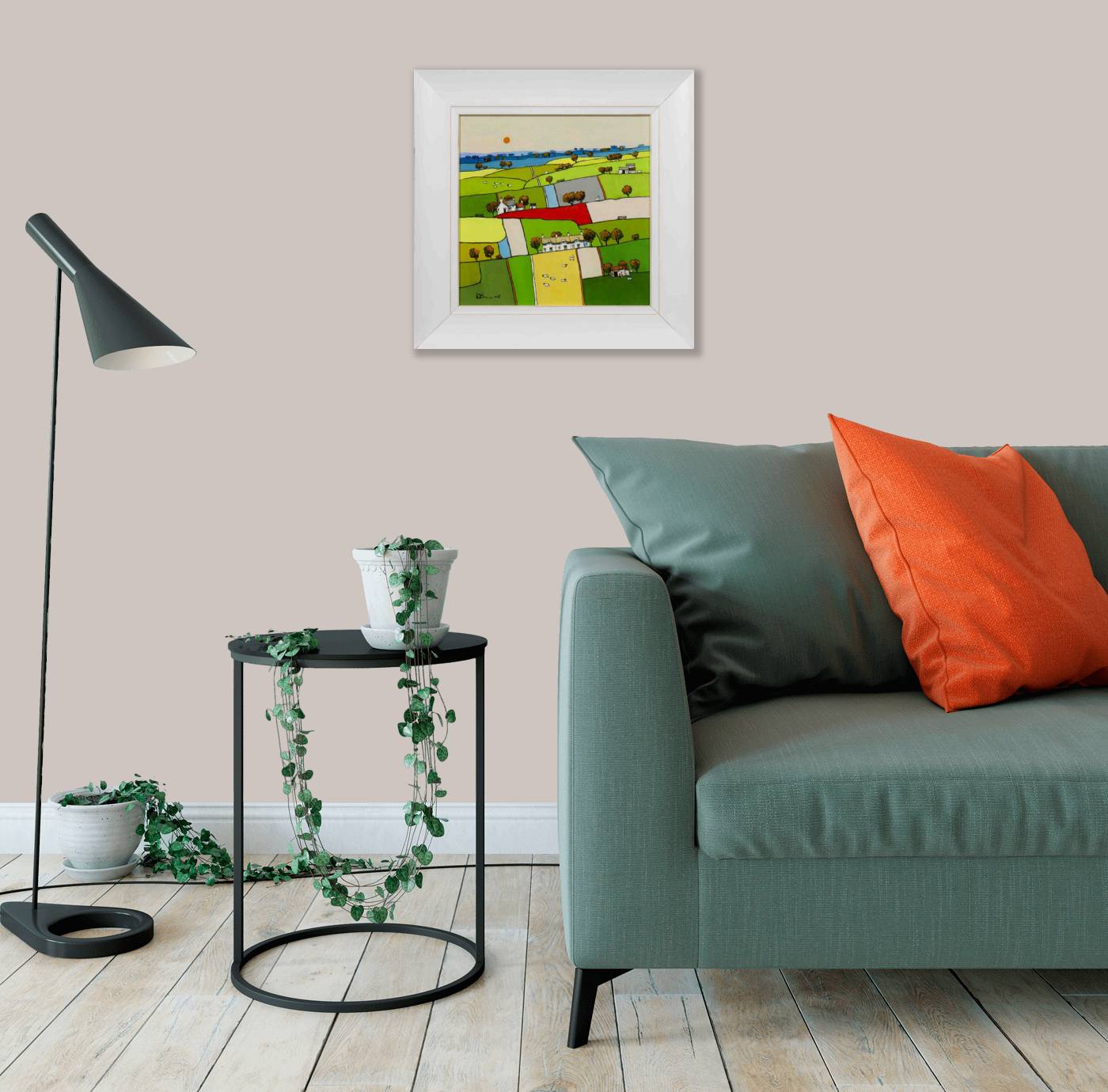 A bright and joyful original painting in the artist’s wonderful patchwork style. Presented in white frame with edge details as shown and ready to hang.