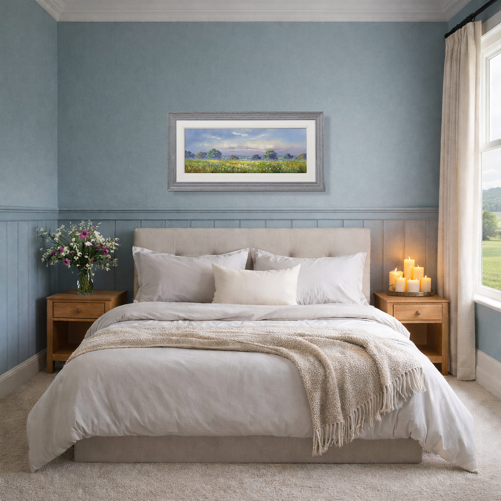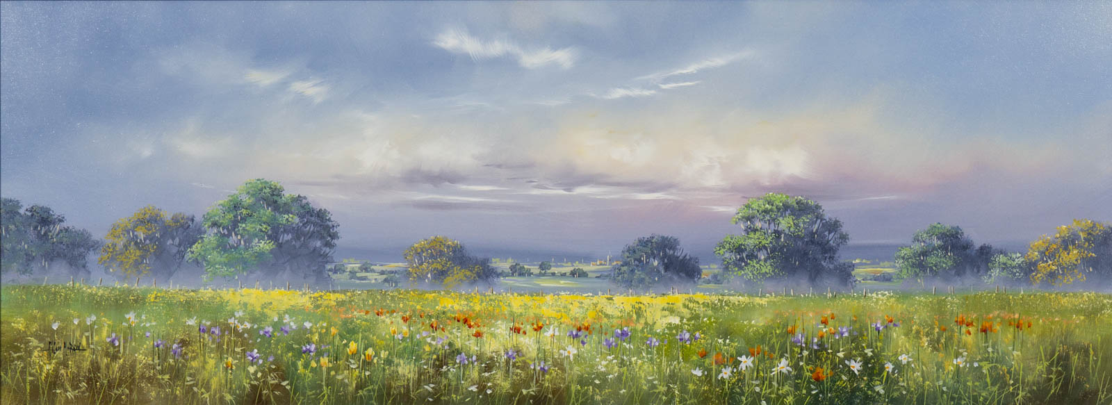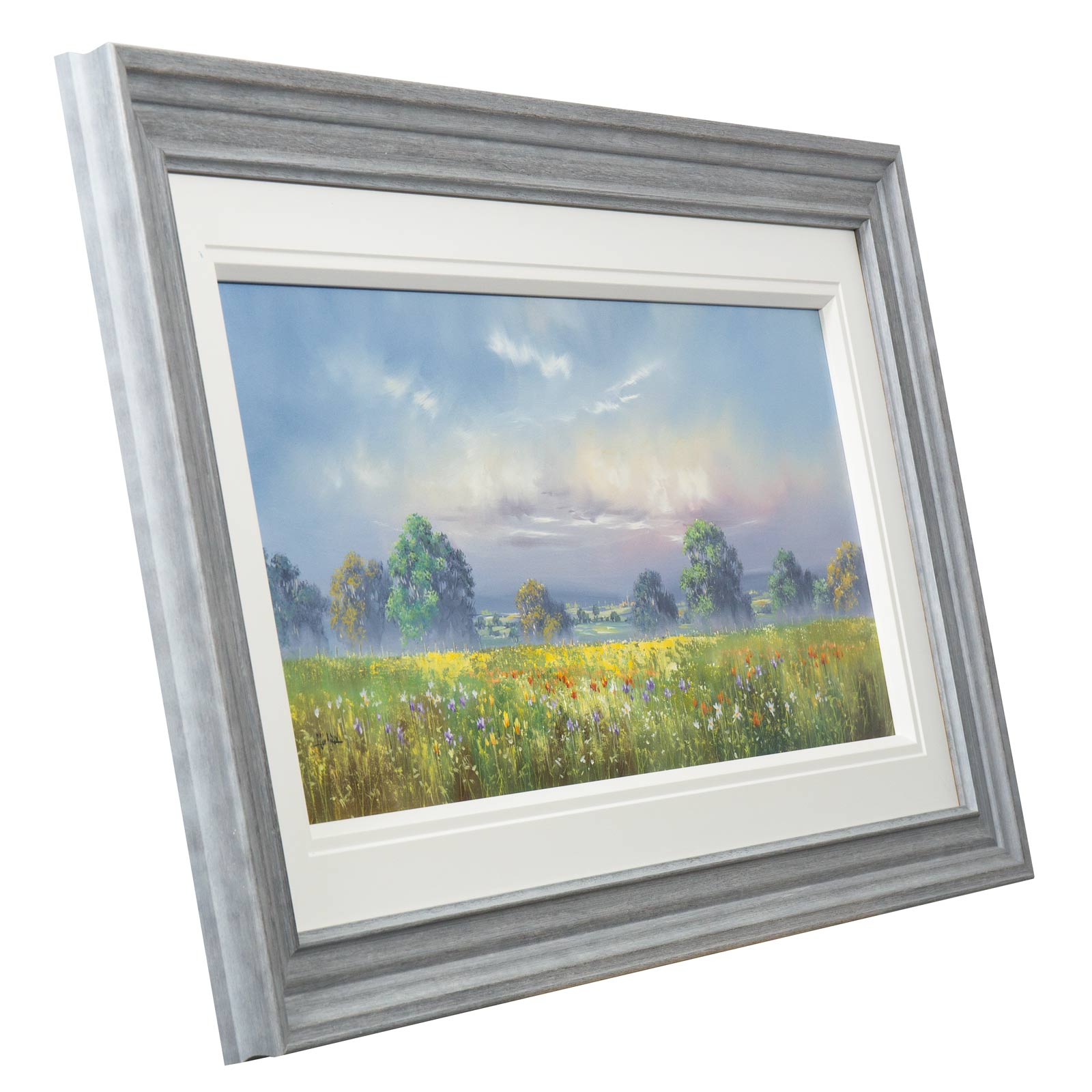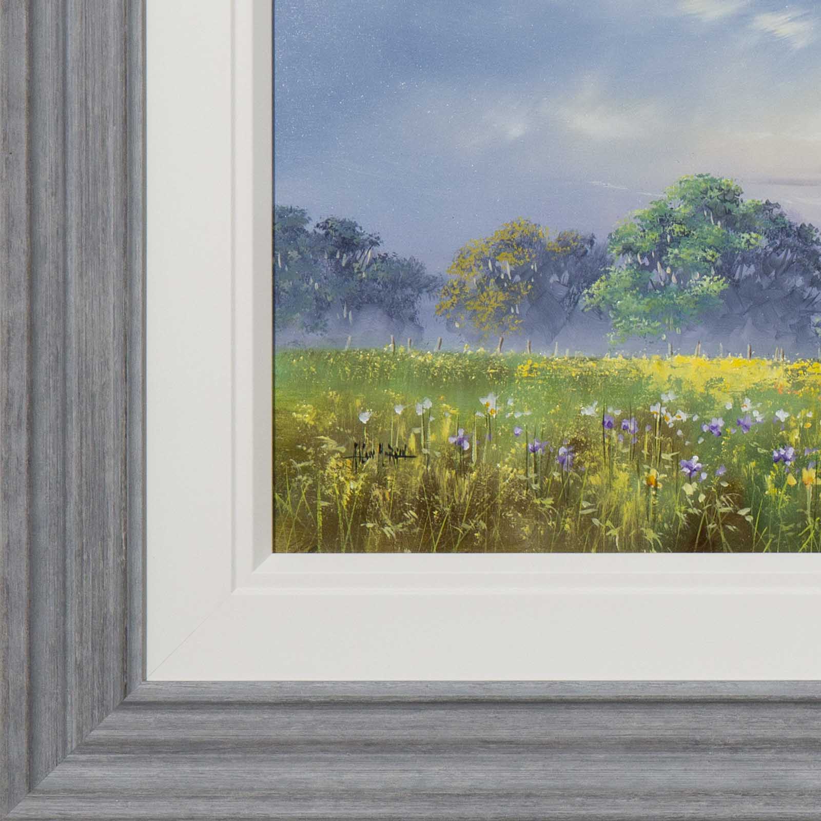 Large meadow landscape painting by celebrated British artist Allan Morgan. Complemented by a wide white slip and grey/blue frame as shown and ready to display on your wall.