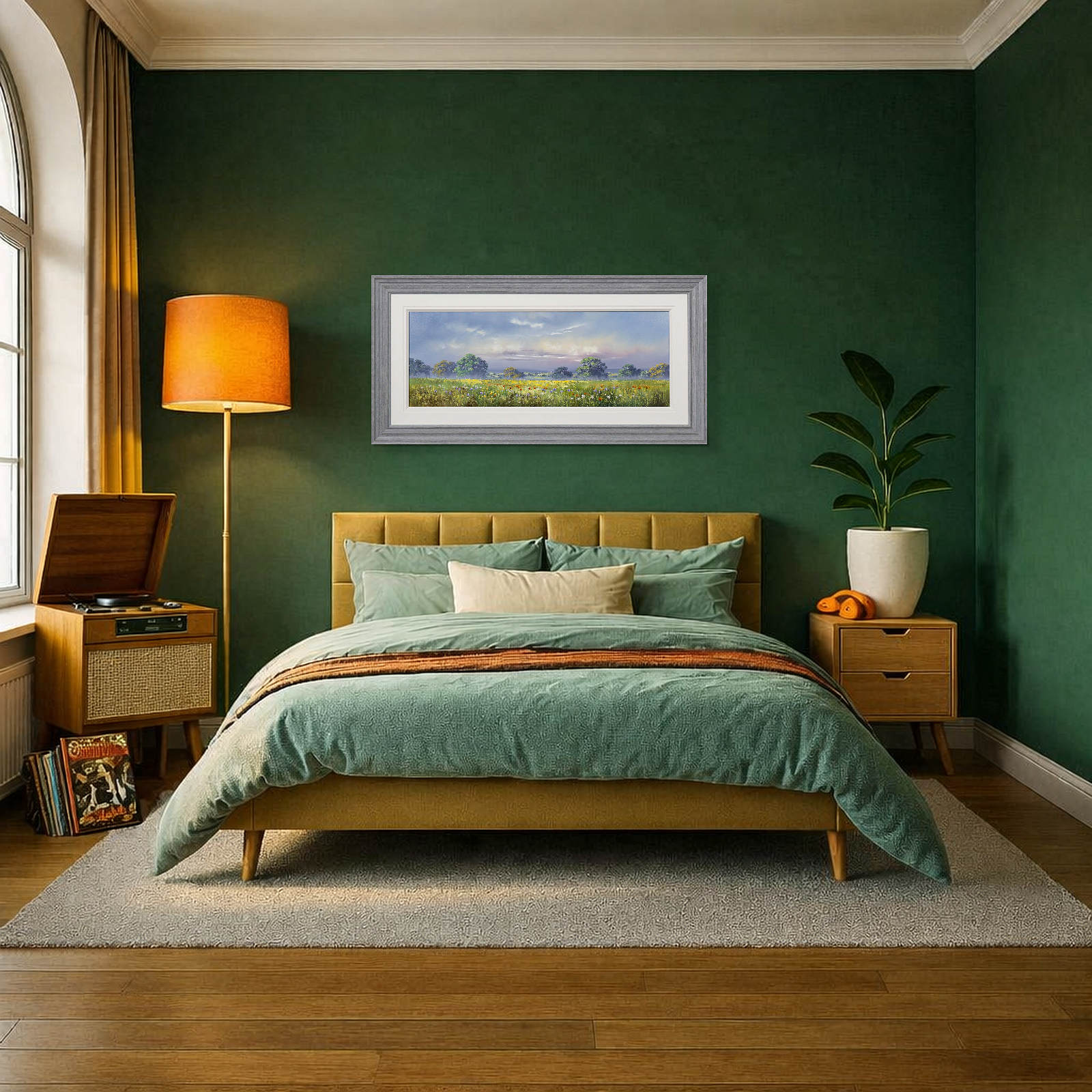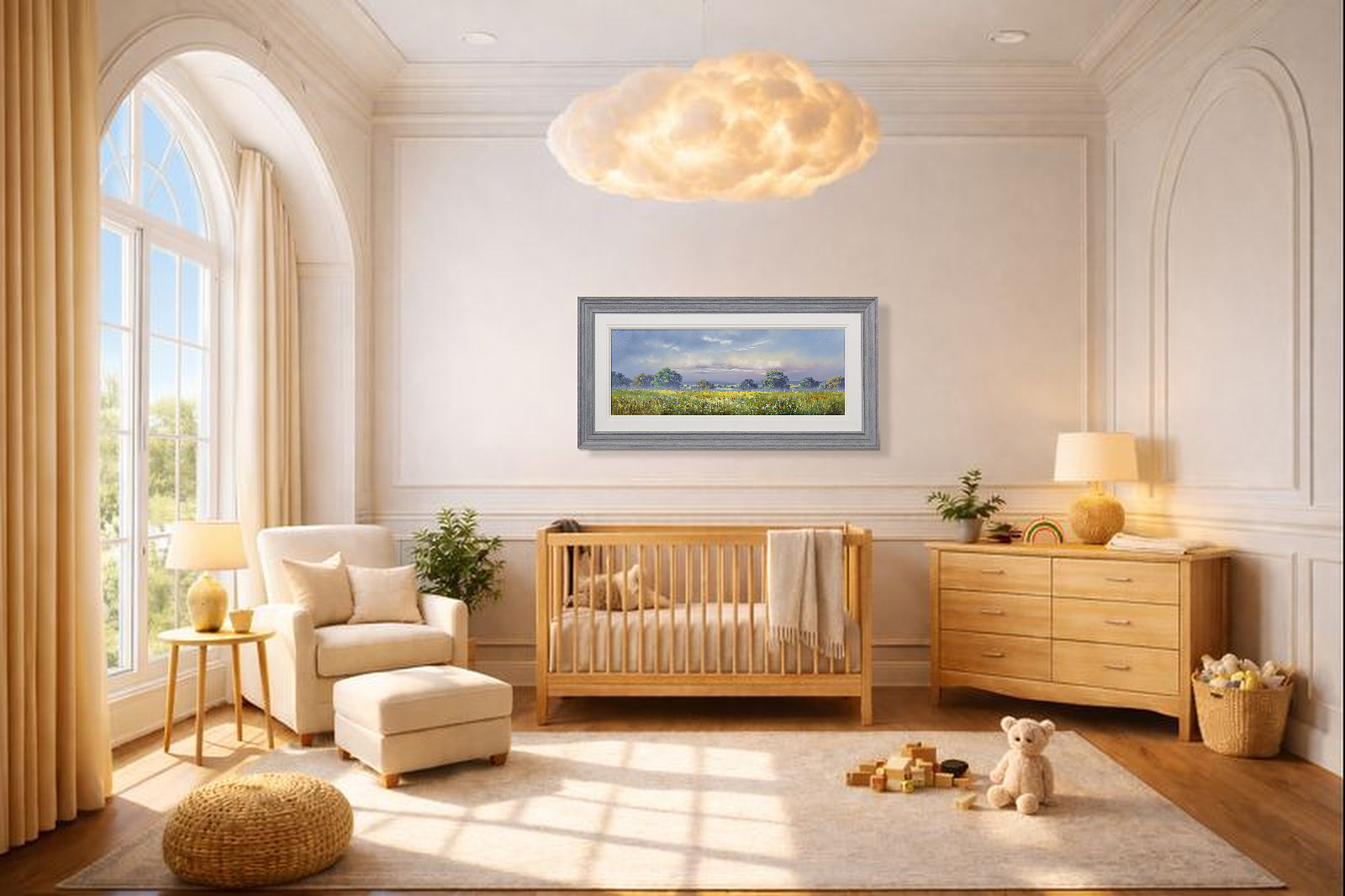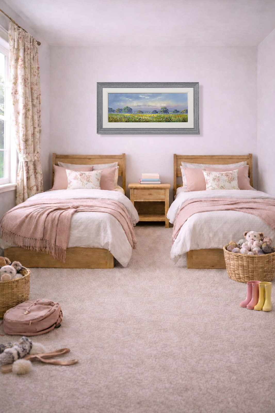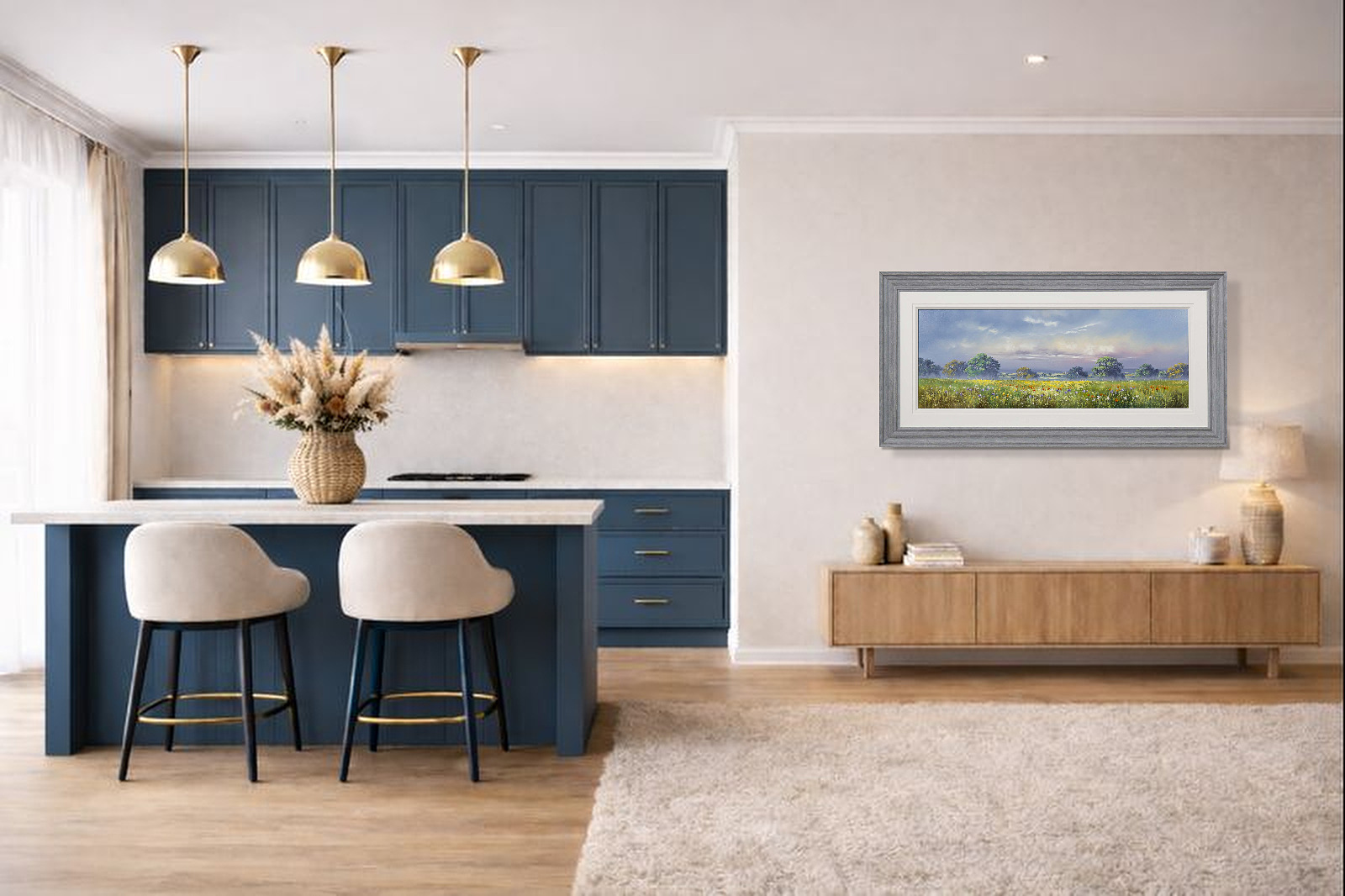 Large meadow landscape painting by celebrated British artist Allan Morgan. Complemented by a wide white slip and grey/blue frame as shown and ready to display on your wall.