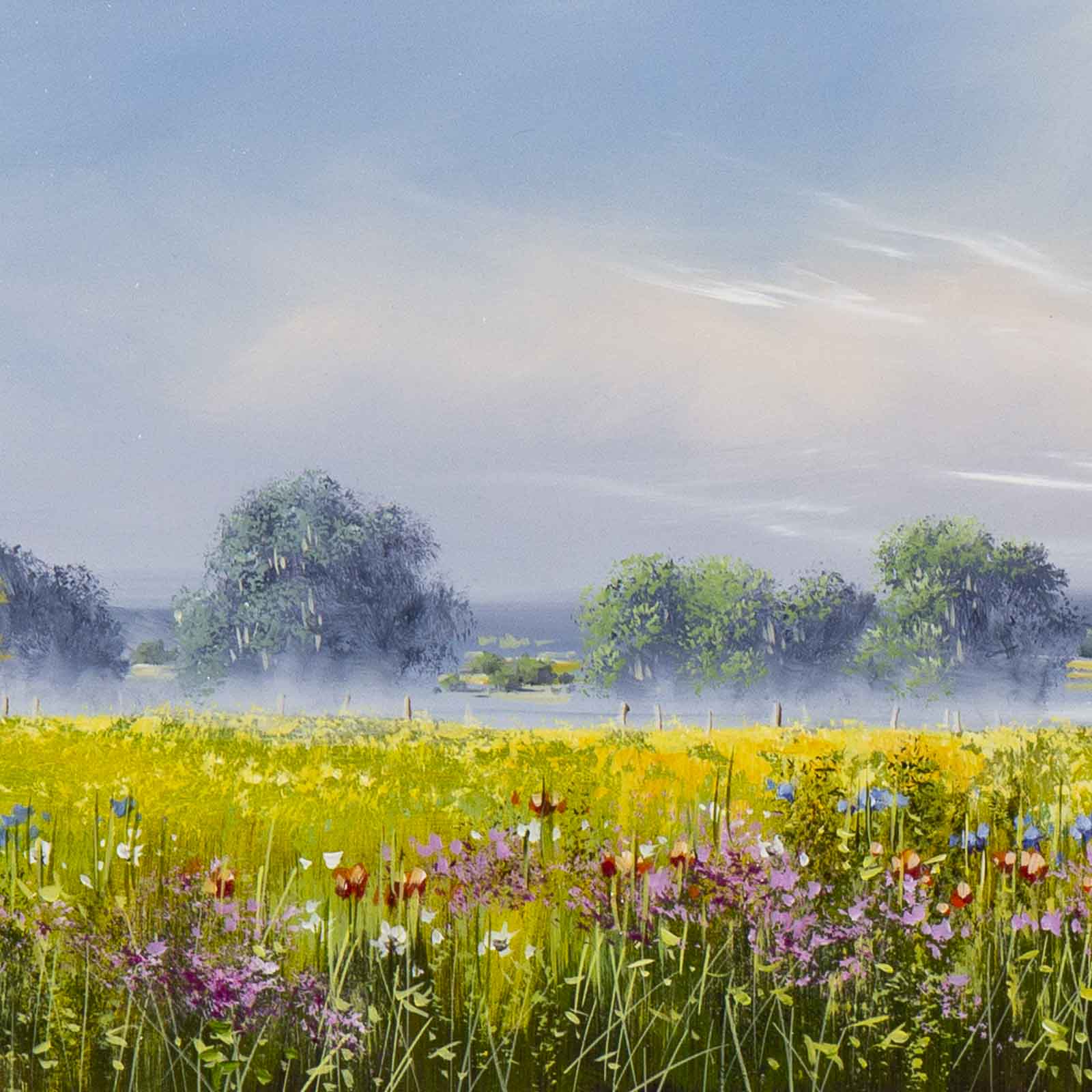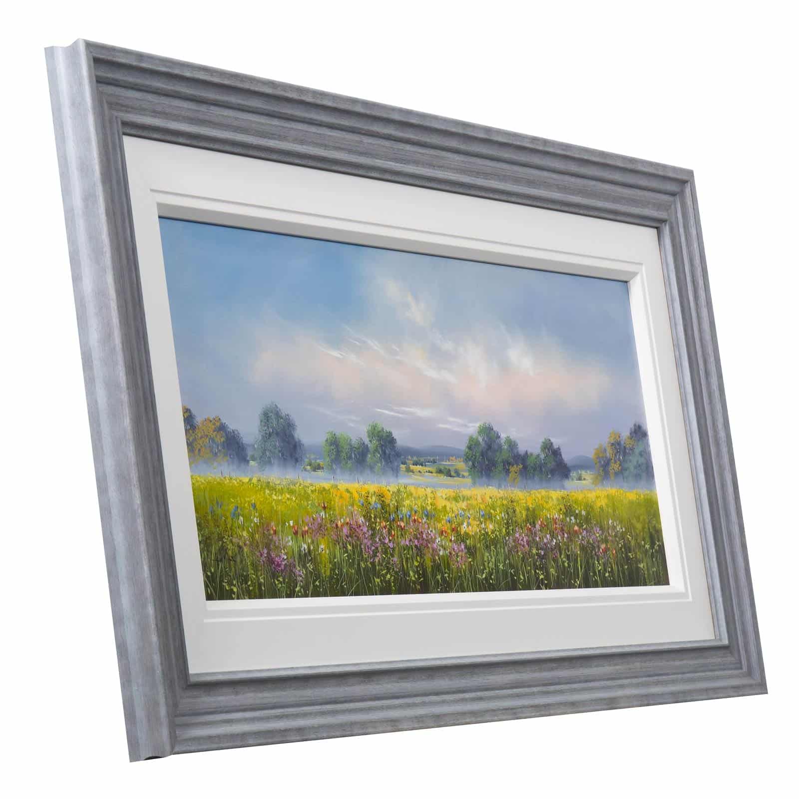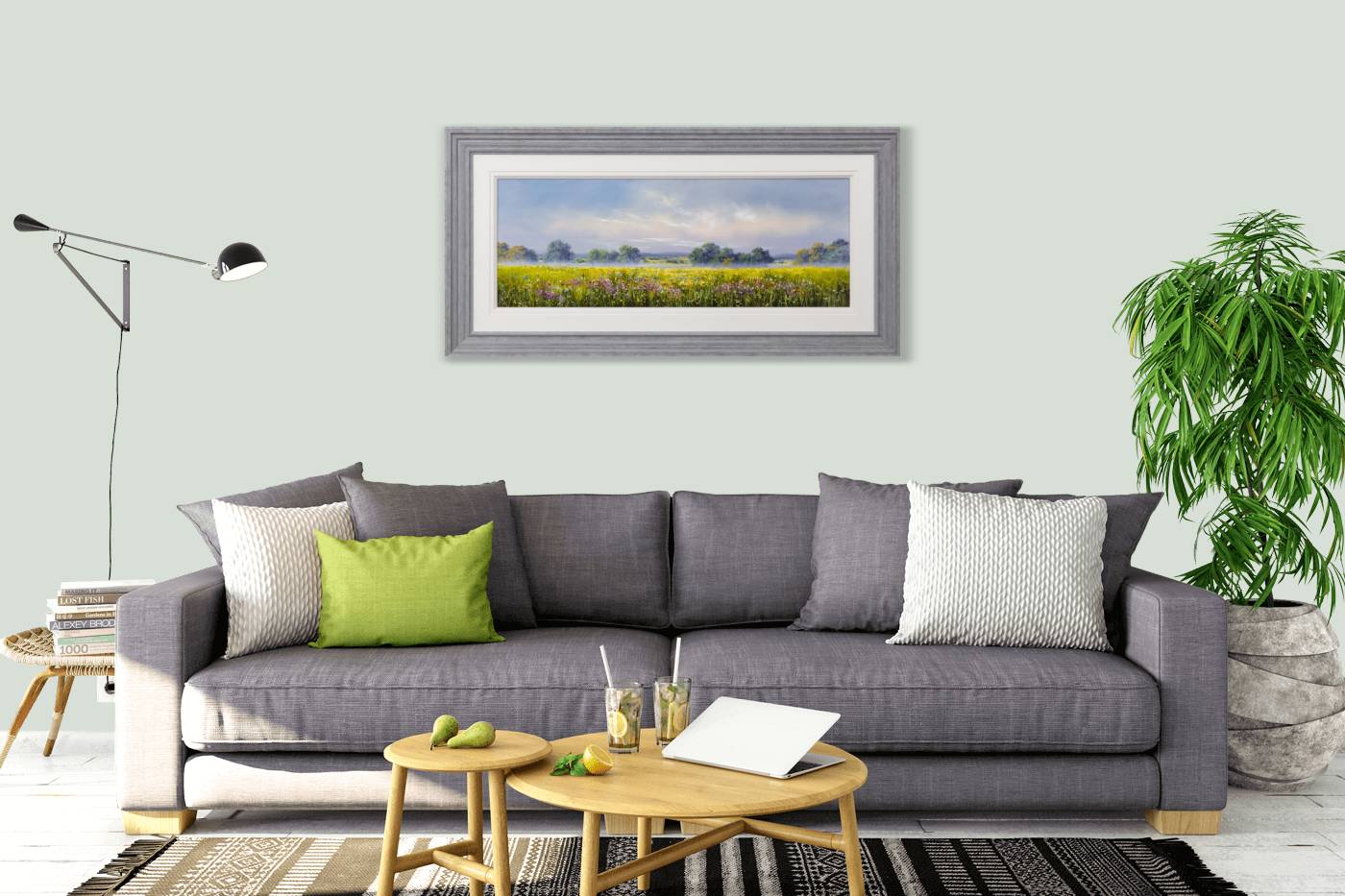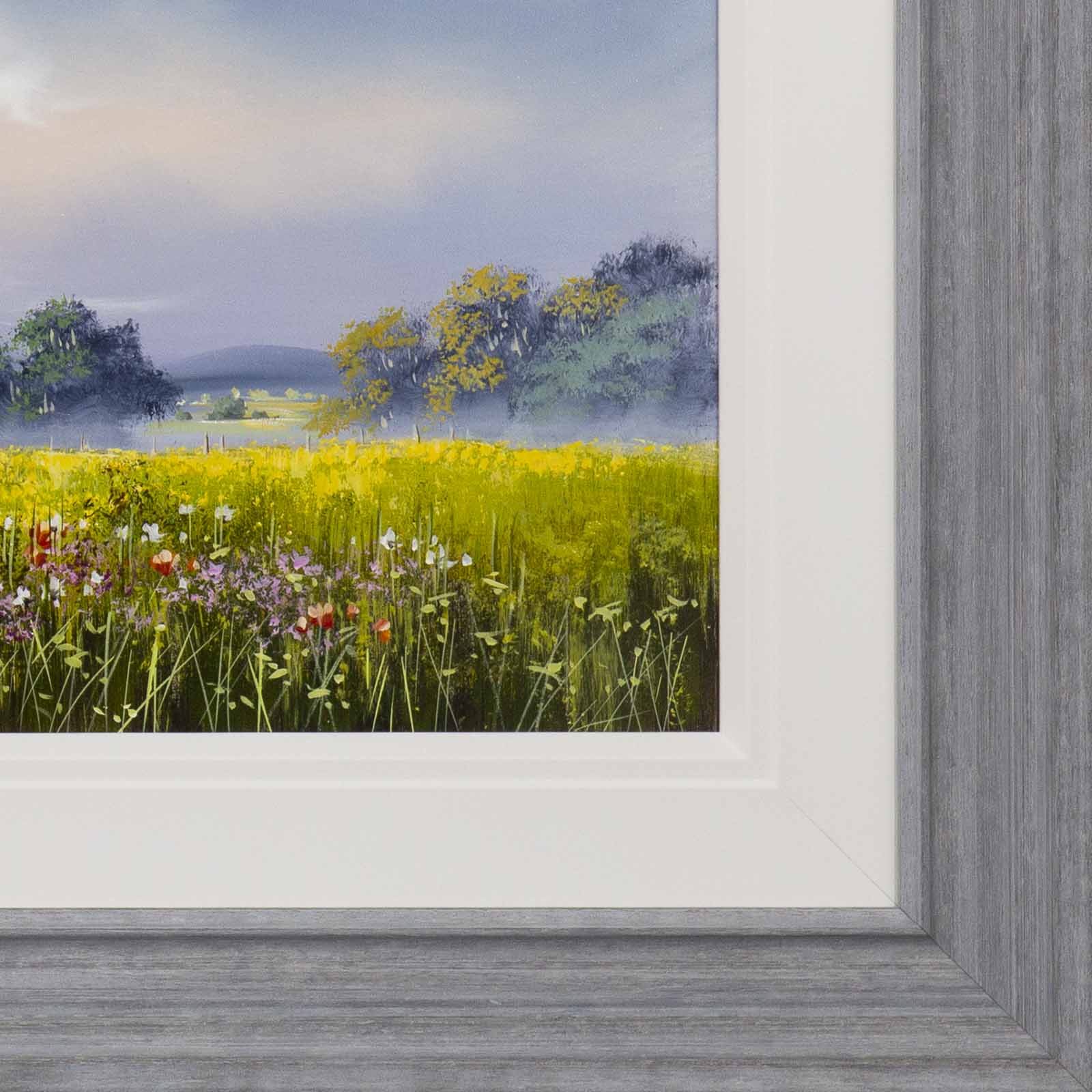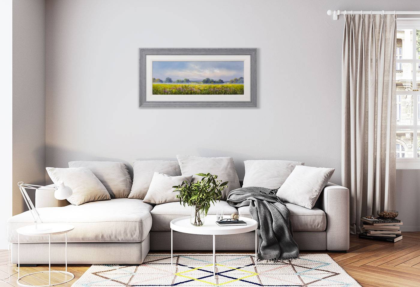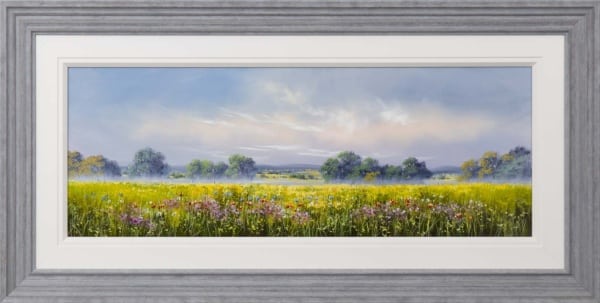 Large meadow landscape painting by celebrated British artist Allan Morgan. Complemented by a wide white slip and grey/blue frame as shown and ready to display on your wall.