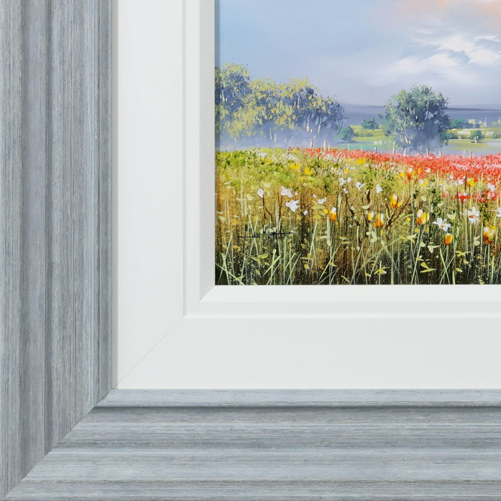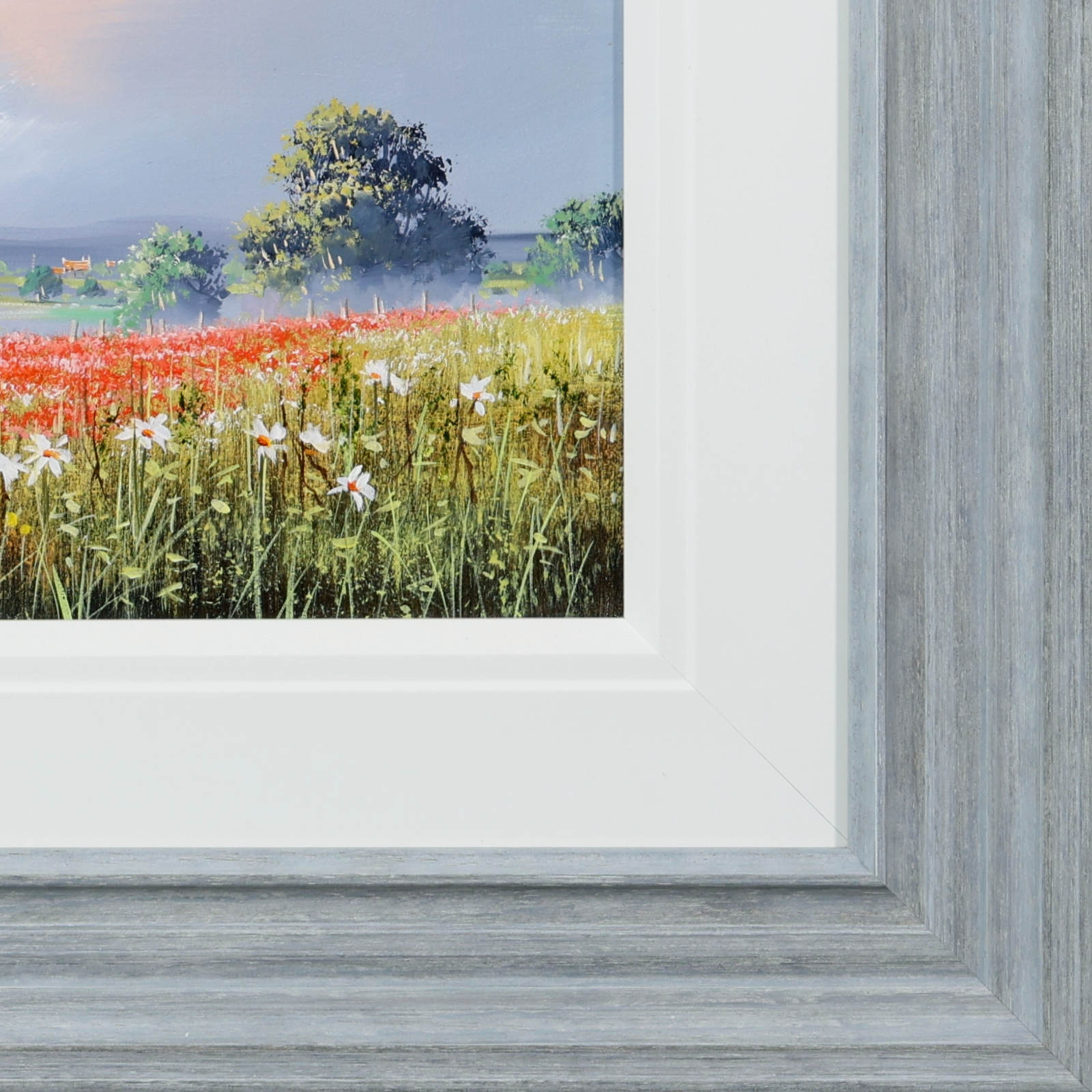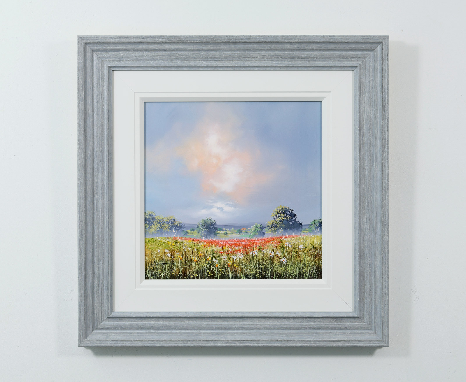 A vibrant stretch of wildflowers runs through the meadow beneath a softly glowing sky. Fresh colour and open space give the piece an easy, summery feel. Lovely meadow landscape painting by celebrated British artist Allan Morgan. Complemented by a wide white slip and grey/blue frame as shown and ready to display on your wall.
