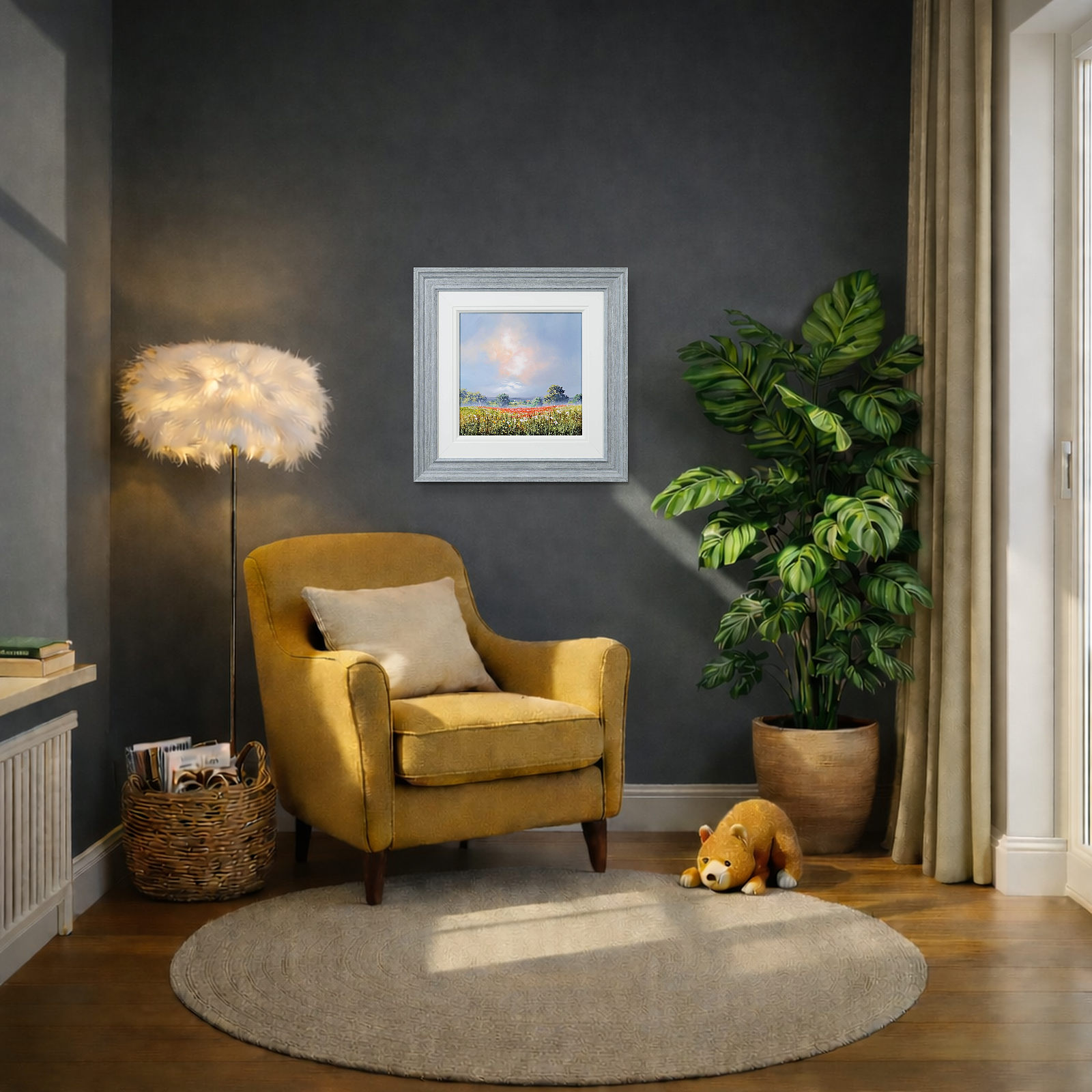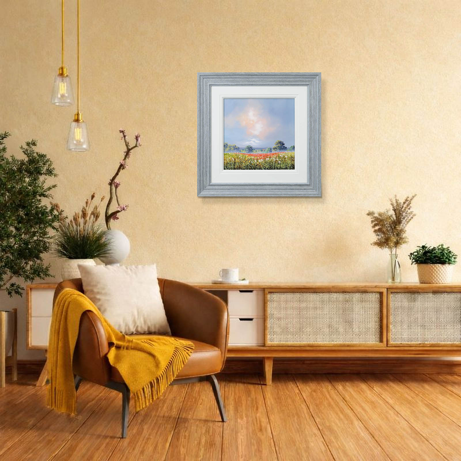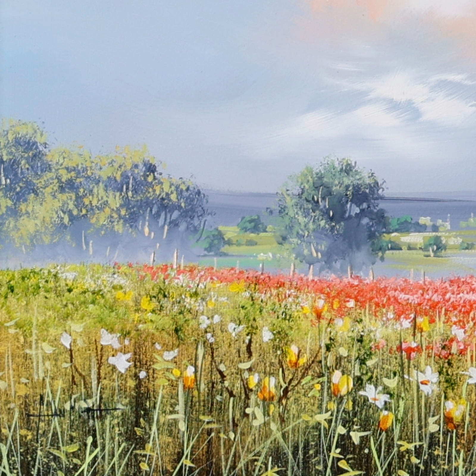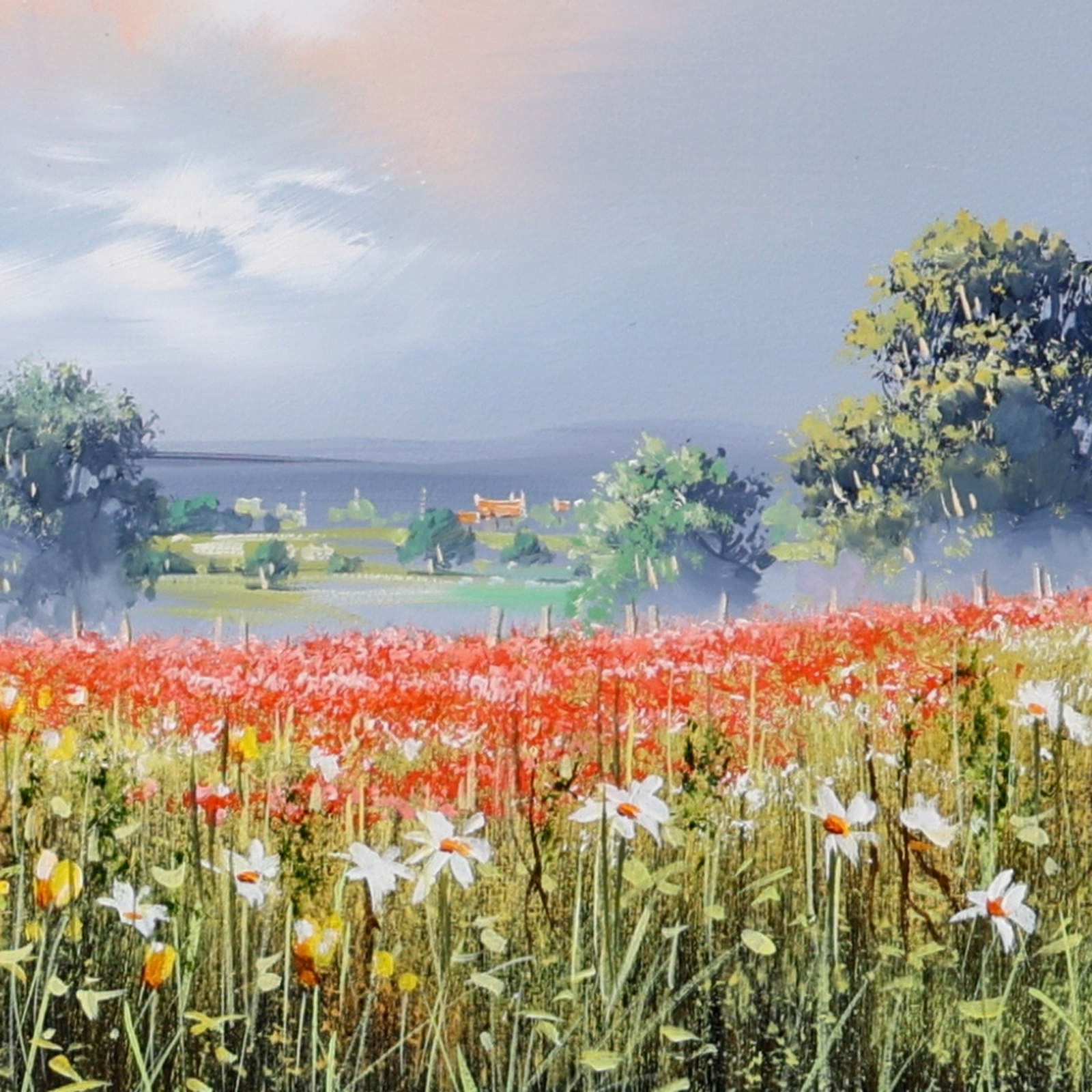 A vibrant stretch of wildflowers runs through the meadow beneath a softly glowing sky. Fresh colour and open space give the piece an easy, summery feel. Lovely meadow landscape painting by celebrated British artist Allan Morgan. Complemented by a wide white slip and grey/blue frame as shown and ready to display on your wall.