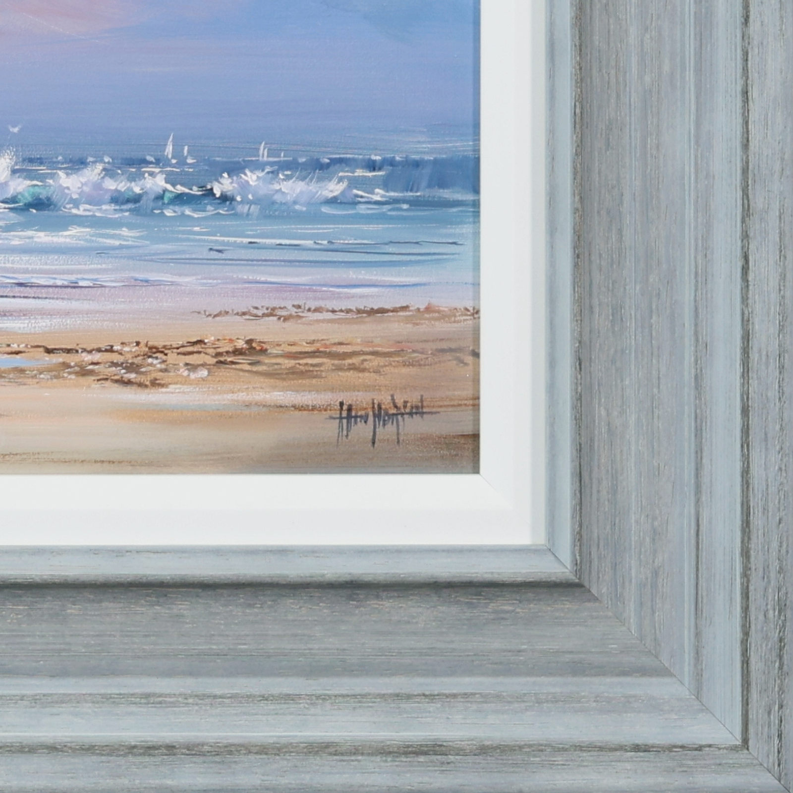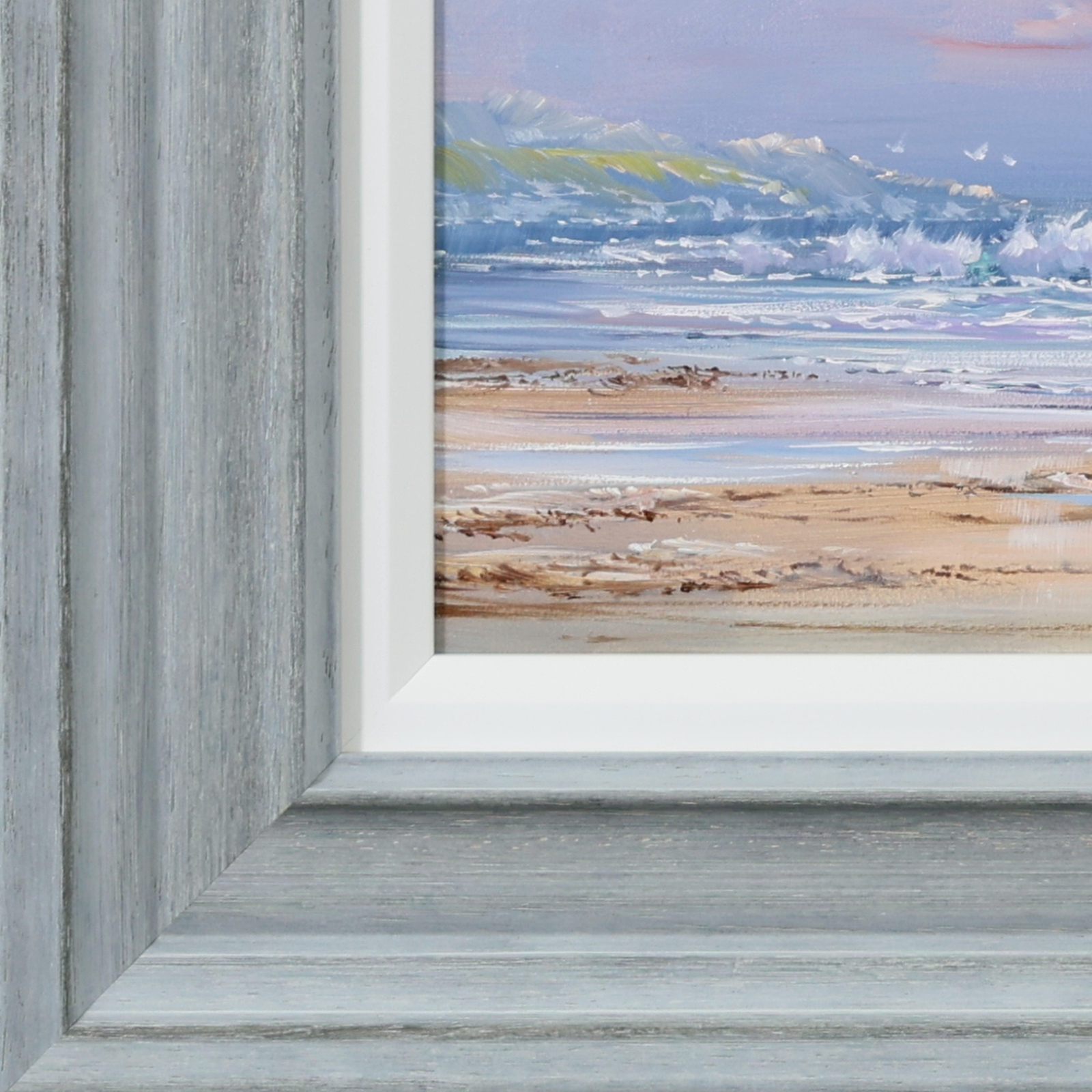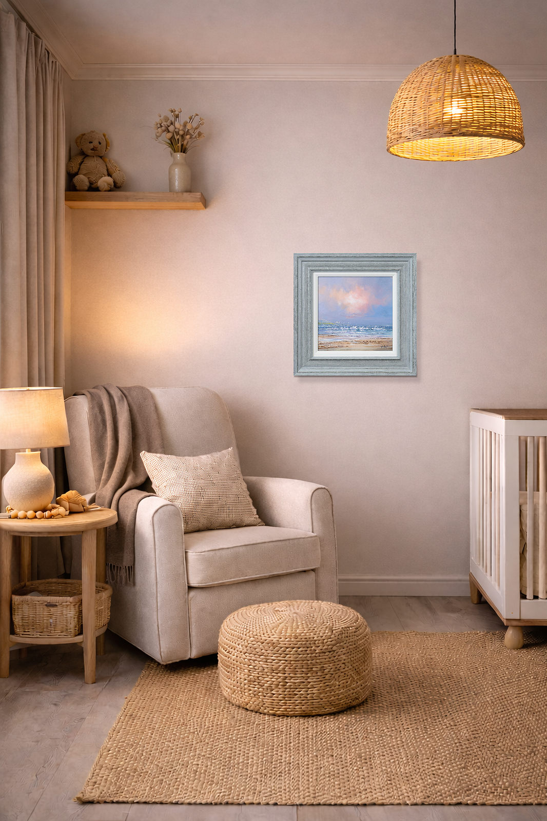 A peaceful stretch of shoreline under a soft, shifting sky. Gentle waves and muted tones create a calm, open coastal scene. Lovely little original seascape painting by celebrated British artist Allan Morgan. Complemented by a wide white slip and grey/blue frame as shown and ready to display on your wall.