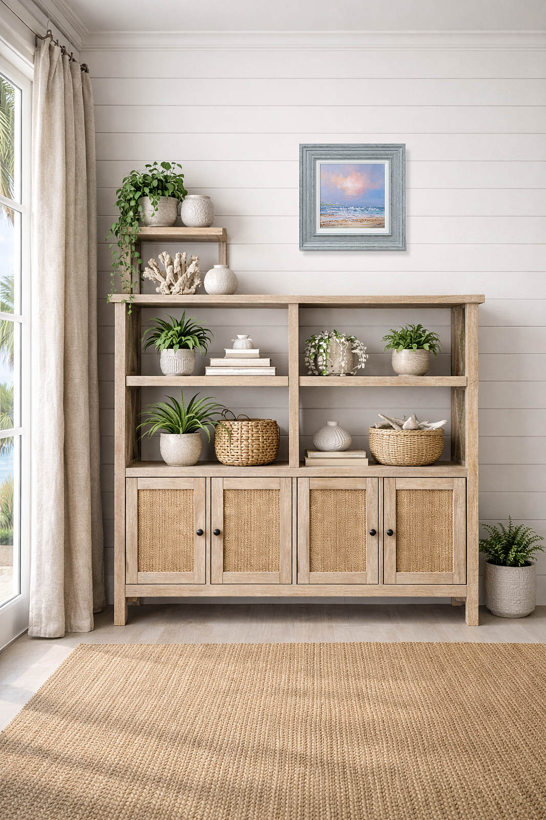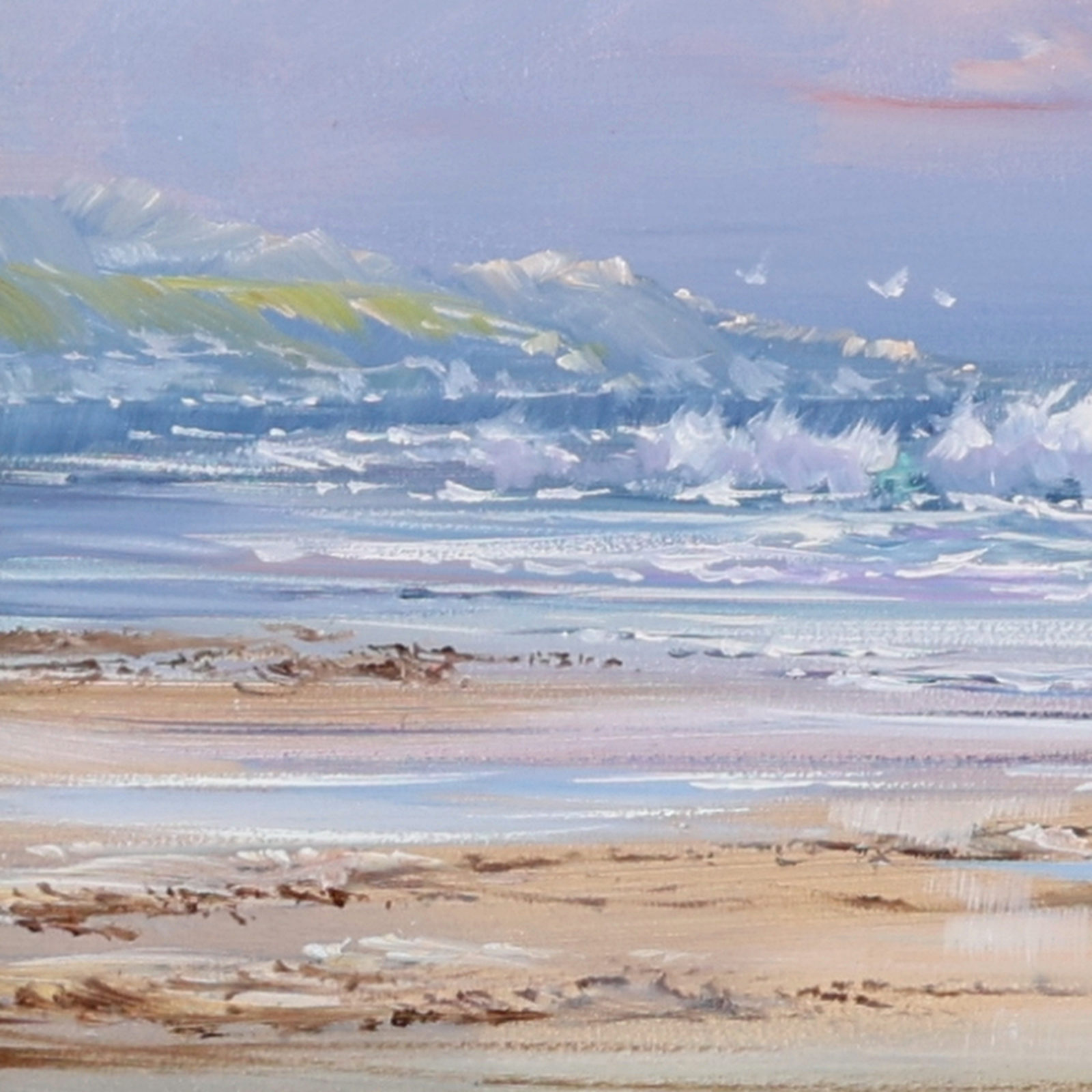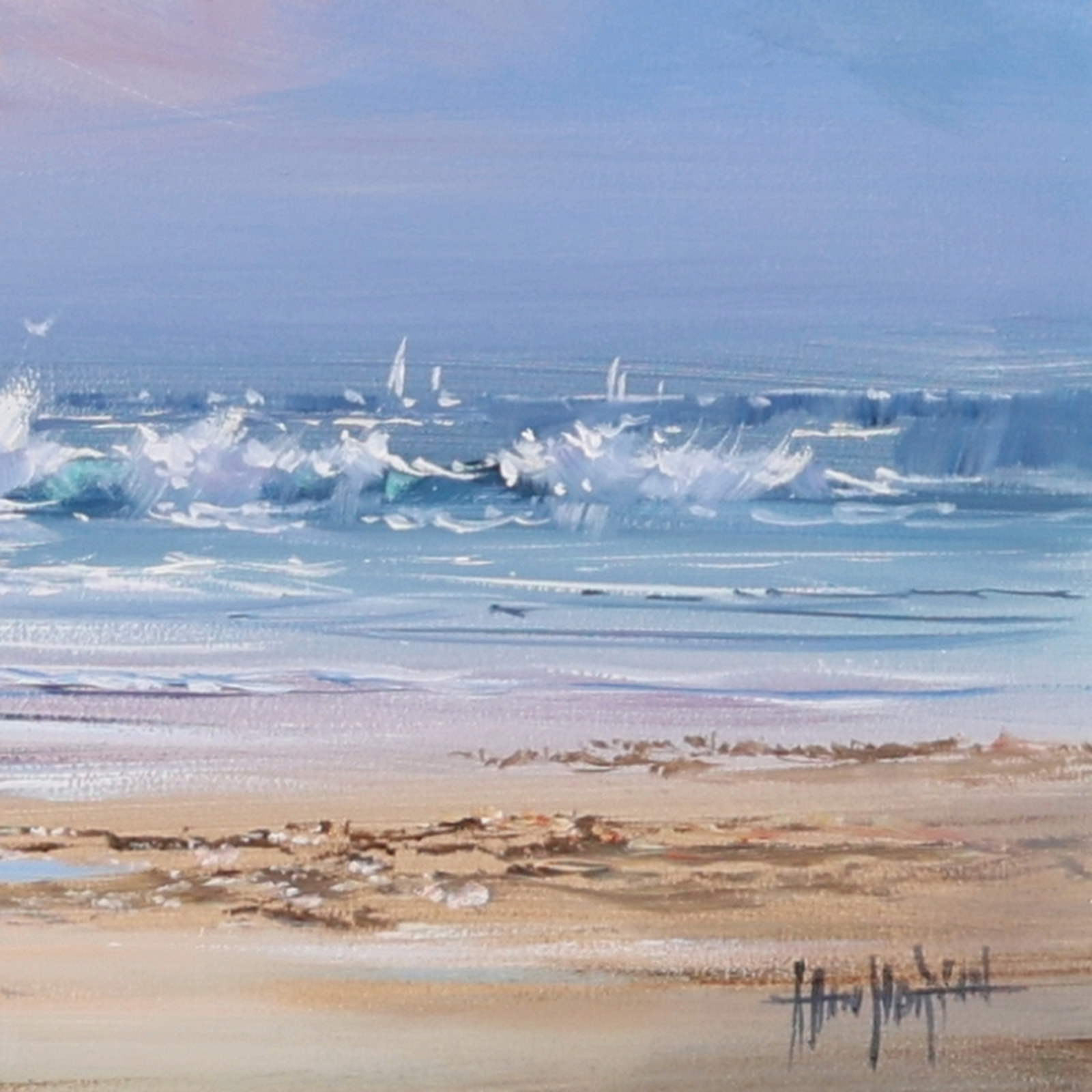 A peaceful stretch of shoreline under a soft, shifting sky. Gentle waves and muted tones create a calm, open coastal scene. Lovely little original seascape painting by celebrated British artist Allan Morgan. Complemented by a wide white slip and grey/blue frame as shown and ready to display on your wall.