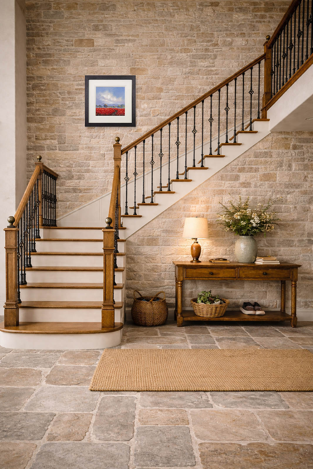 Original oil painting by Allan Morgan. A burst of light through the clouds give this atmospheric painting a sense of drama. Framed with a wide white slip and black frame, this painting is ready to display on your wall.