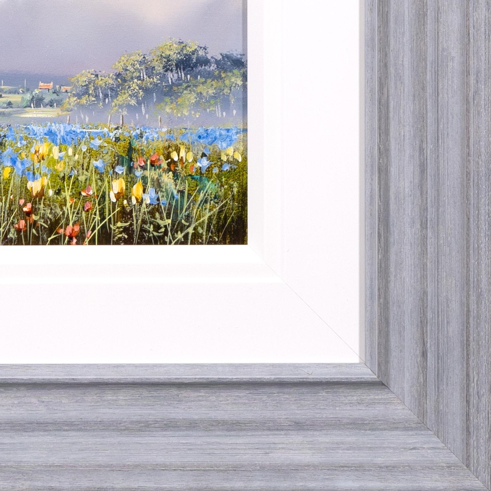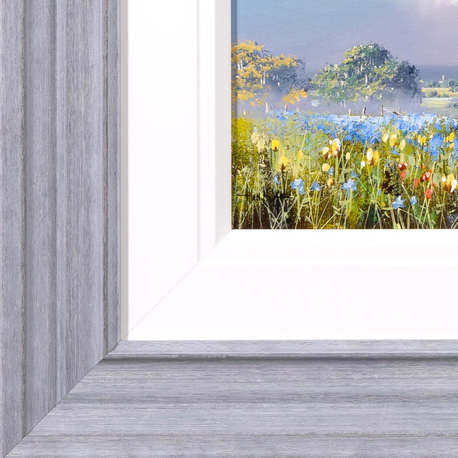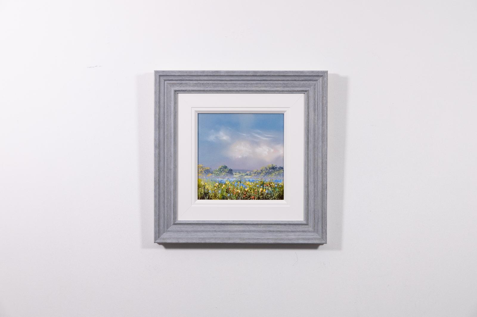 Lovely little meadow landscape painting by celebrated British artist Allan Morgan. Complemented by a wide white slip and grey/blue frame as shown and ready to display on your wall.