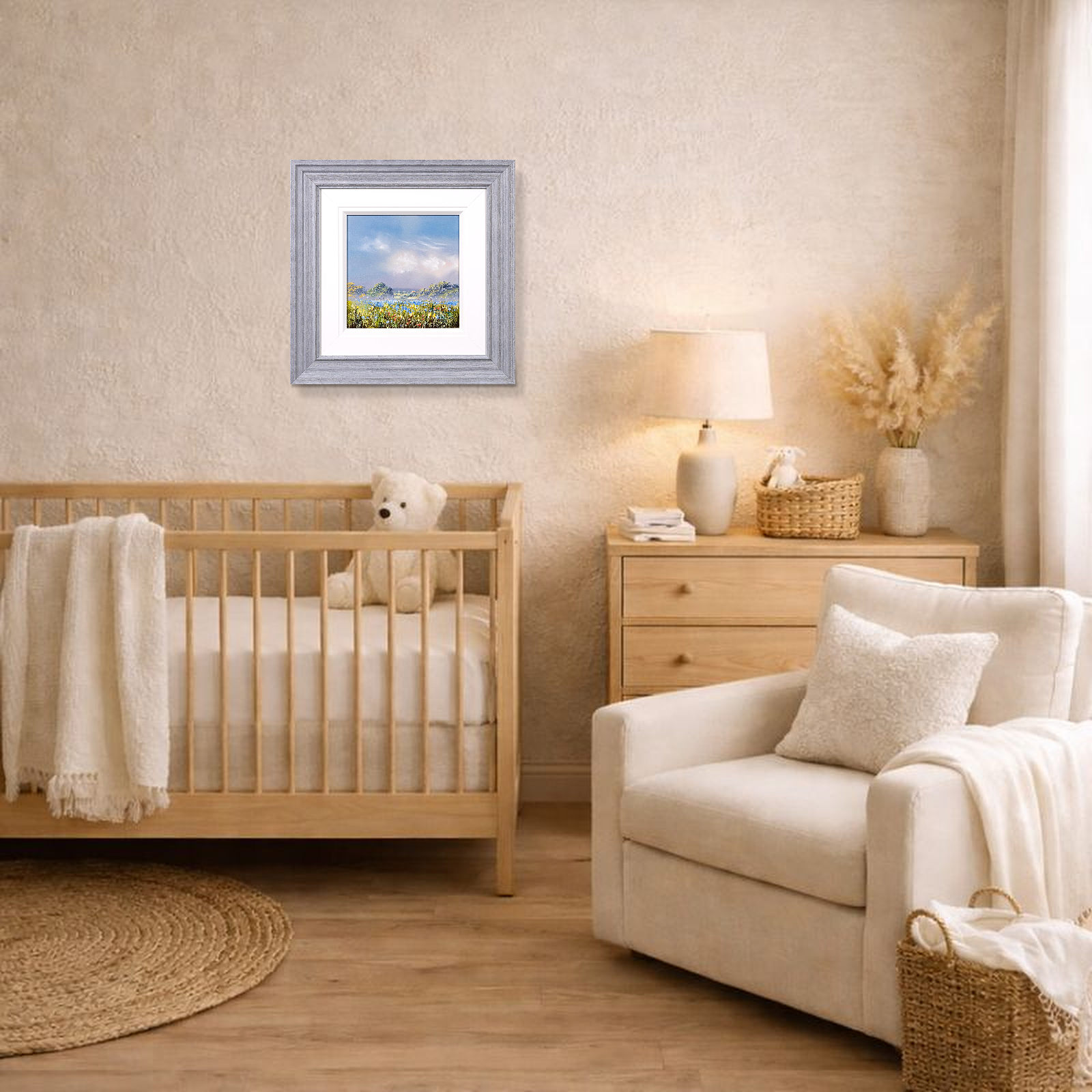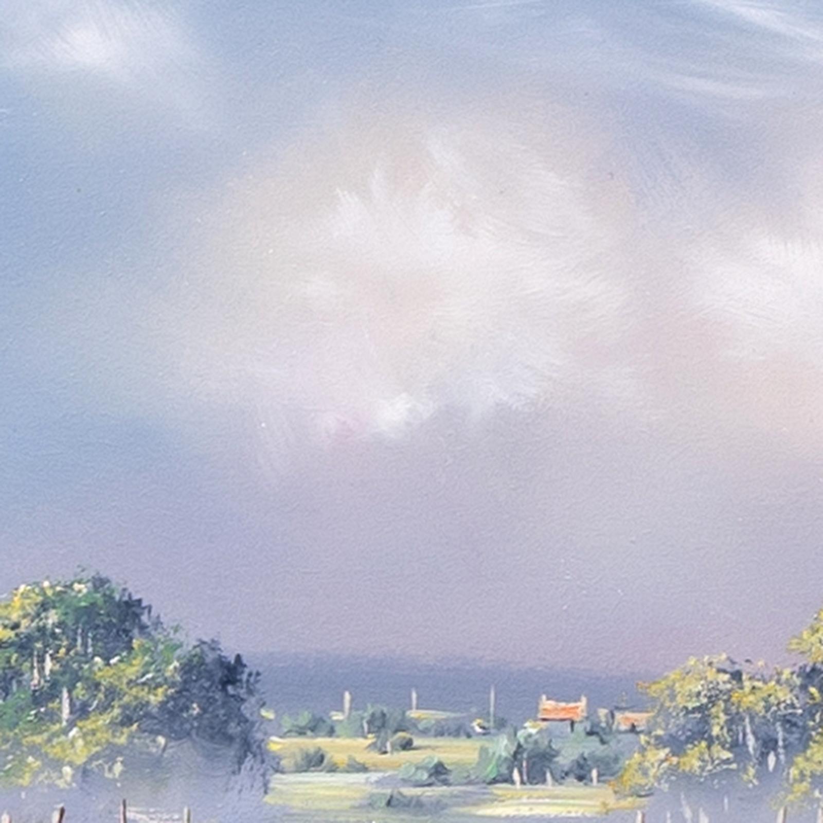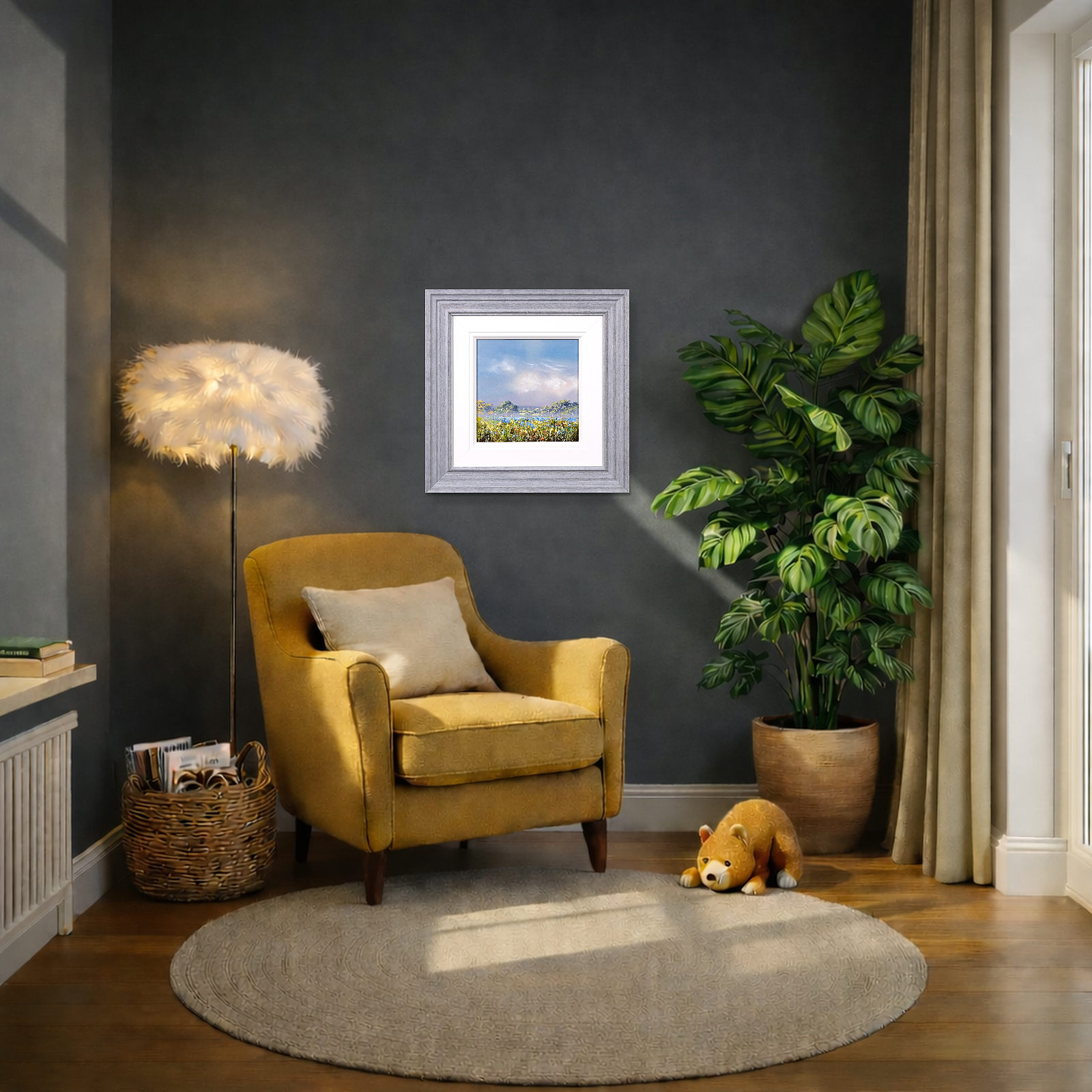 Lovely little meadow landscape painting by celebrated British artist Allan Morgan. Complemented by a wide white slip and grey/blue frame as shown and ready to display on your wall.