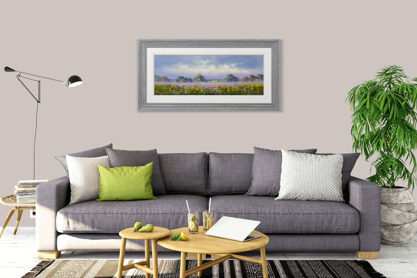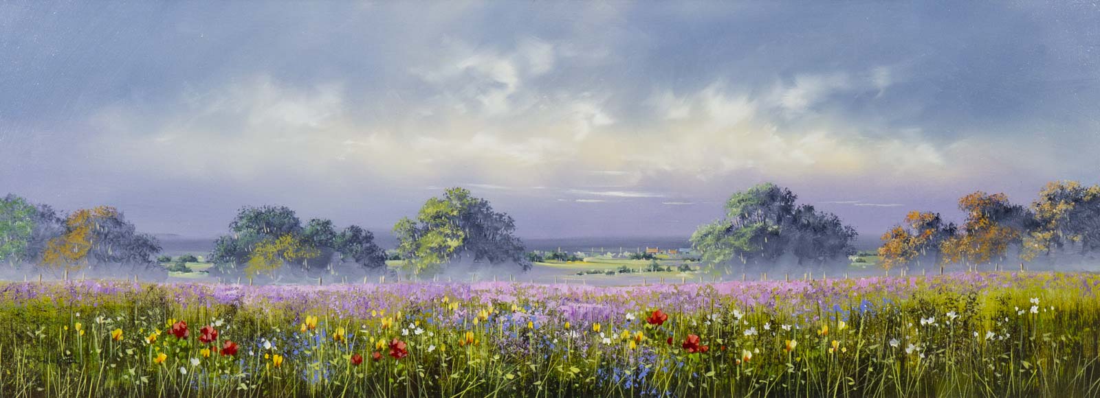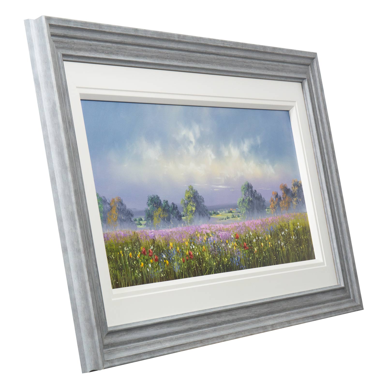 Large meadow landscape painting by celebrated British artist Allan Morgan. Complemented by a wide white slip and grey/blue frame as shown and ready to display on your wall.