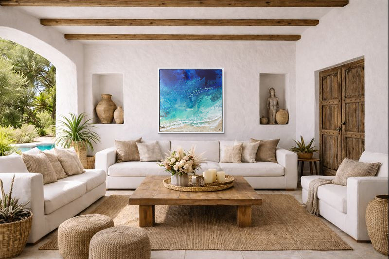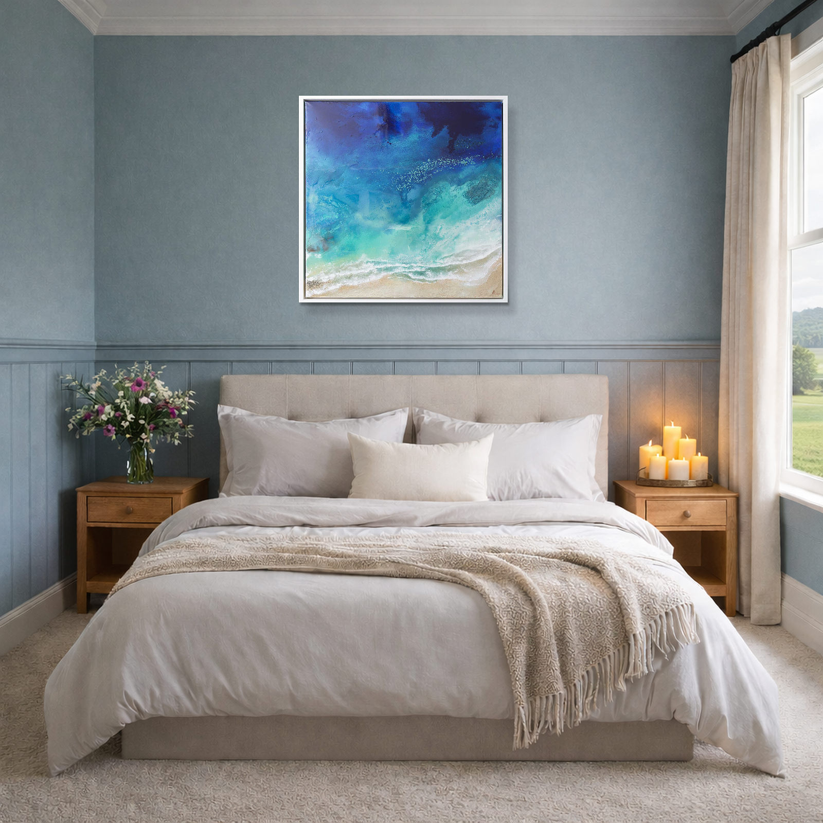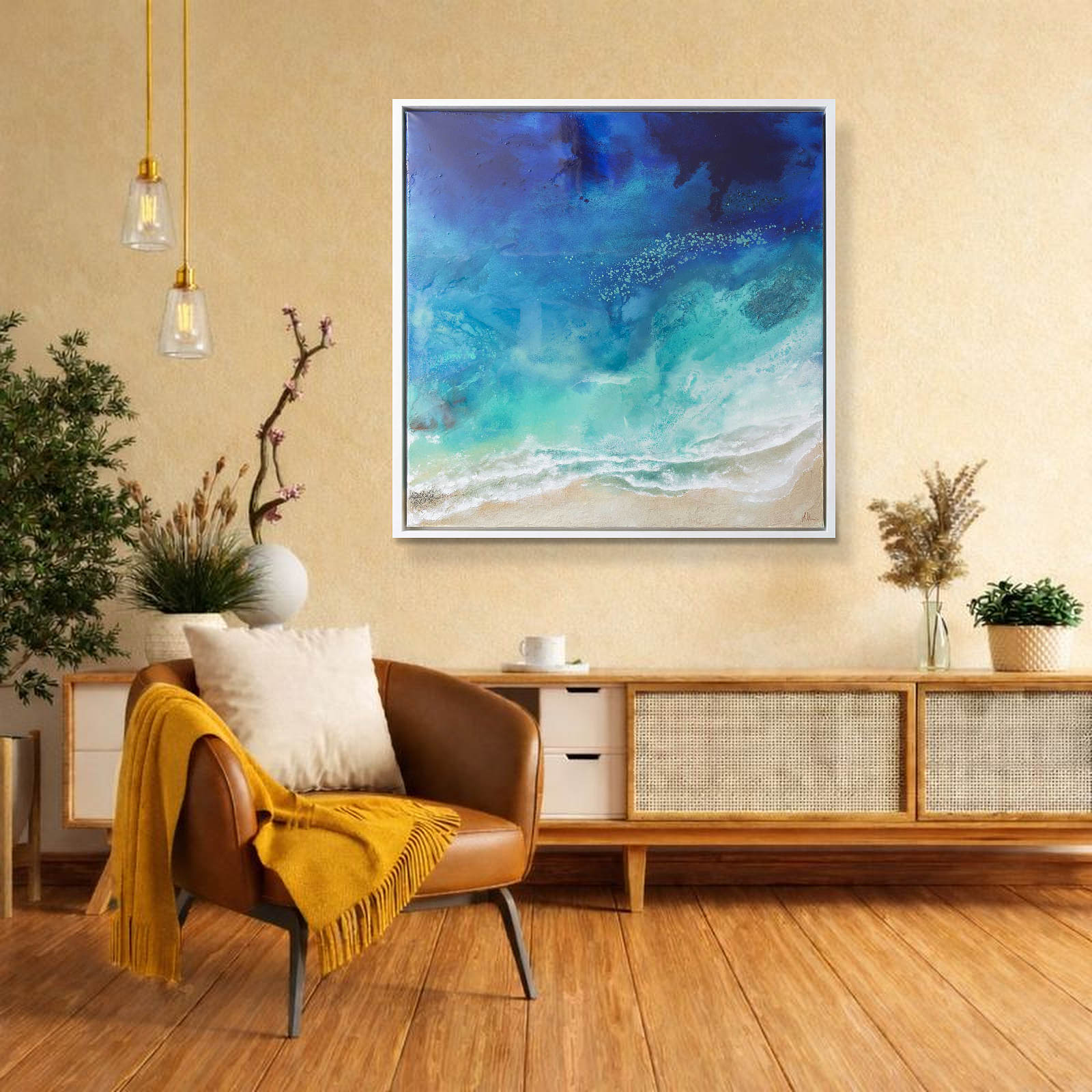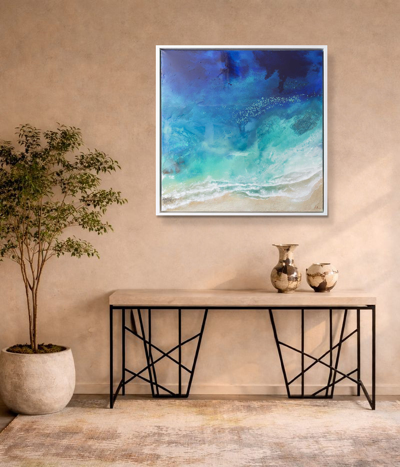 Gorgeous seascape by Spanish artist Ana Ortiz. Ana takes real aerial views of beautiful Spanish beaches and transforms them into stunning artworks using inks, paints, texture and resin. Finished with a contemporary white frame and ready to be a centrepiece in your home.