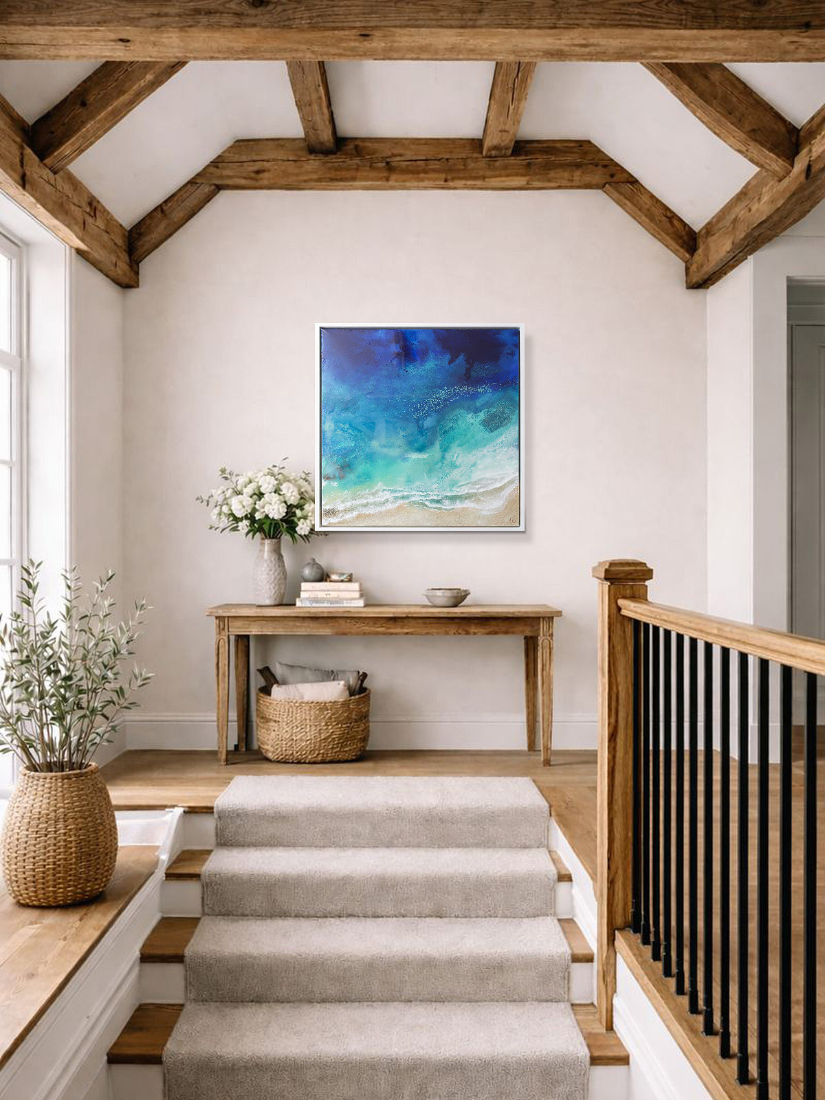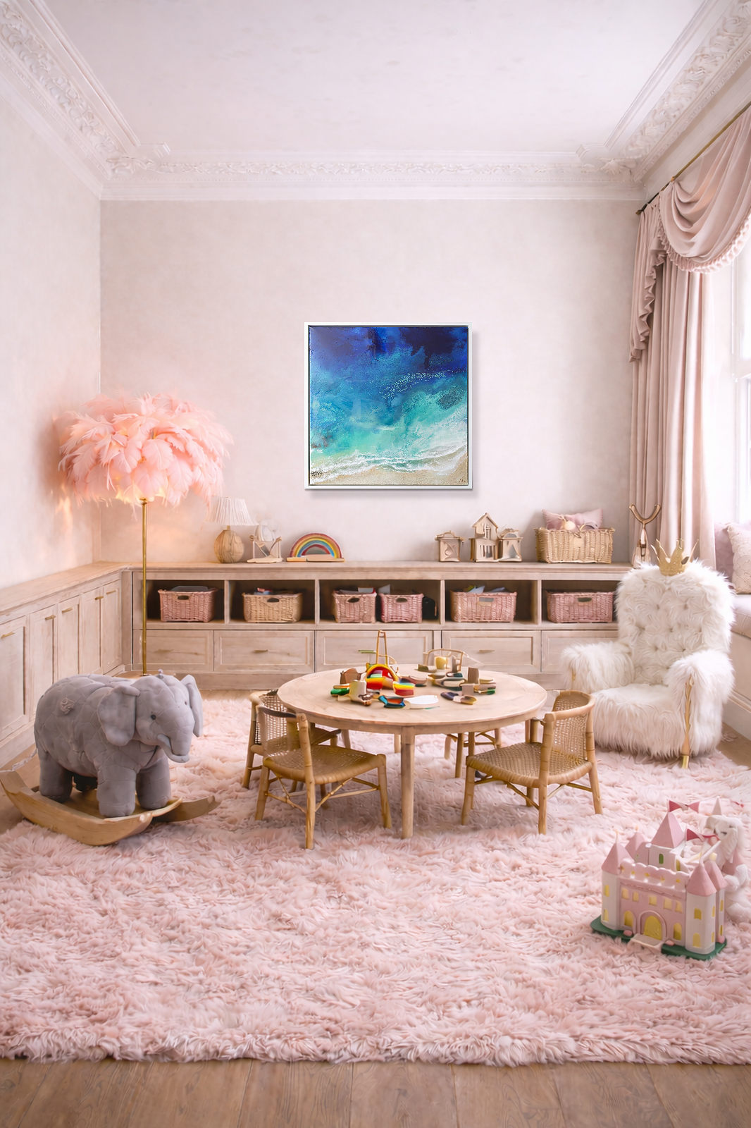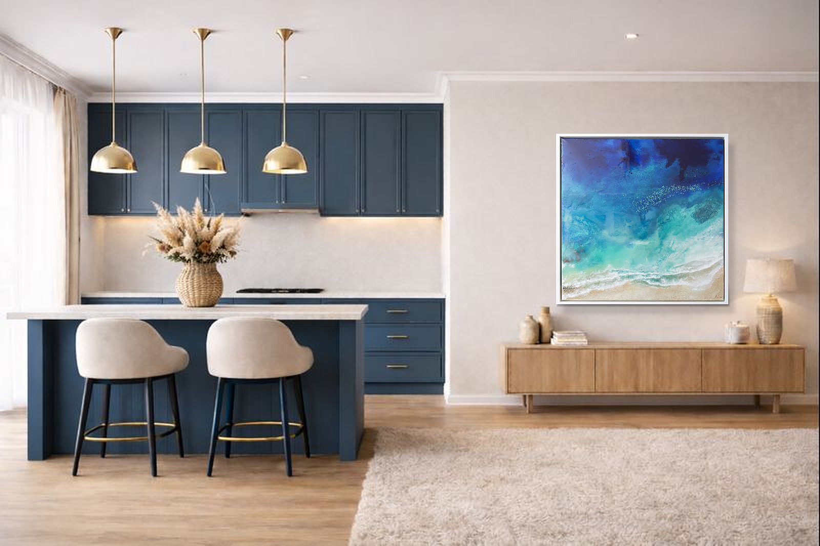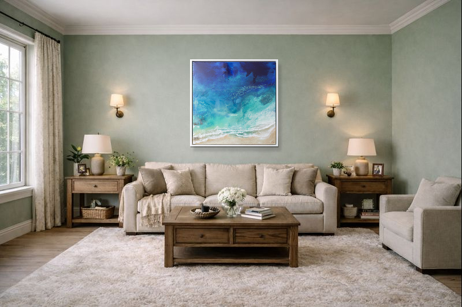 Gorgeous seascape by Spanish artist Ana Ortiz. Ana takes real aerial views of beautiful Spanish beaches and transforms them into stunning artworks using inks, paints, texture and resin. Finished with a contemporary white frame and ready to be a centrepiece in your home.