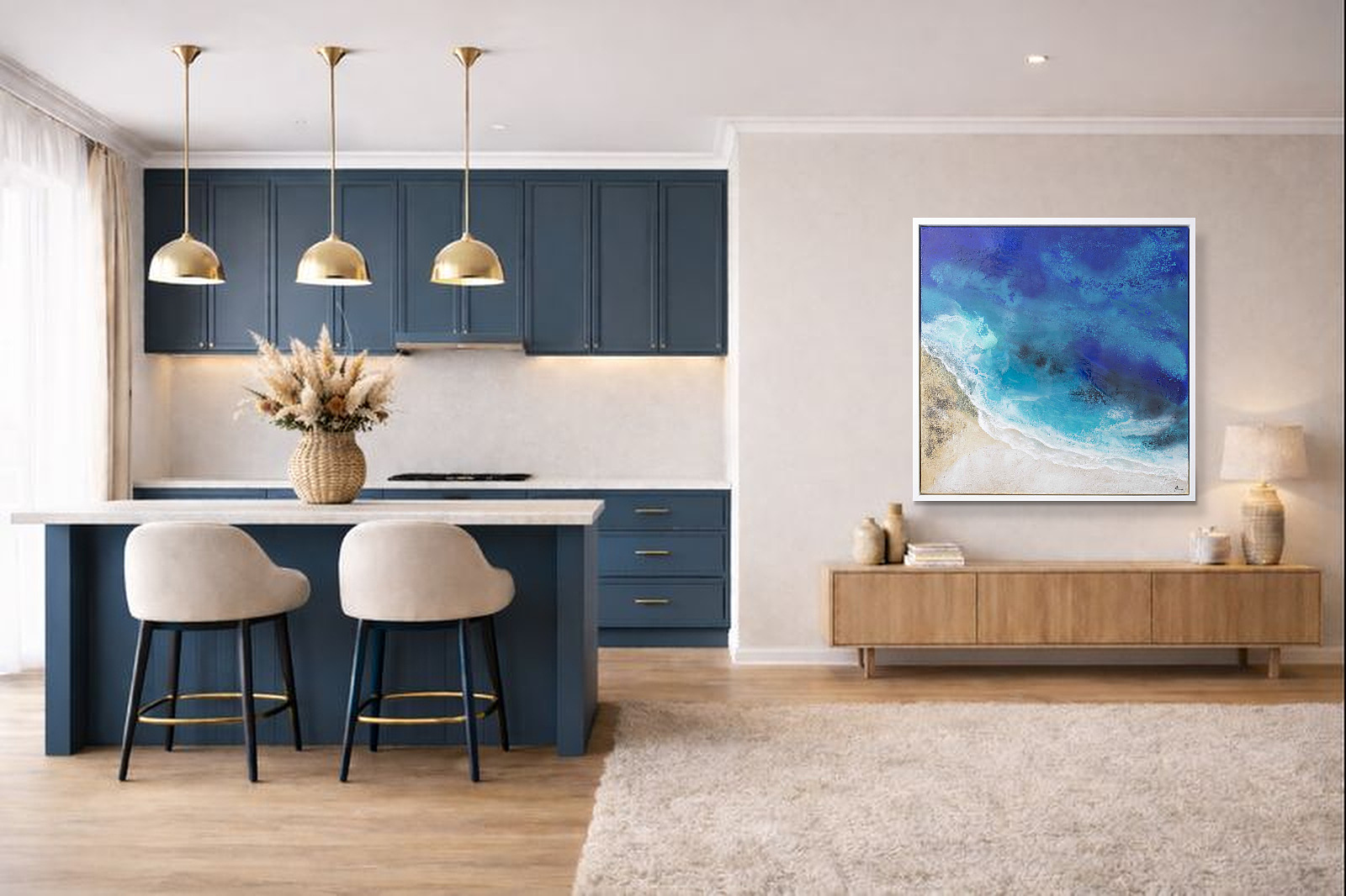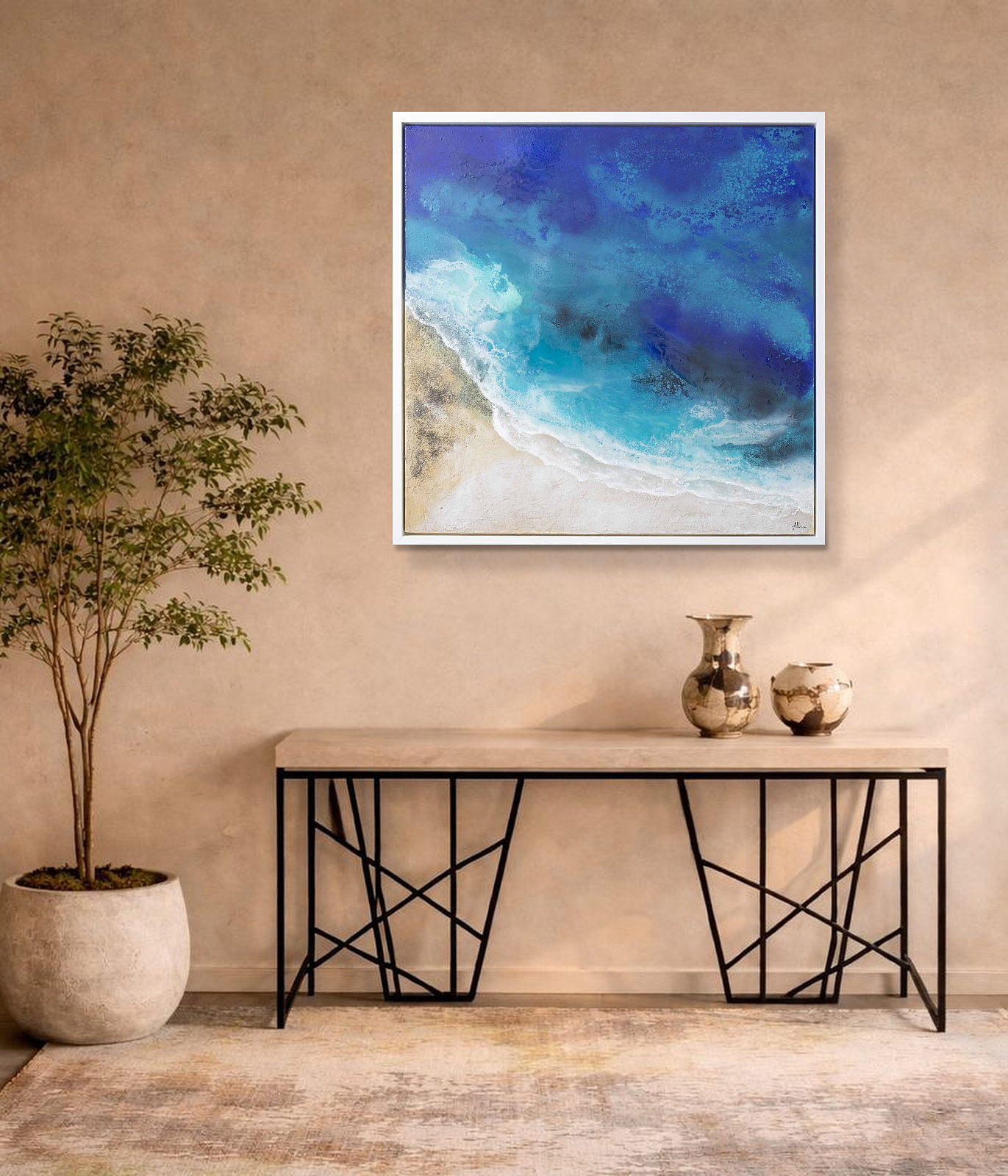Gorgeous seascape by Spanish artist Ana Ortiz. Ana takes real aerial views of beautiful Spanish beaches and transforms them into stunning artworks using inks, paints, texture and resin. Finished with a contemporary white frame and ready to be a centrepiece in your home.