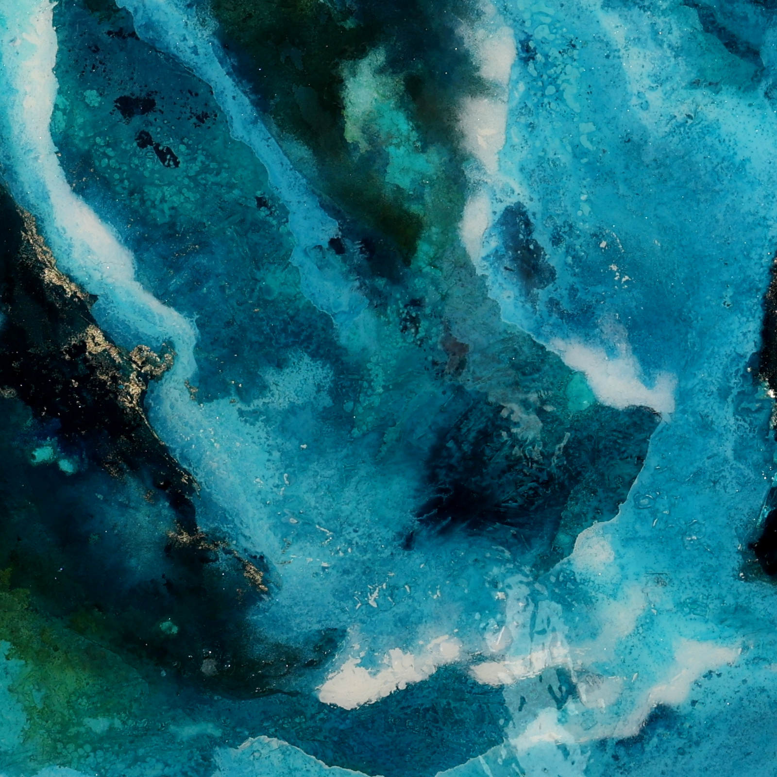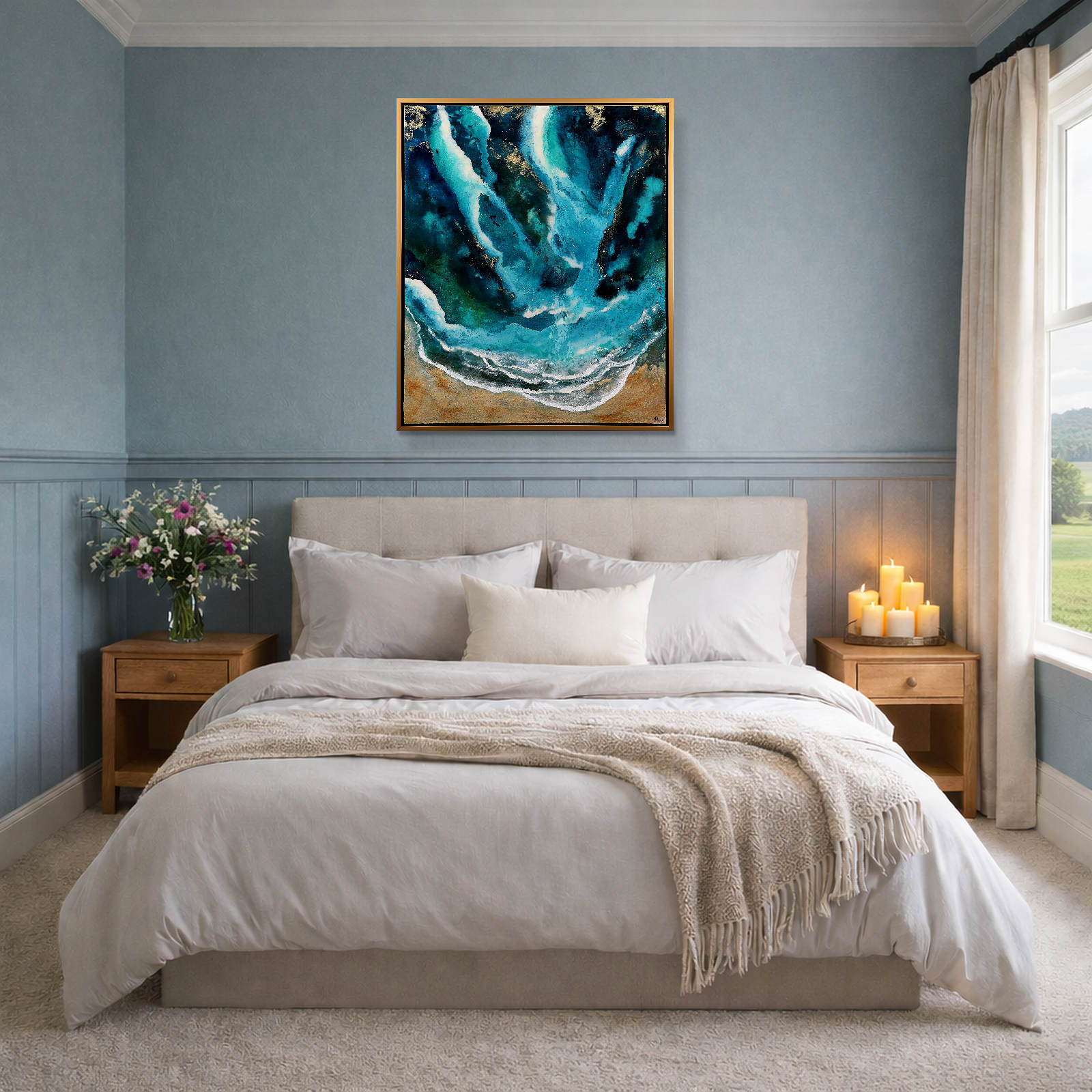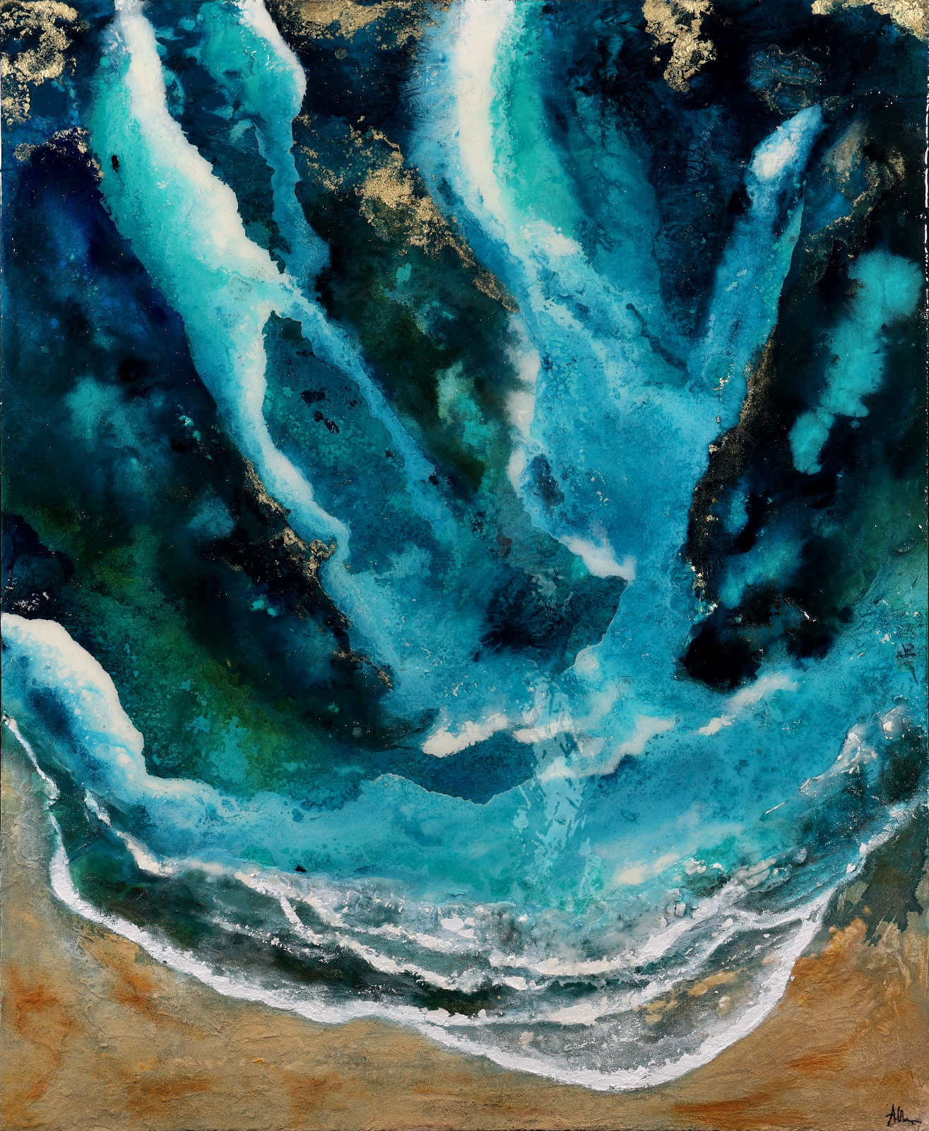 Stunning contemporary coastal painting by Ana Ortiz. This artwork is made of mixed media and resin on wood panel and presented in a contemporary gold frame as shown and ready to hang.