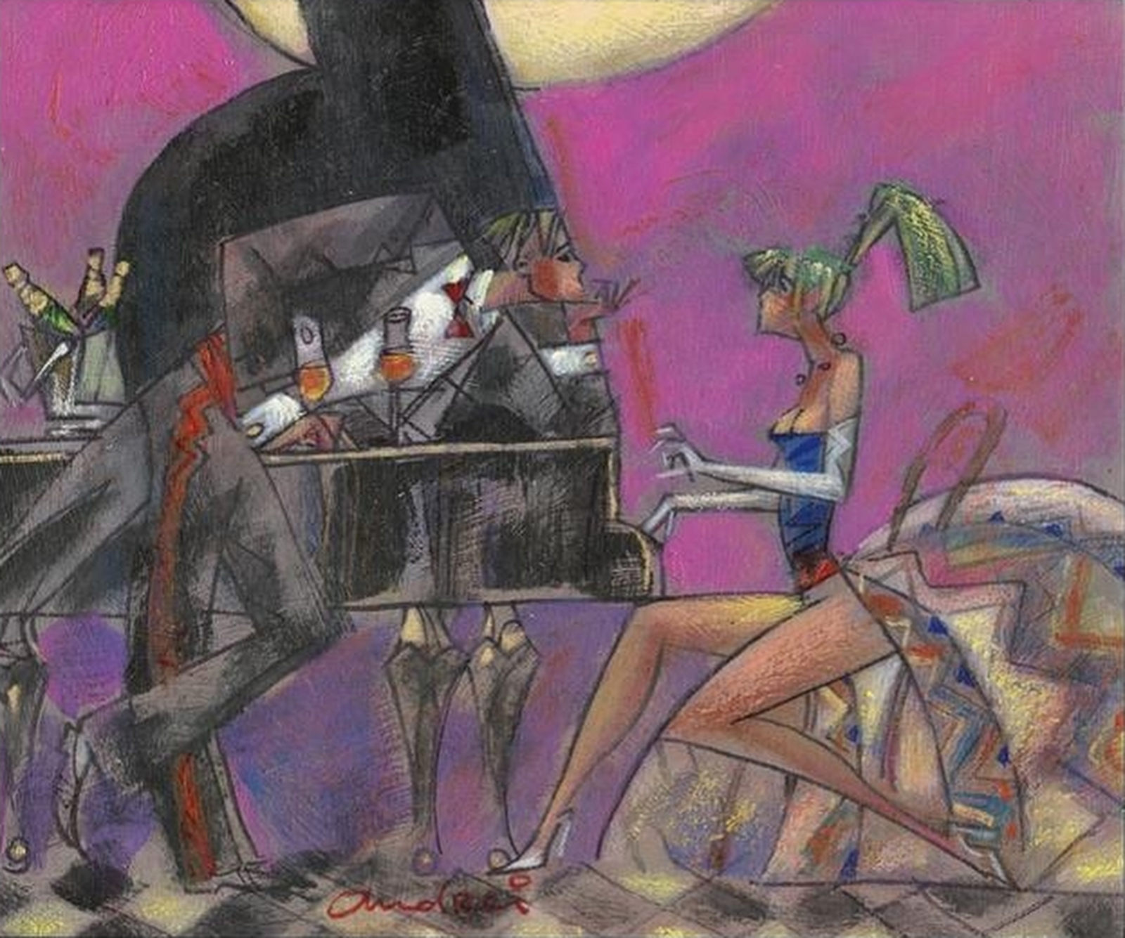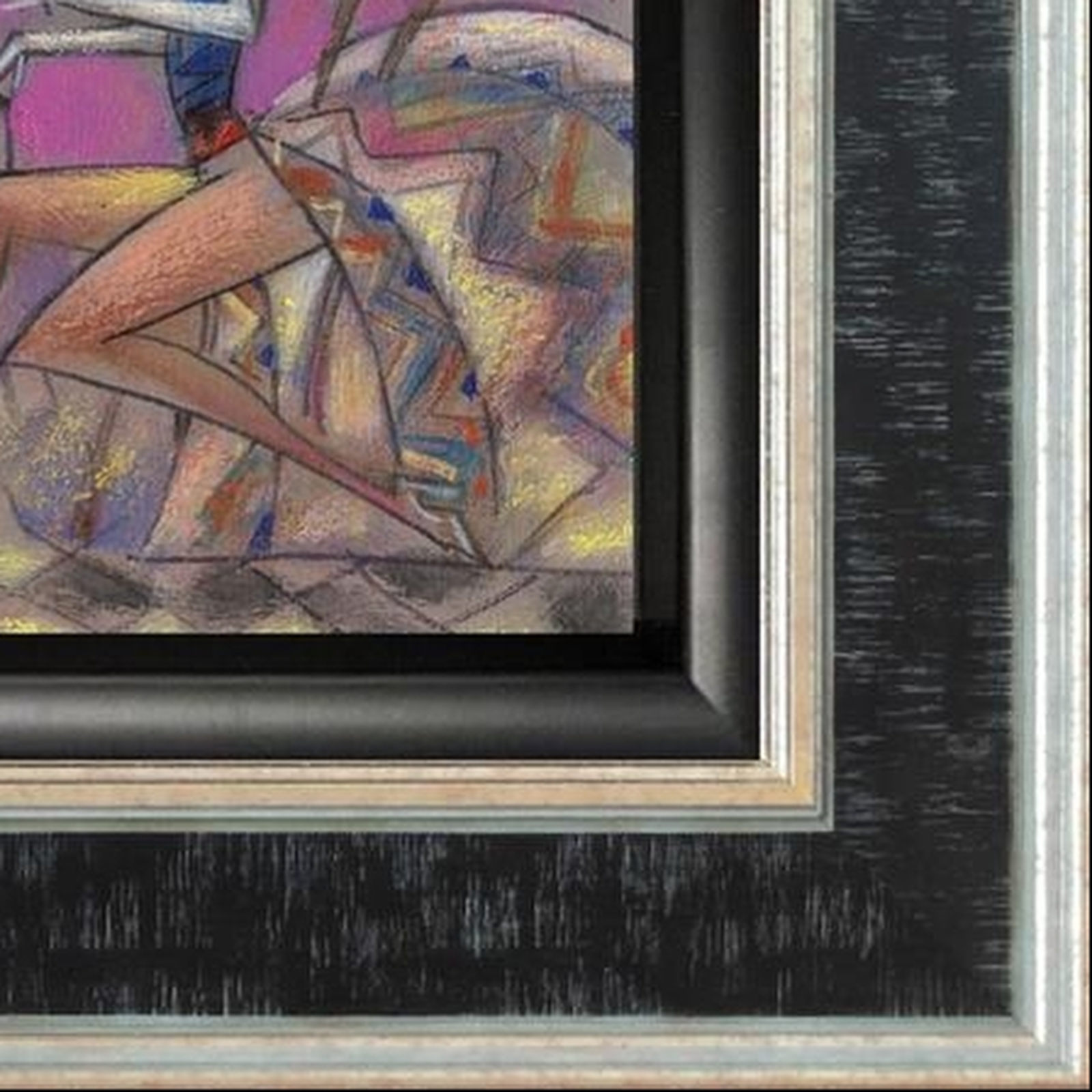 A beautiful limited edition of this quirky Venetian love scene. Signed and numbered by the artist, each edition is hand embellished and enhanced with paints and varnishes giving a wonderful painterly finish and rendering every print subtly unique and akin to an original. Provided with a certificate of authenticity and framed with an off-white slip and rustic black and silver finished frame as shown.