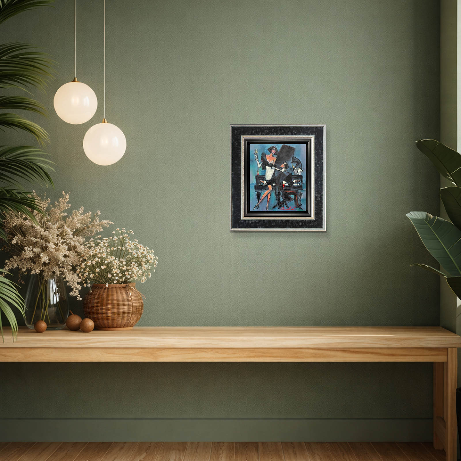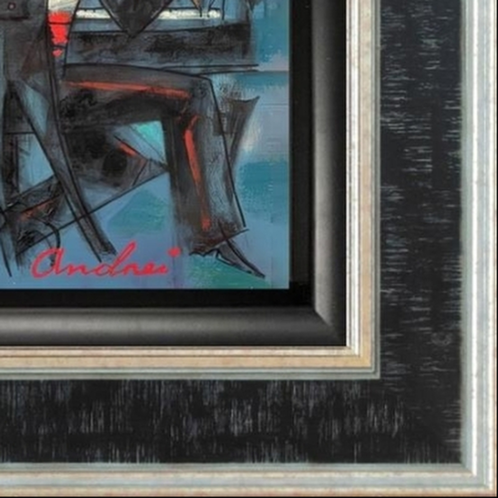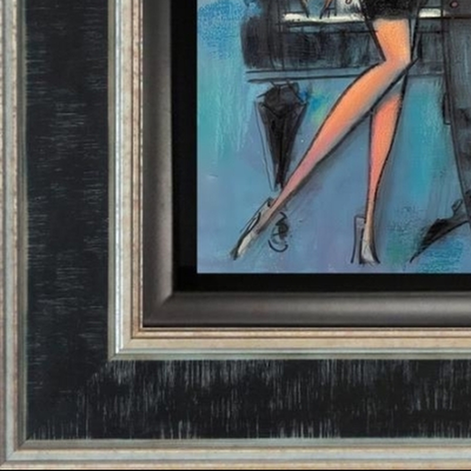 A beautiful limited edition of this quirky Venetian love scene. Signed and numbered by the artist, each edition is hand embellished and enhanced with paints and varnishes giving a wonderful painterly finish and rendering every print subtly unique and akin to an original. Provided with a certificate of authenticity and framed with an off-white slip and rustic black and silver finished frame as shown.