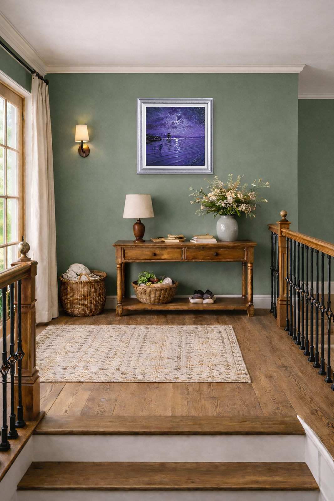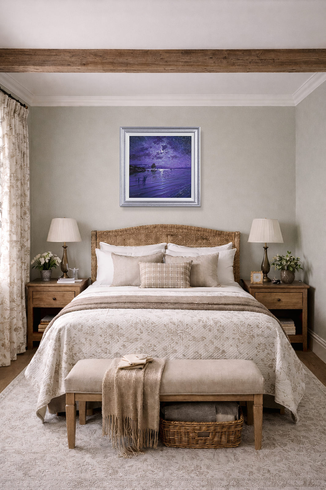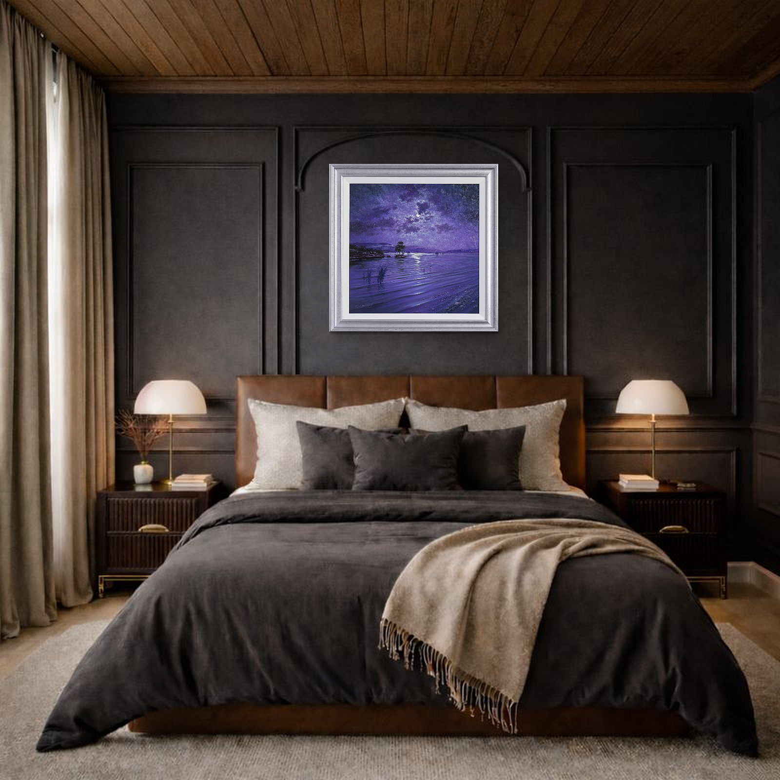 Calming lakeside scene in a subdued cool palette by the talented artist Andrew Grant Kurtis. Framed with a white slip and silver finish frame as shown and ready to hang.
