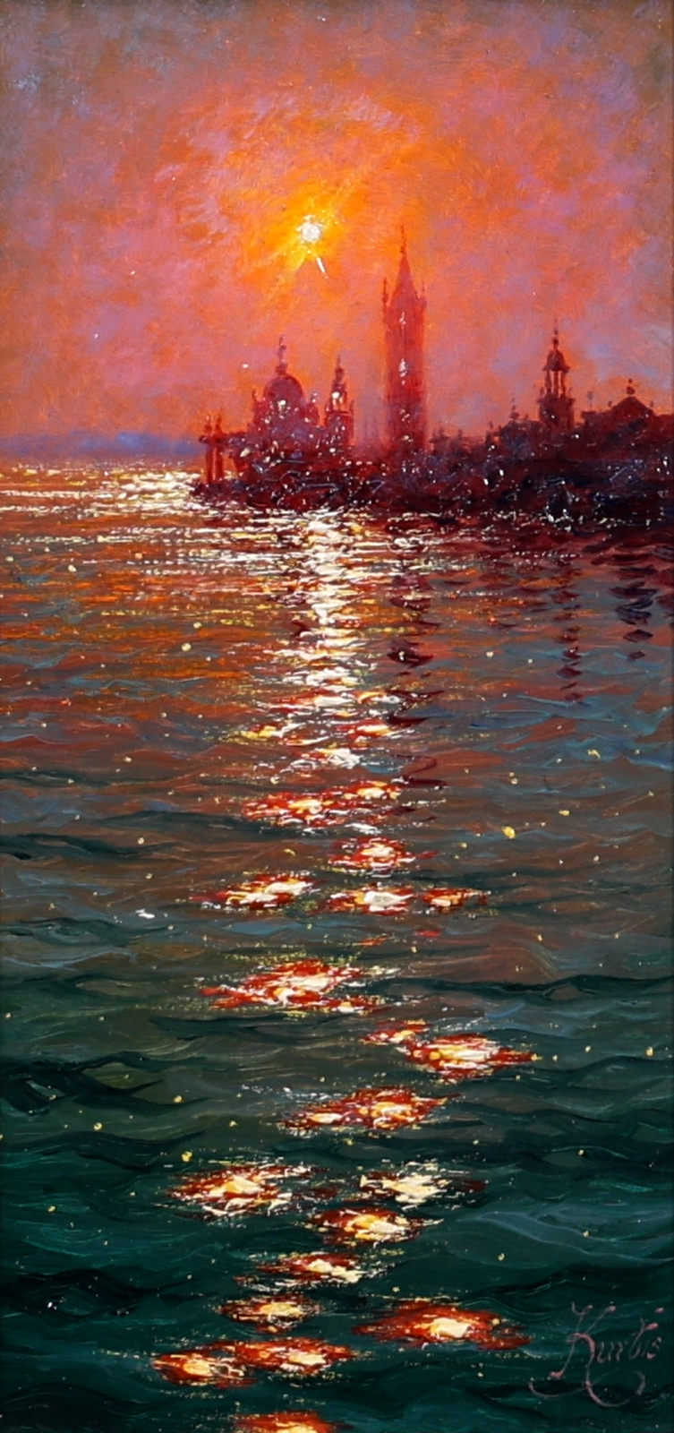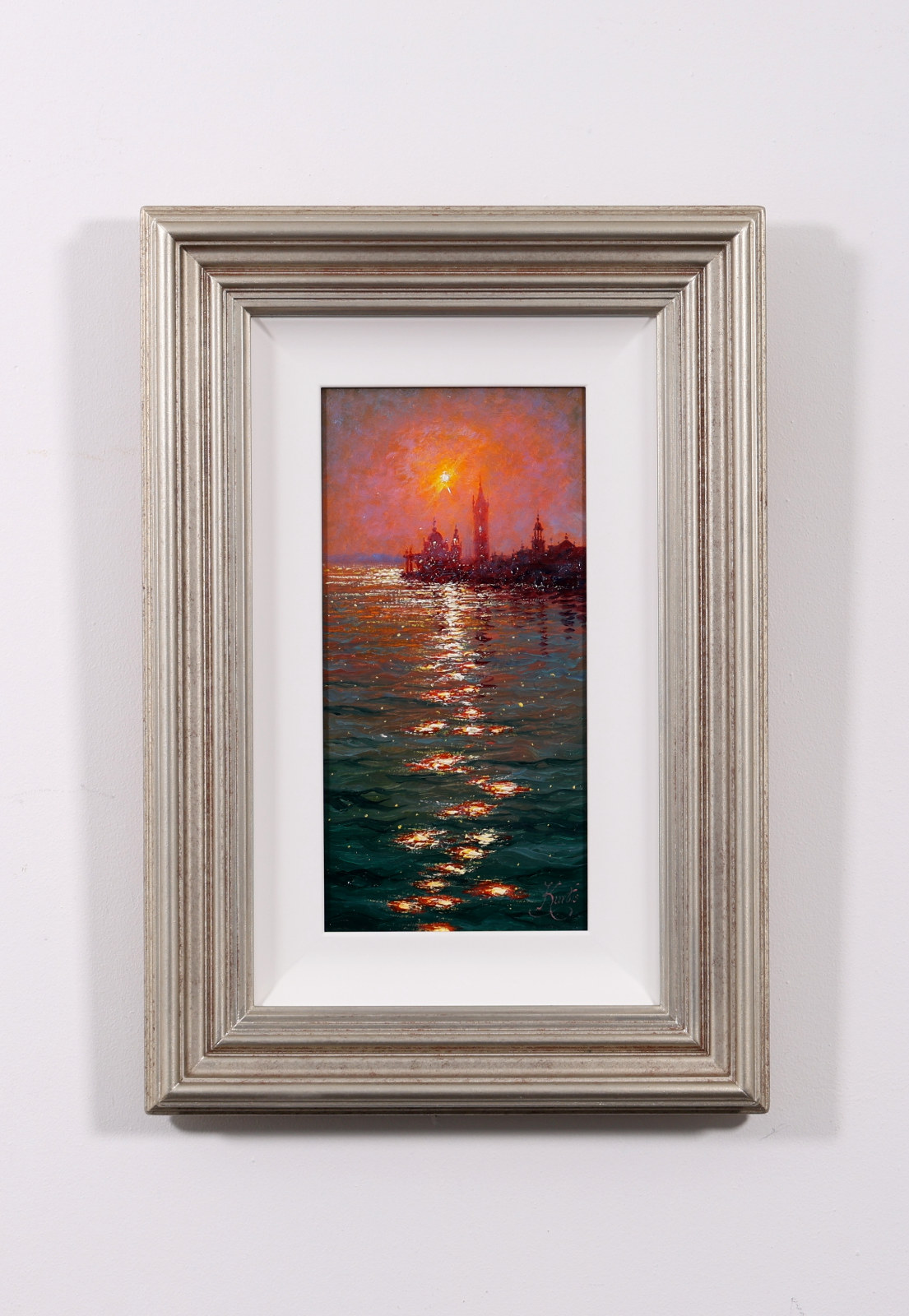 A glowing depiction of Venice by Andrew Grant Kurtis, capturing the warm light of evening reflected across gently rippling water. This original oil painting is presented framed with a white slip and complementary moulding as shown and ready to hang.