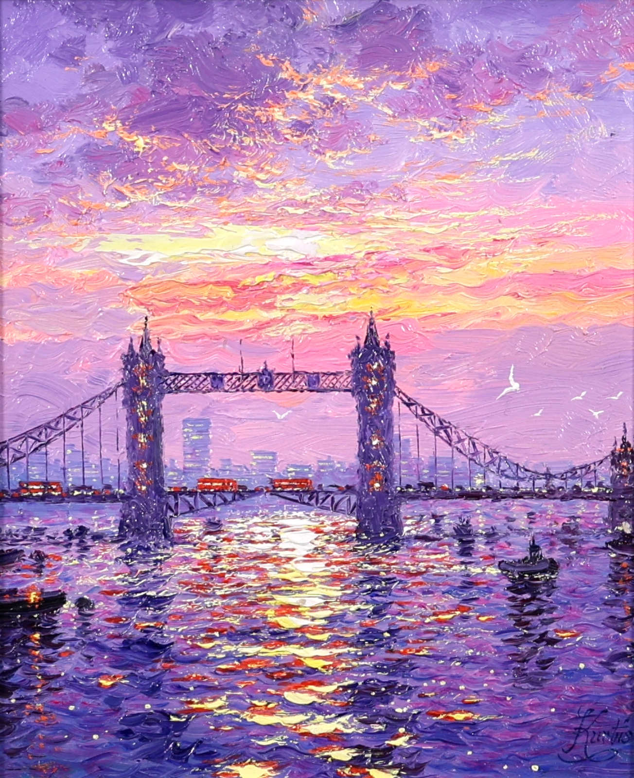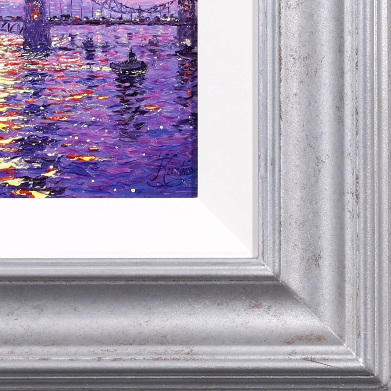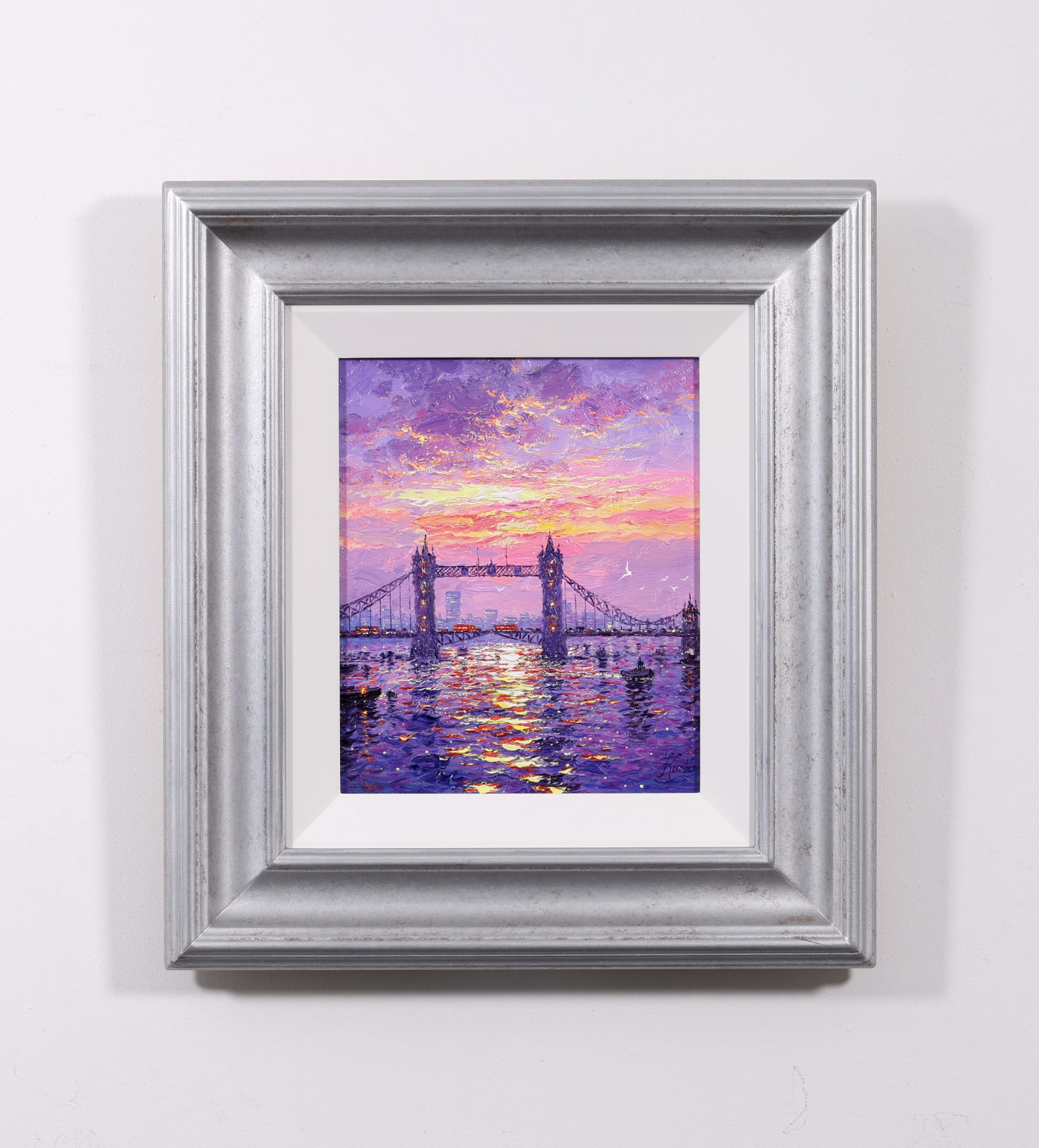 A radiant view of Tower Bridge by Andrew Grant Kurtis, bathed in warm sunlight and reflected beautifully across the Thames. This original oil painting is presented framed with a white slip and distressed silver-tone frame as shown and ready to hang.