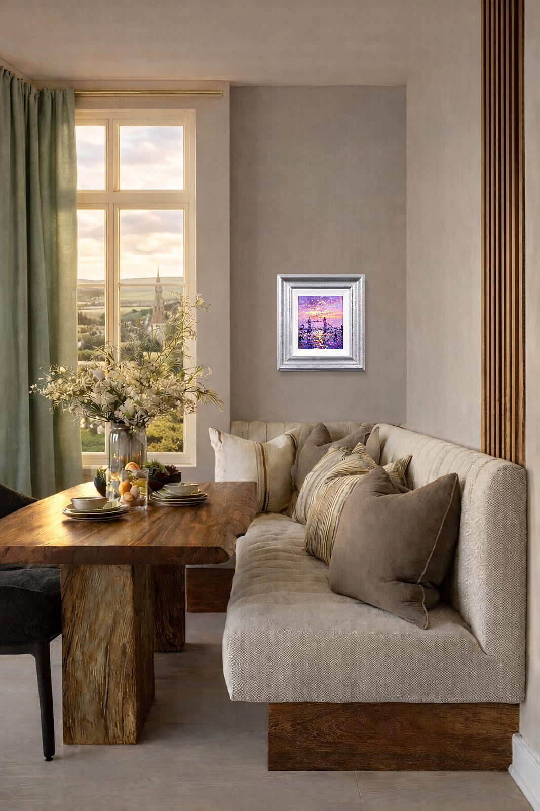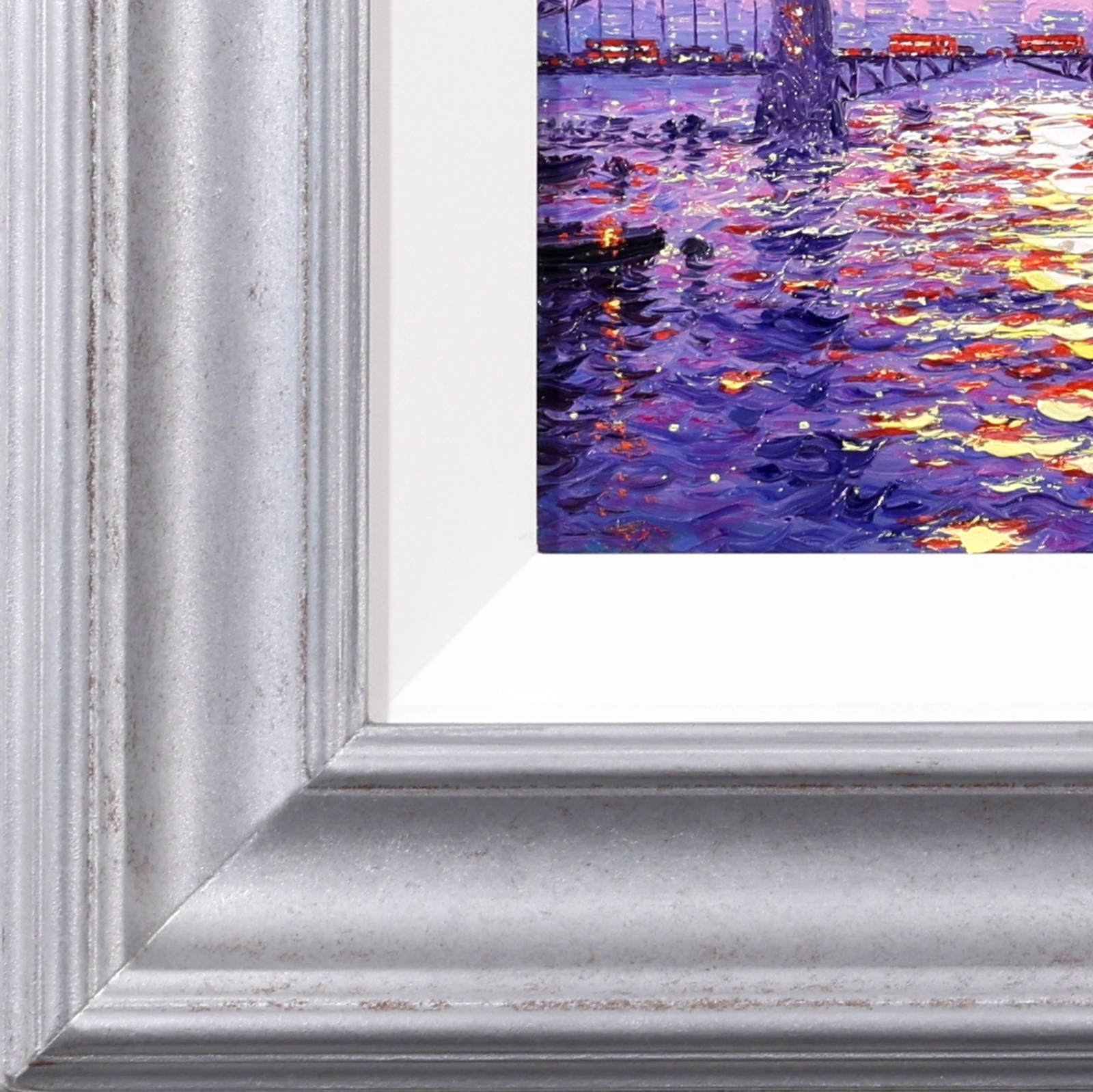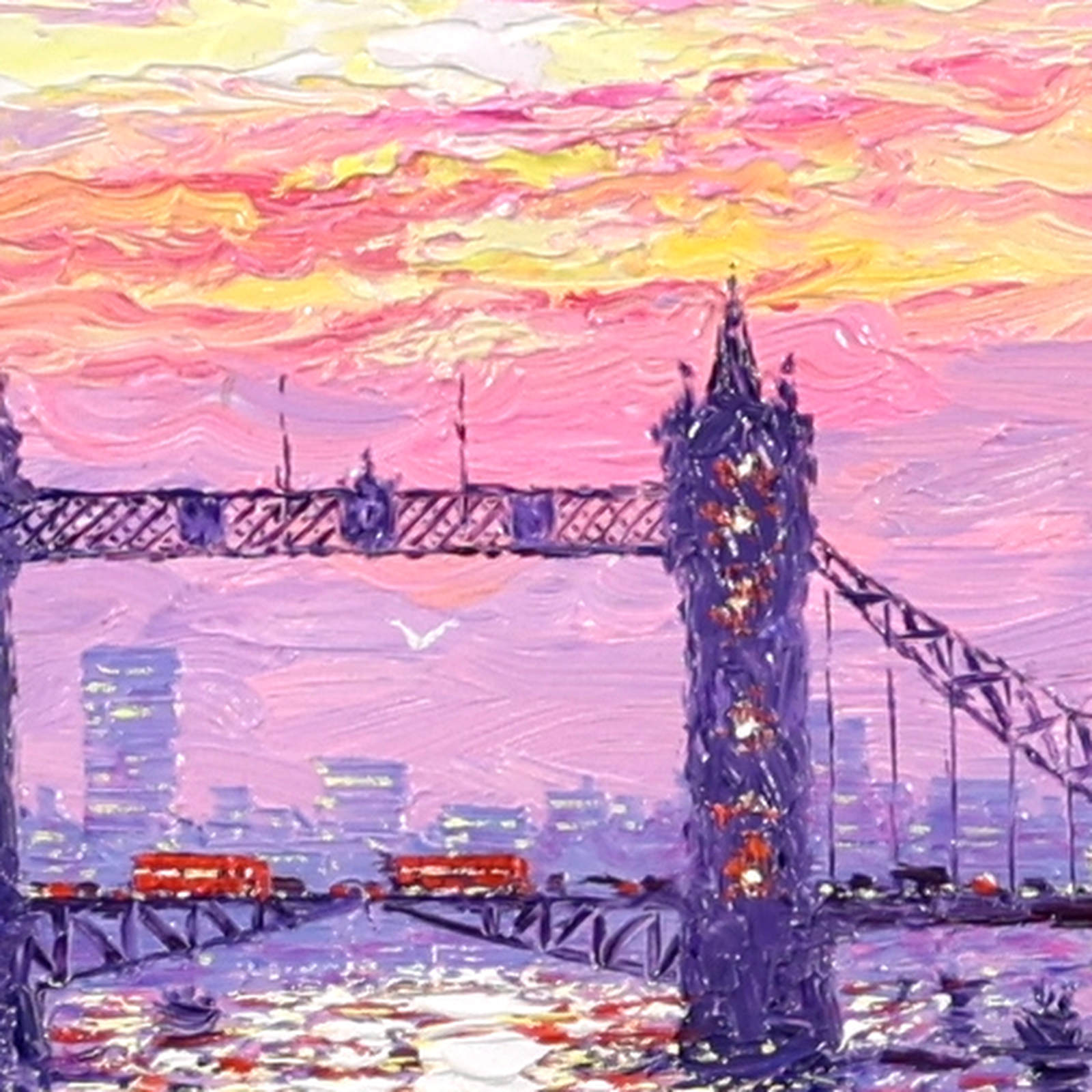 A radiant view of Tower Bridge by Andrew Grant Kurtis, bathed in warm sunlight and reflected beautifully across the Thames. This original oil painting is presented framed with a white slip and distressed silver-tone frame as shown and ready to hang.