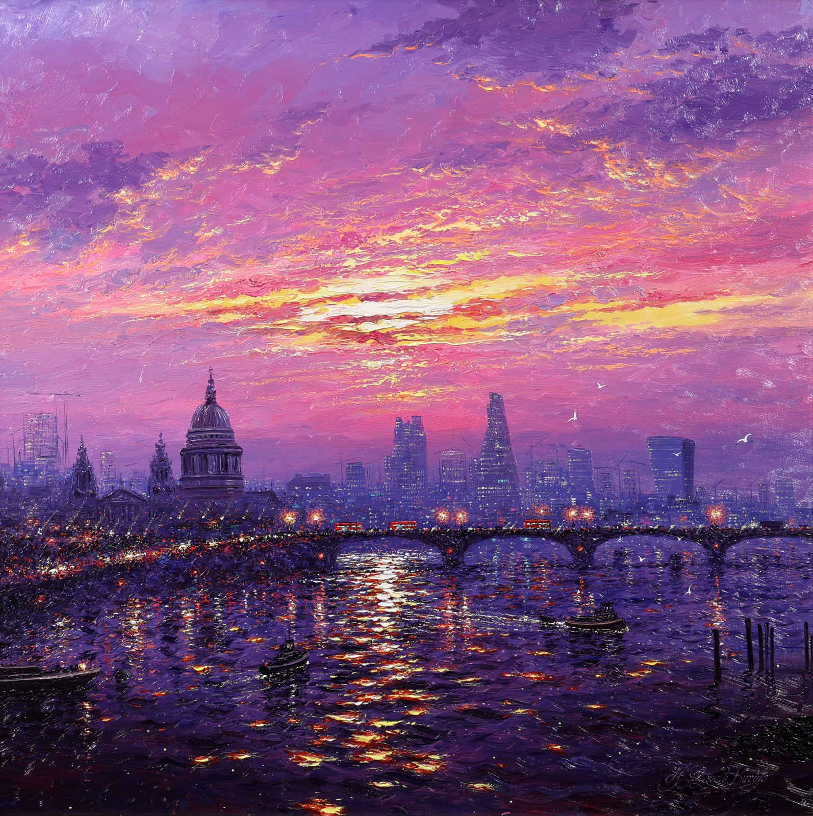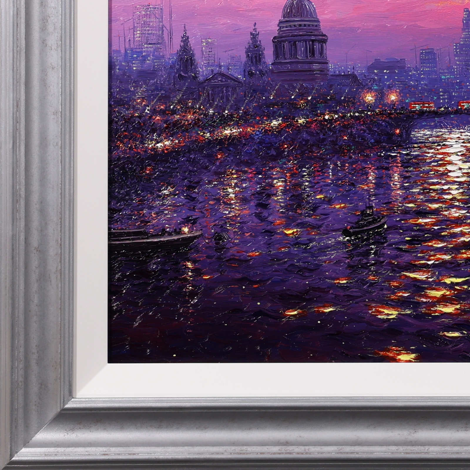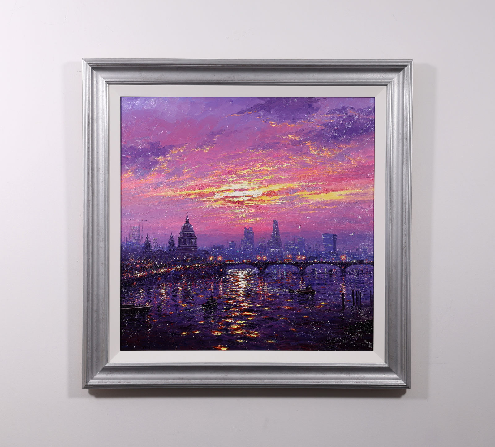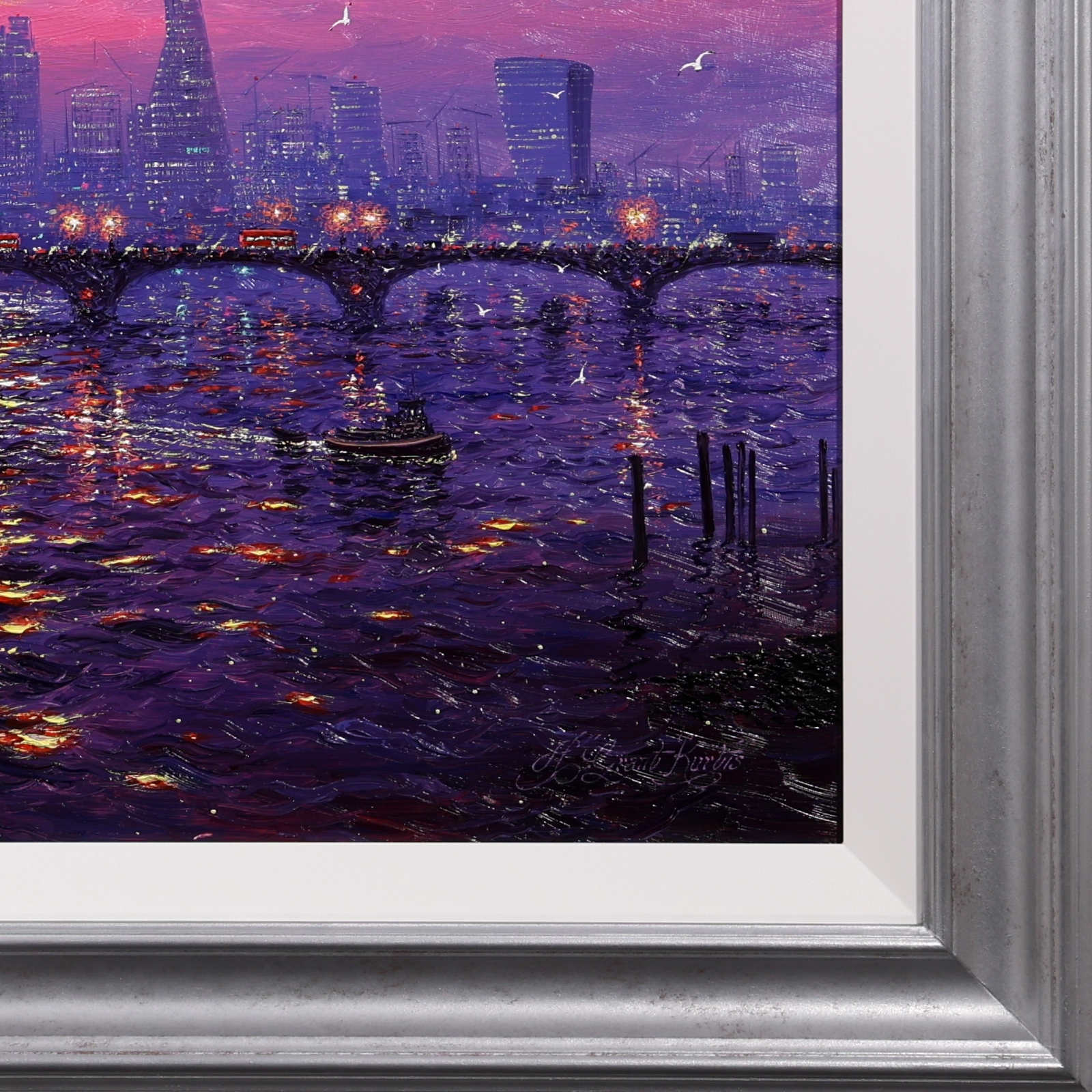 A stunning statement piece and London panorama by Andrew Grant Kurtis, filled with glowing colour and shimmering reflections beneath a dramatic sky. This original oil painting is presented framed with a white slip and distressed silver-tone frame as shown and ready to hang.