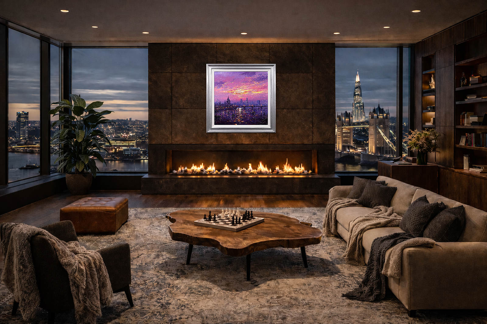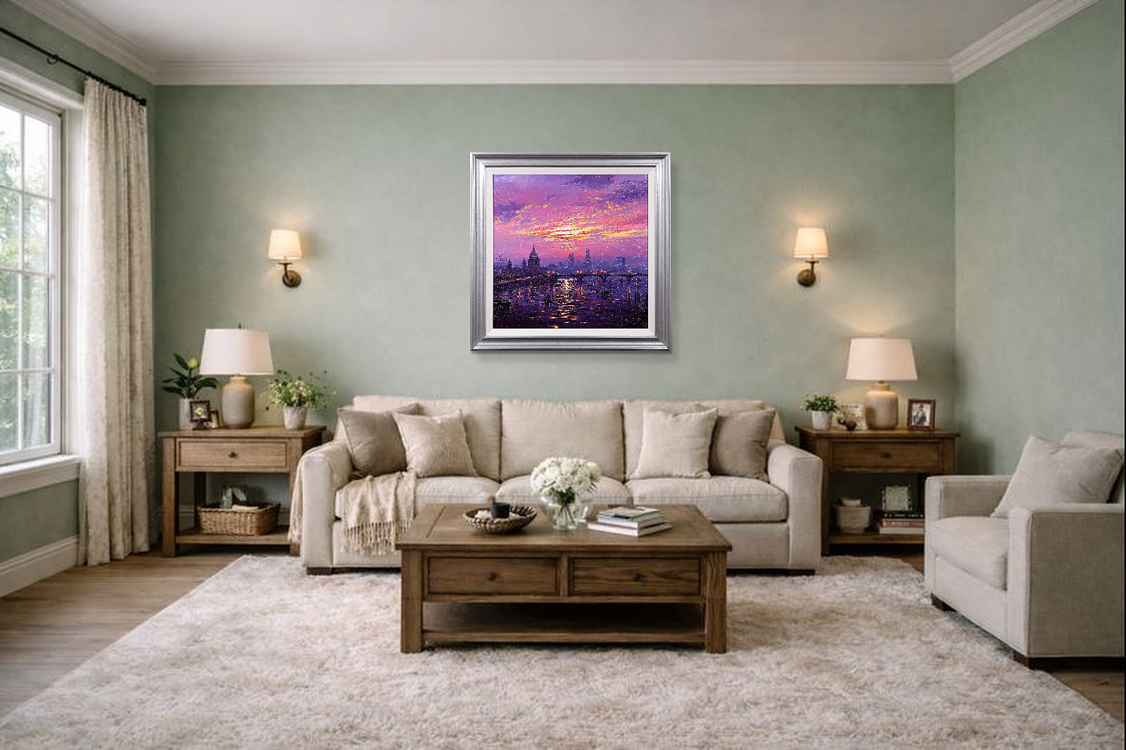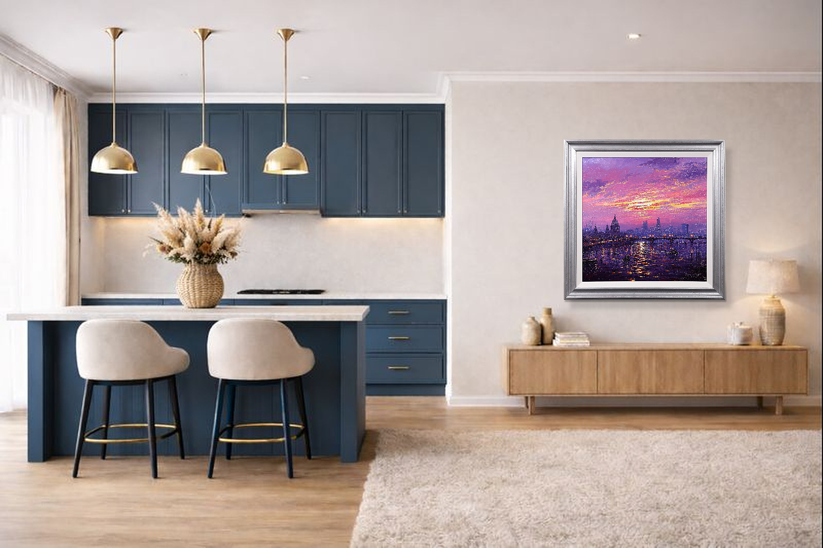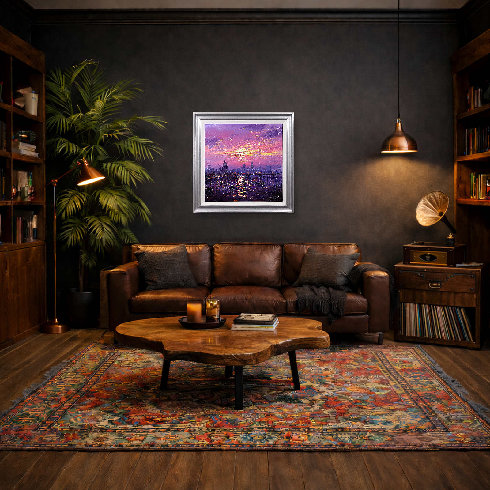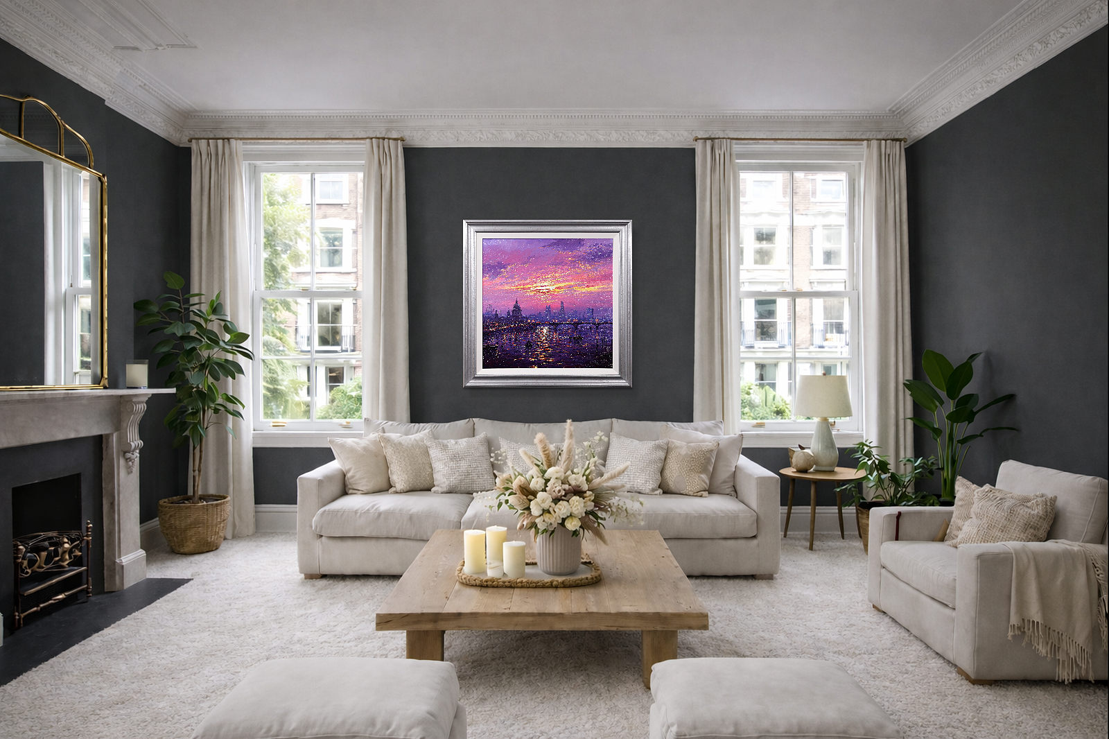 A stunning statement piece and London panorama by Andrew Grant Kurtis, filled with glowing colour and shimmering reflections beneath a dramatic sky. This original oil painting is presented framed with a white slip and distressed silver-tone frame as shown and ready to hang.