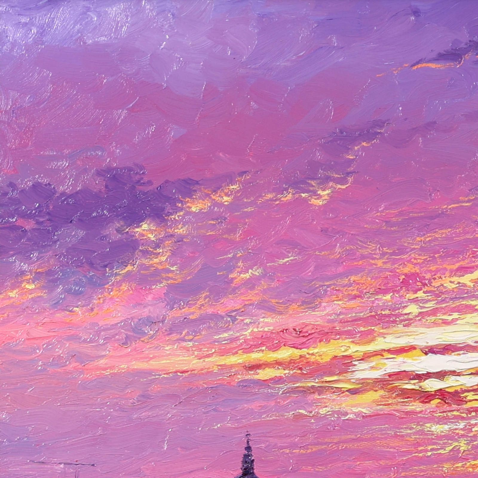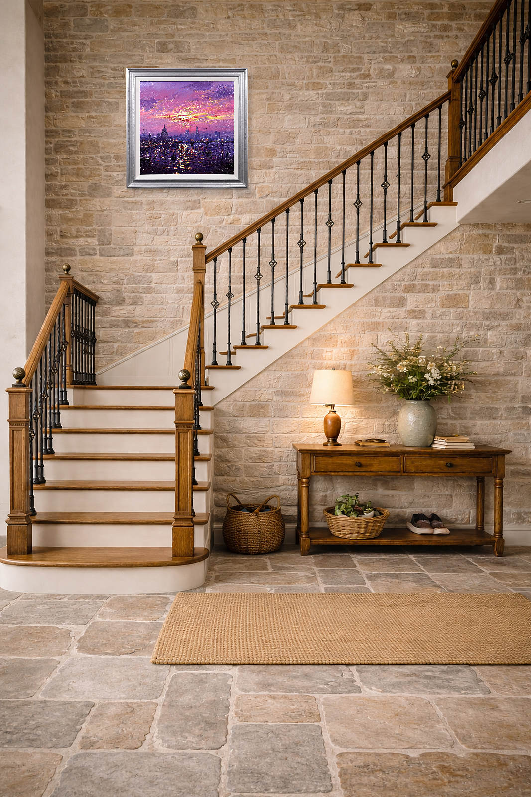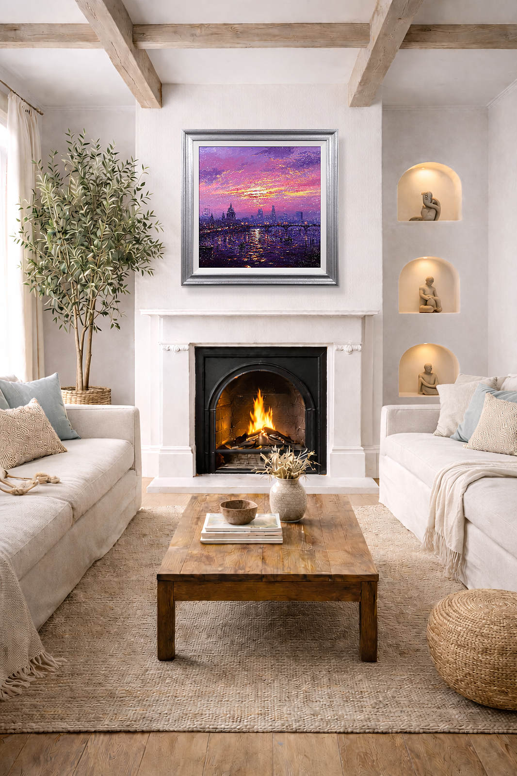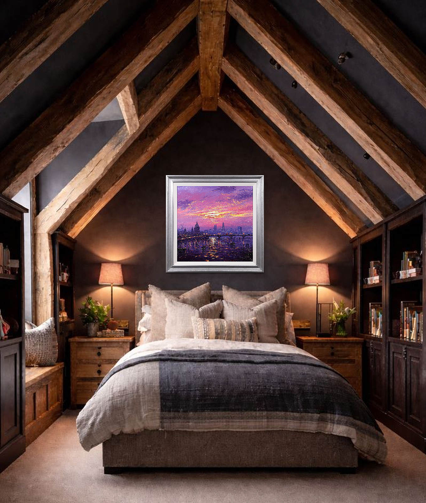 A stunning statement piece and London panorama by Andrew Grant Kurtis, filled with glowing colour and shimmering reflections beneath a dramatic sky. This original oil painting is presented framed with a white slip and distressed silver-tone frame as shown and ready to hang.