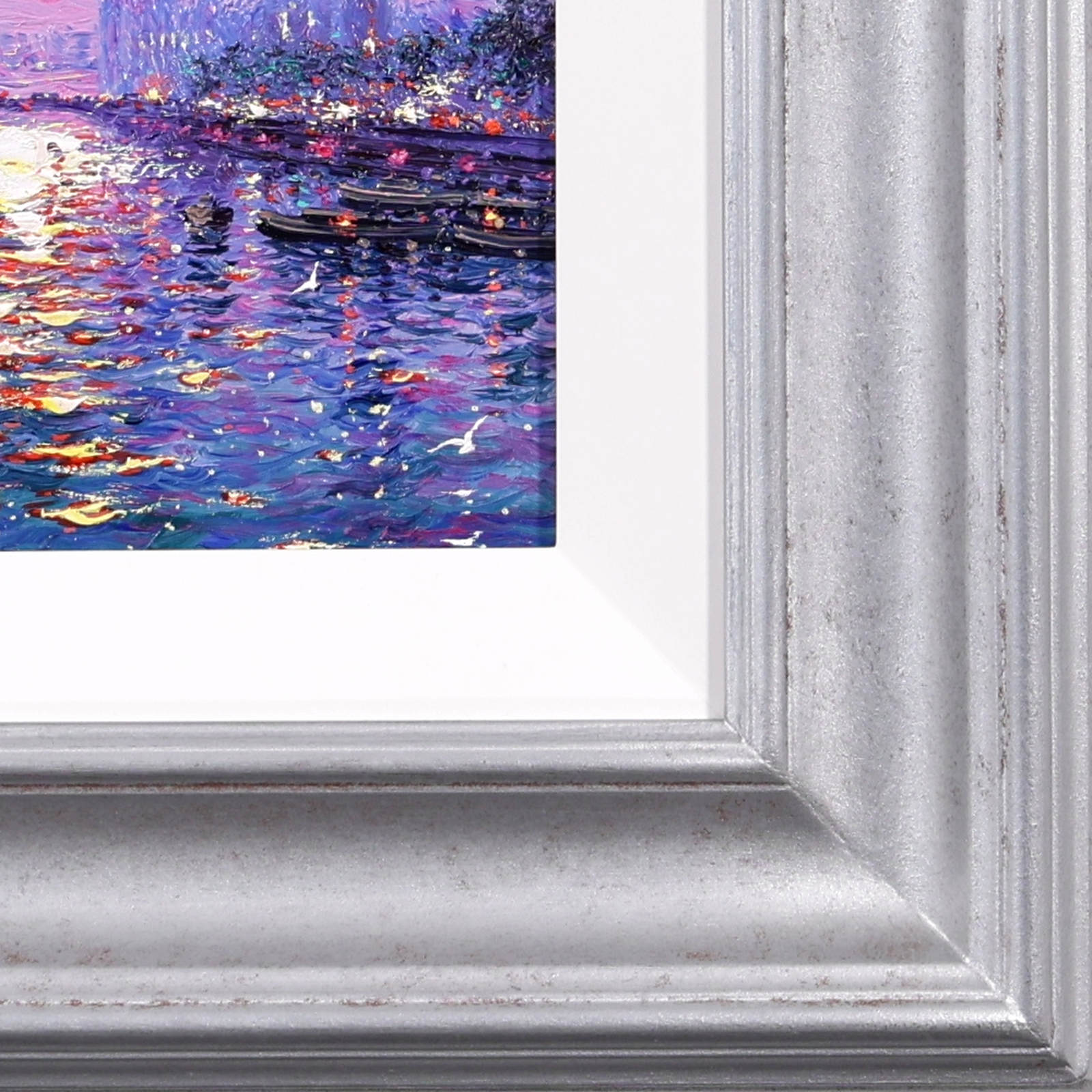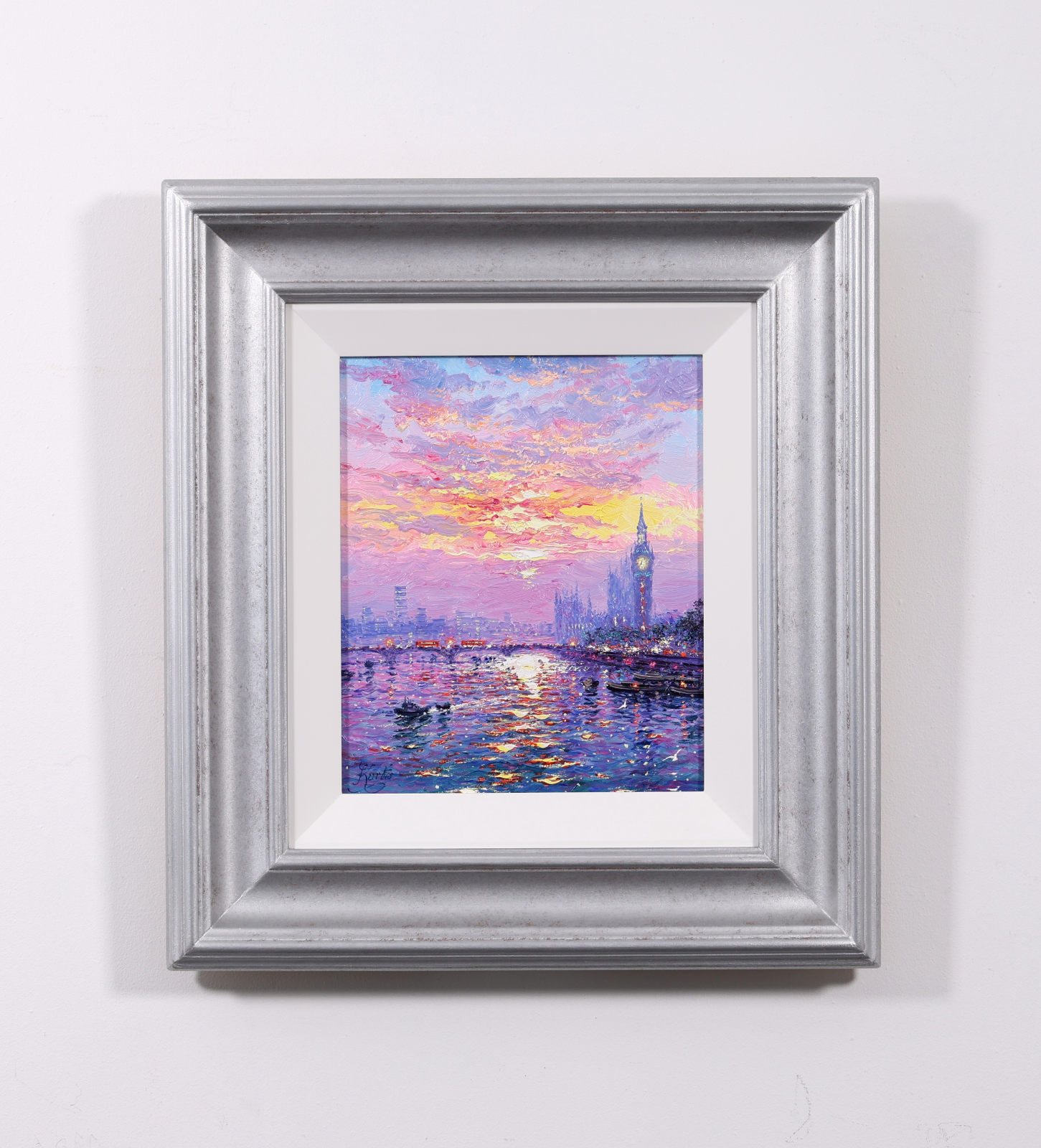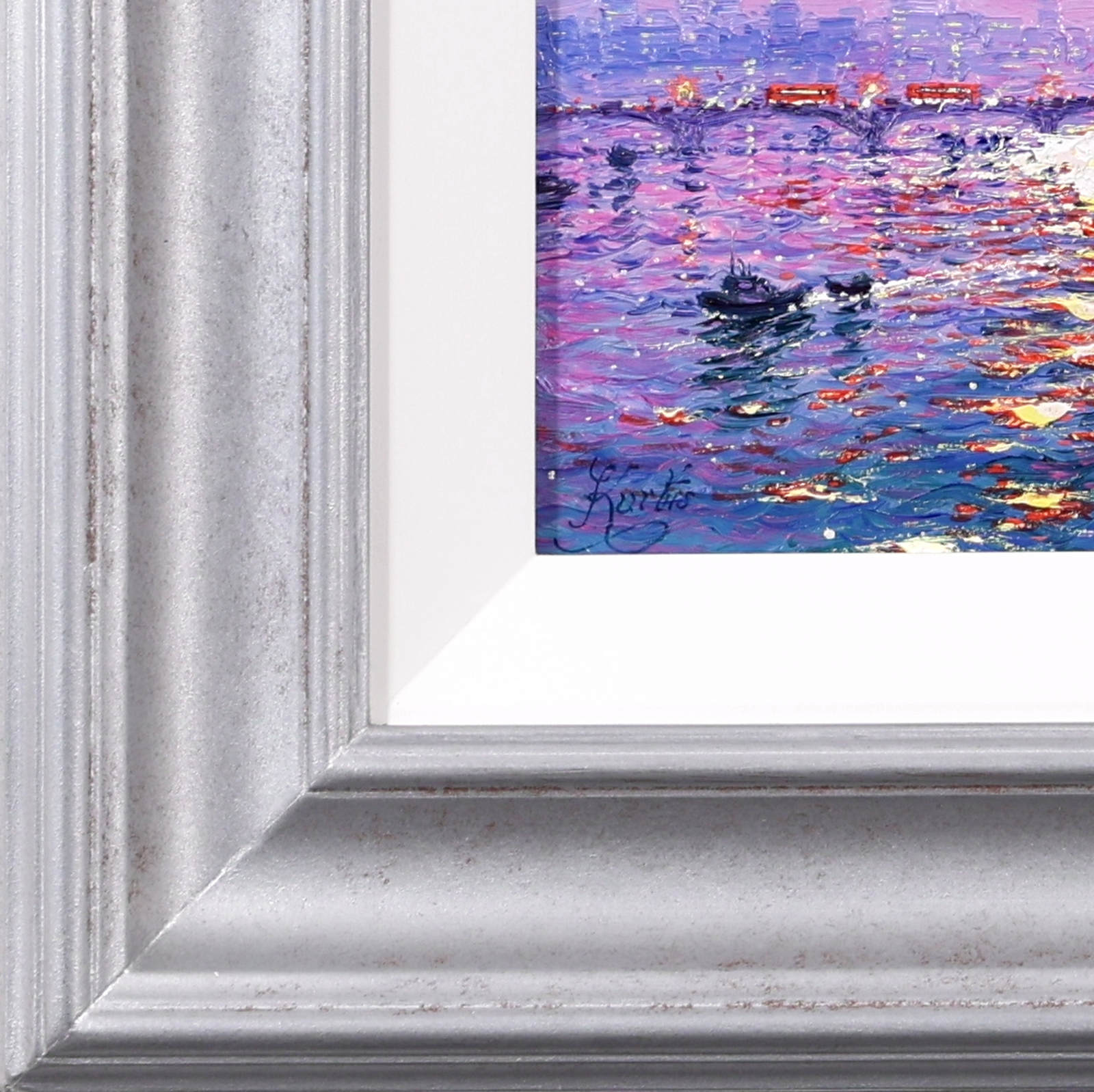 A luminous representation of Westminster by Andrew Grant Kurtis, capturing the sparkle of sunlight across the river in rich, impressionist oils. Framed with a white slip and distressed silver-tone moulding as shown and ready to hang.
