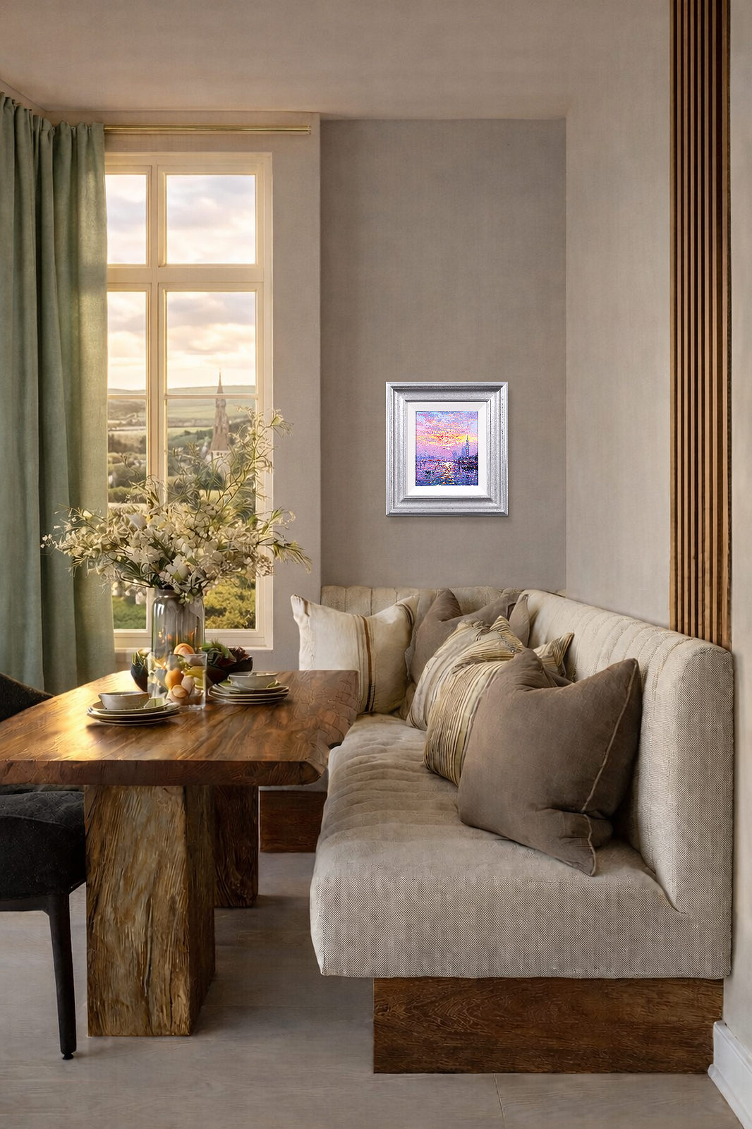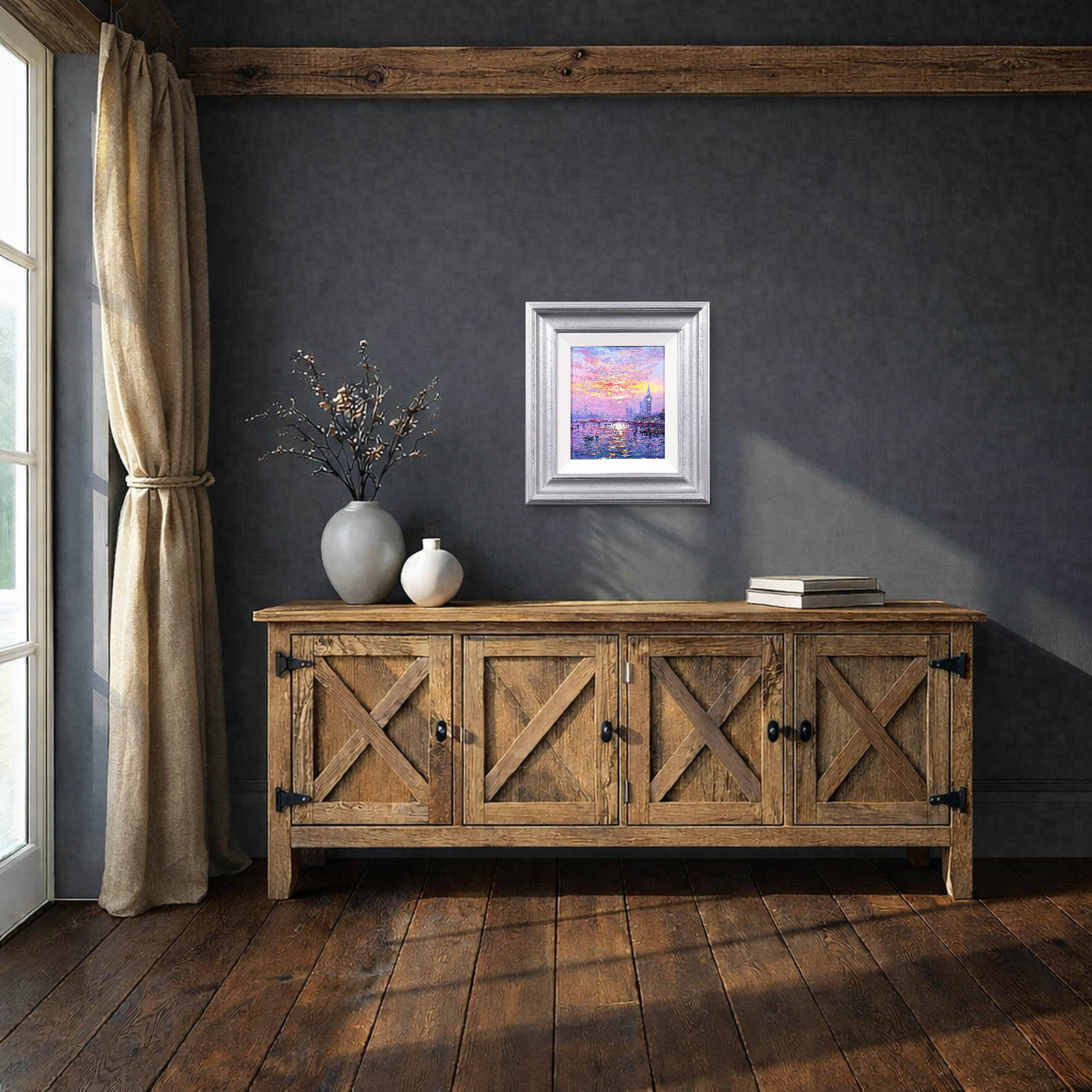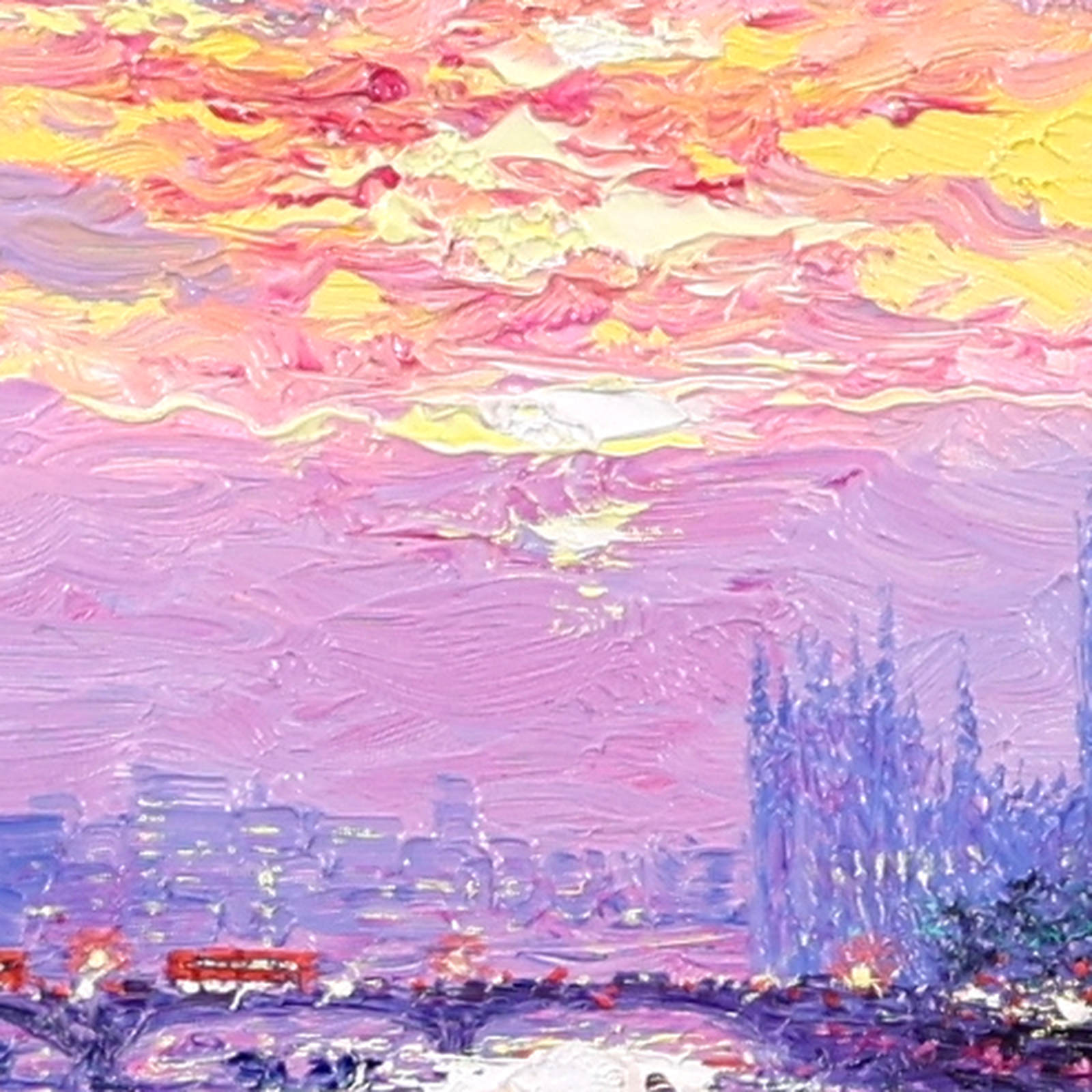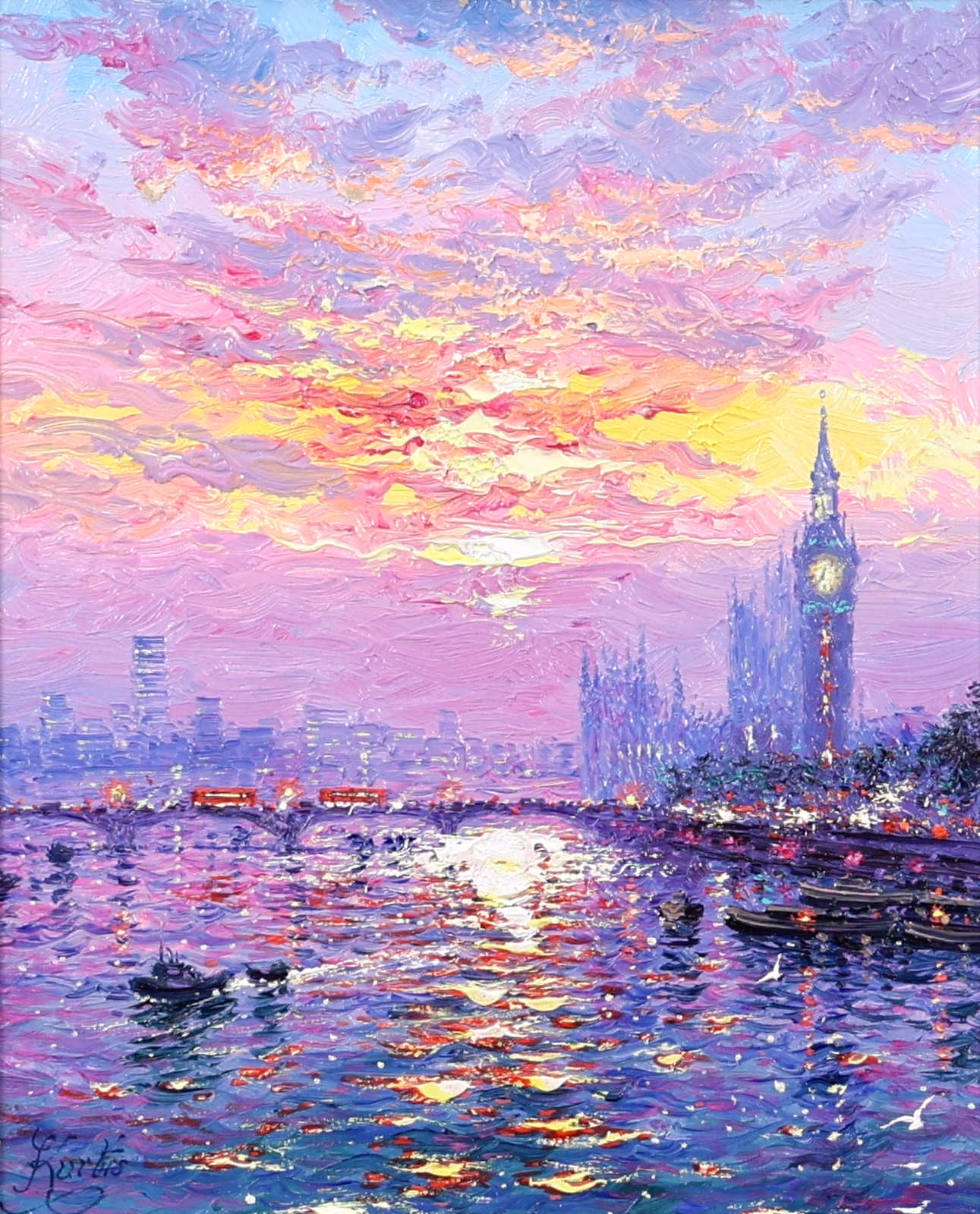 A luminous representation of Westminster by Andrew Grant Kurtis, capturing the sparkle of sunlight across the river in rich, impressionist oils. Framed with a white slip and distressed silver-tone moulding as shown and ready to hang.