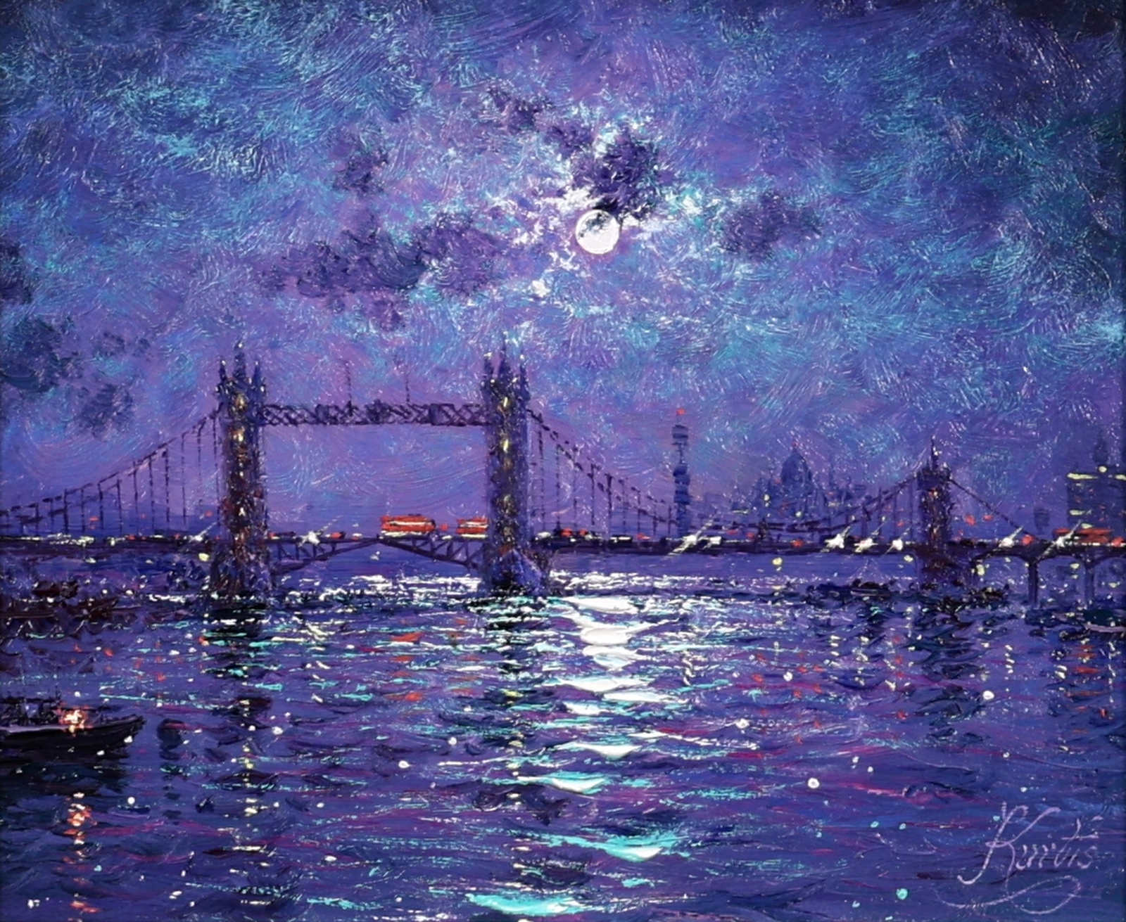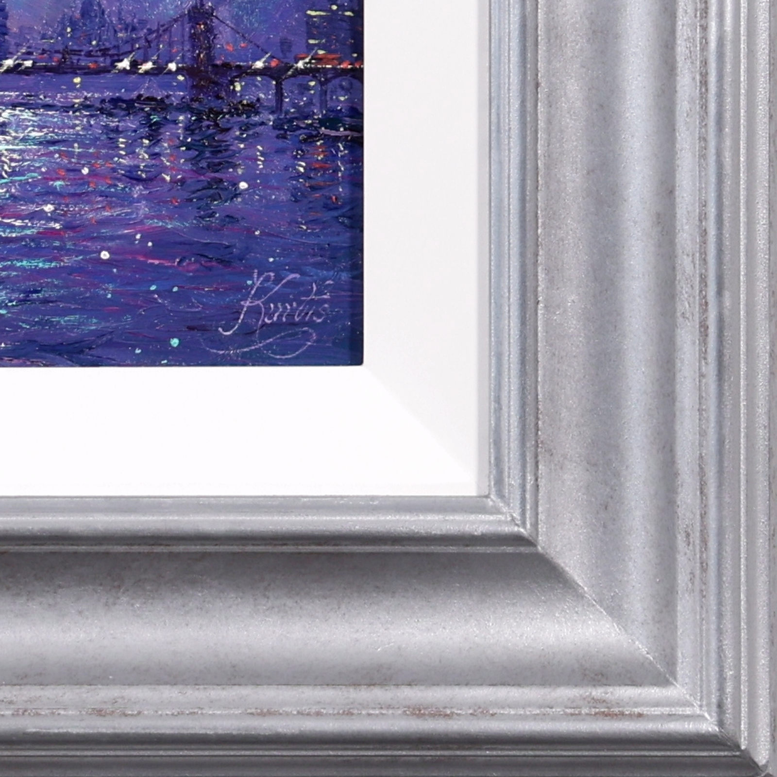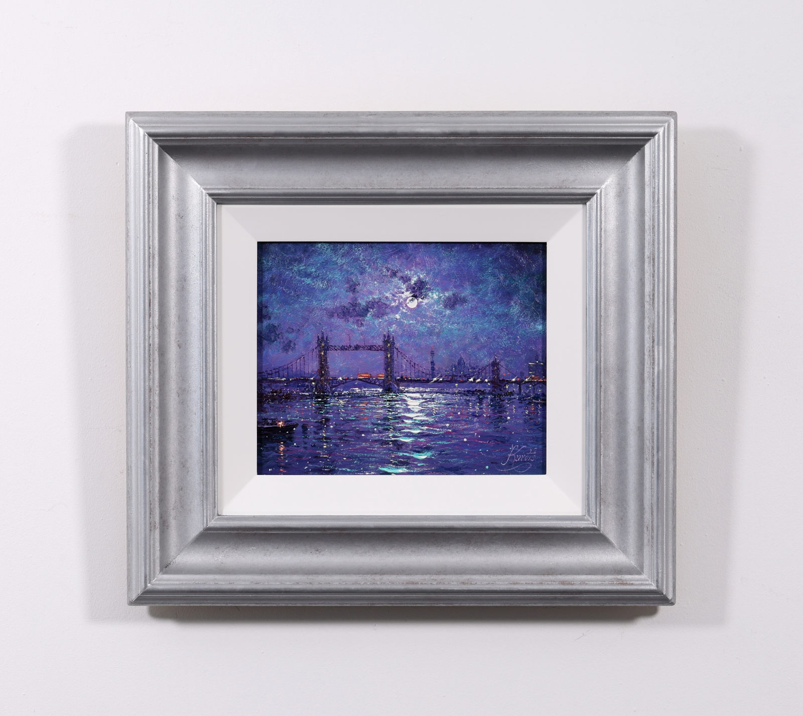 A vibrant view of the Thames by Andrew Grant Kurtis, alive with shimmering reflections and expressive impressionist brushwork. This original oil painting is framed with a white slip and distressed silver-tone frame as shown and ready to hang.