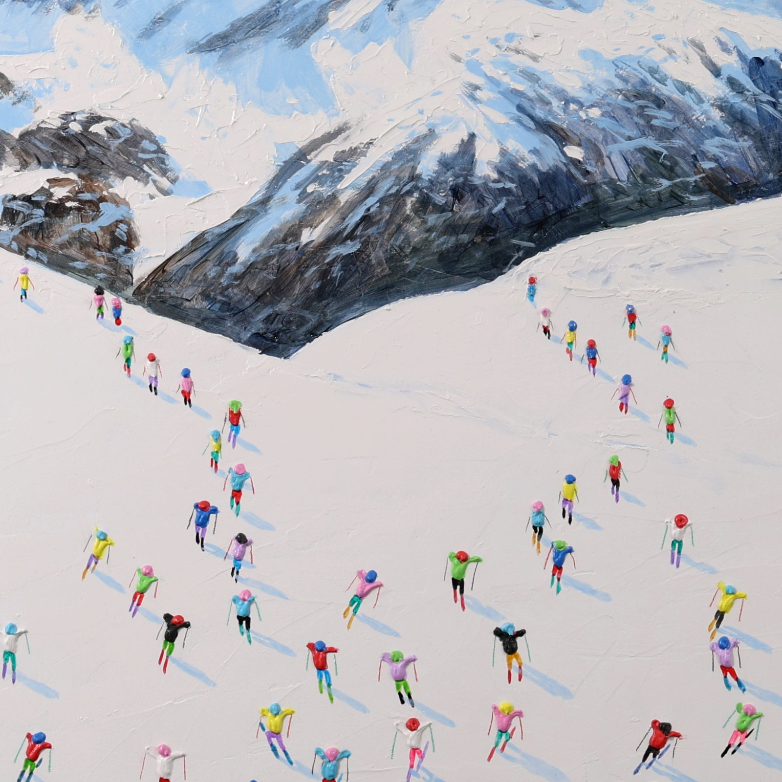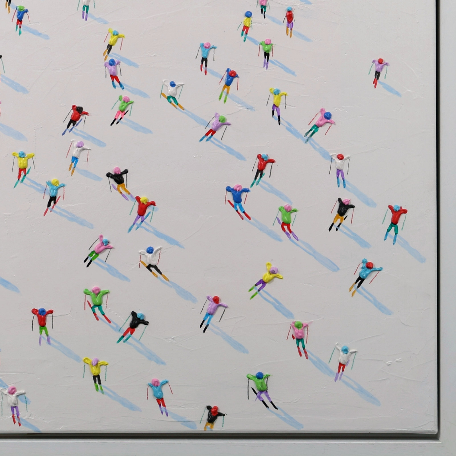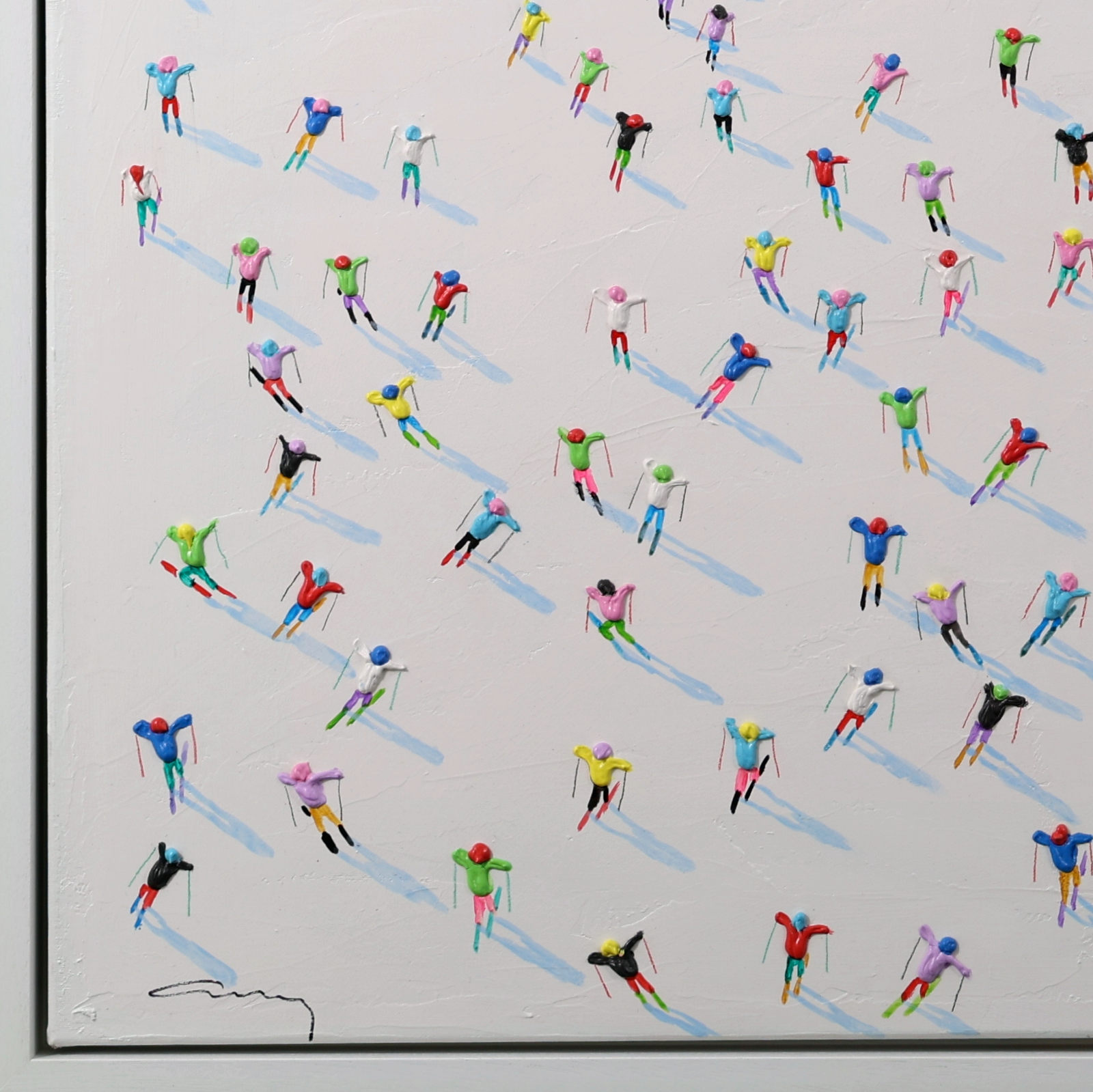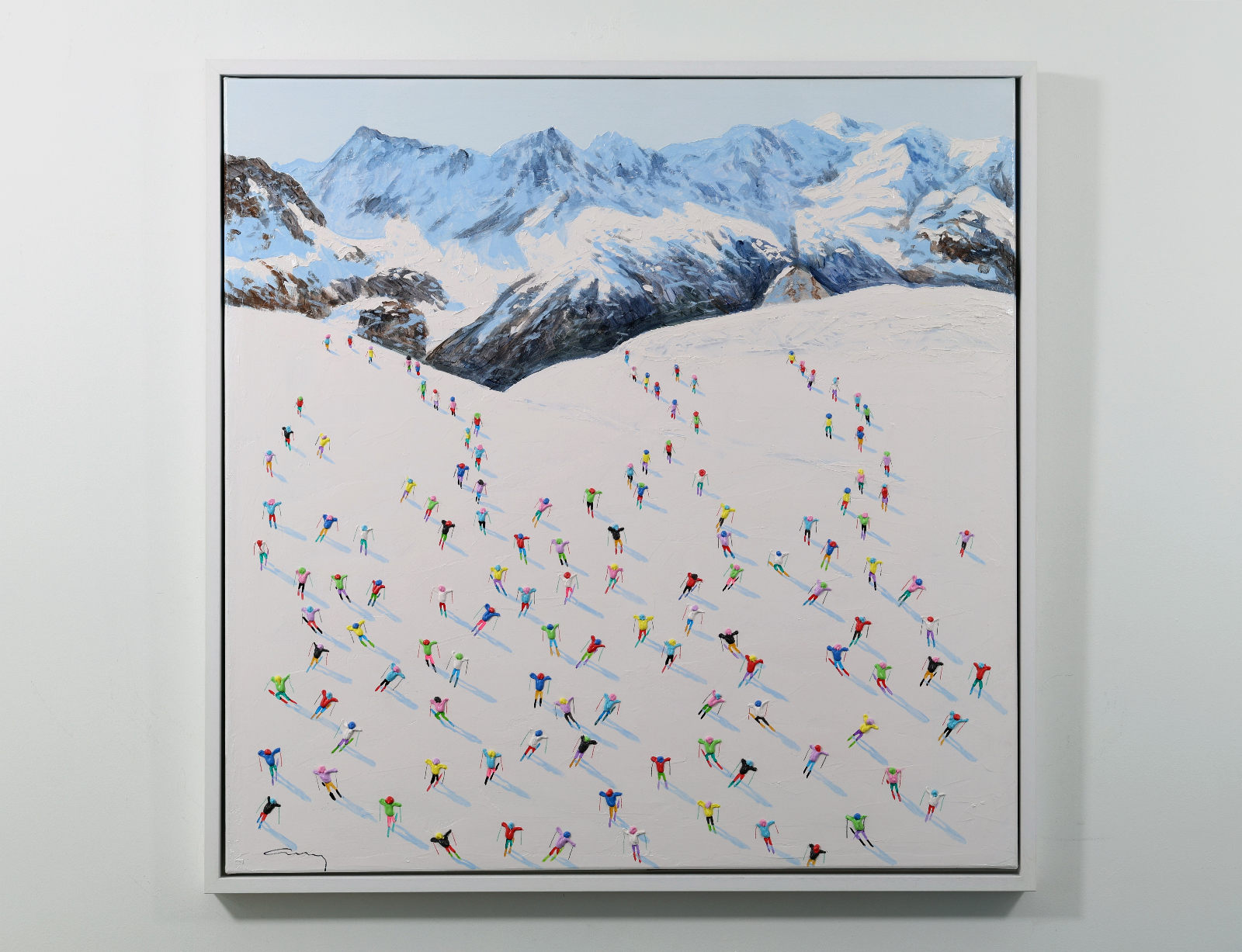 A large colourful painting featuring brightly dressed skiers descending down the slopes. With distant mountains and thick paint applied throughout, each person is further textured to bring them out from the canvas giving a fantastic 3D effect. Framed in a stylish white floating frame as shown and ready to hang.