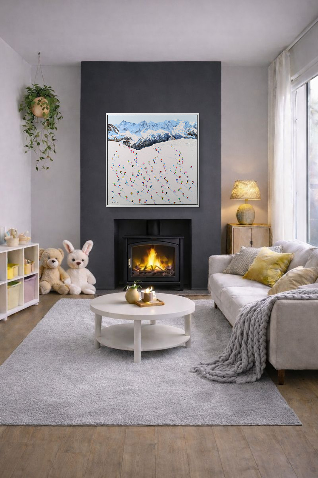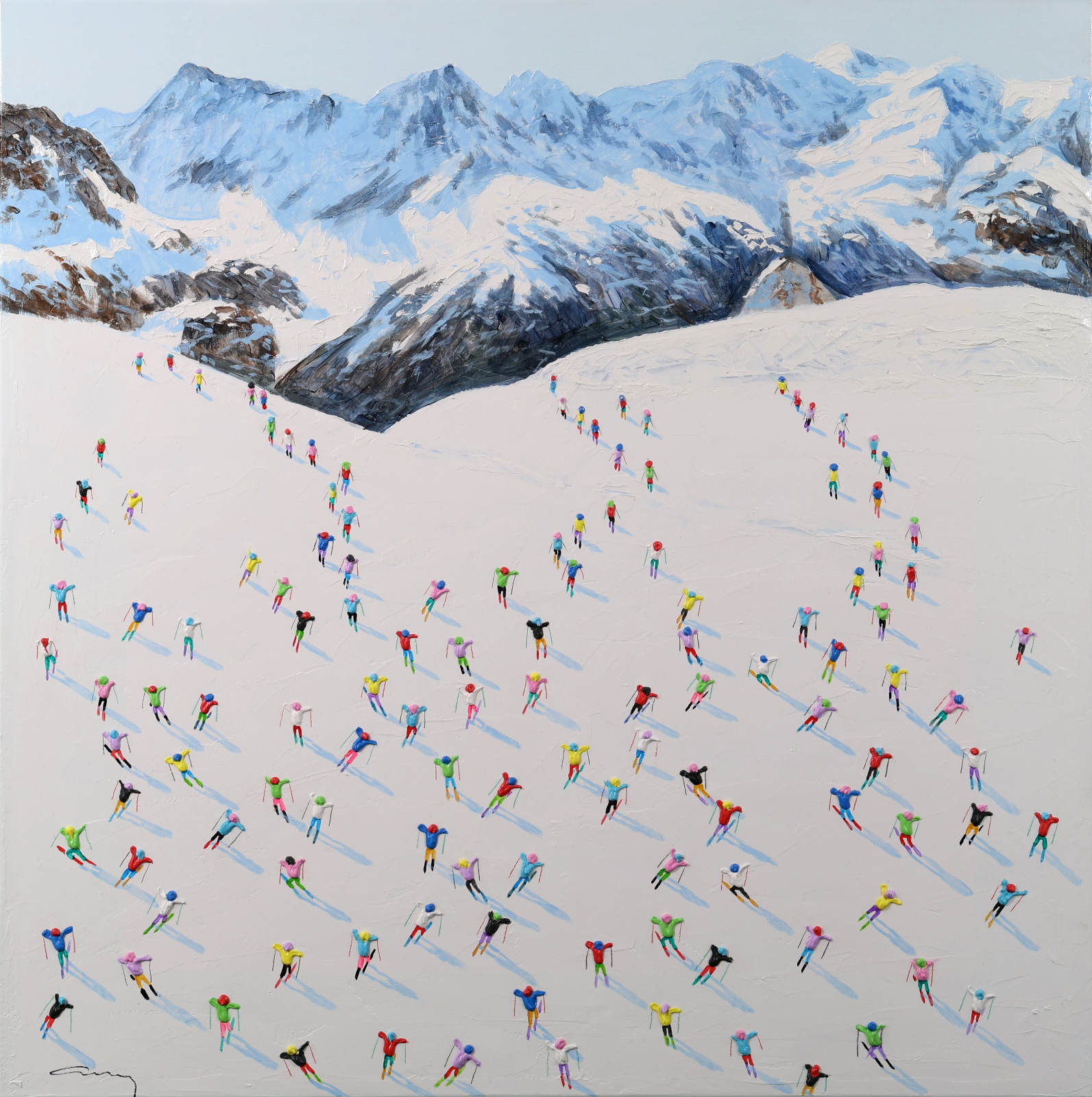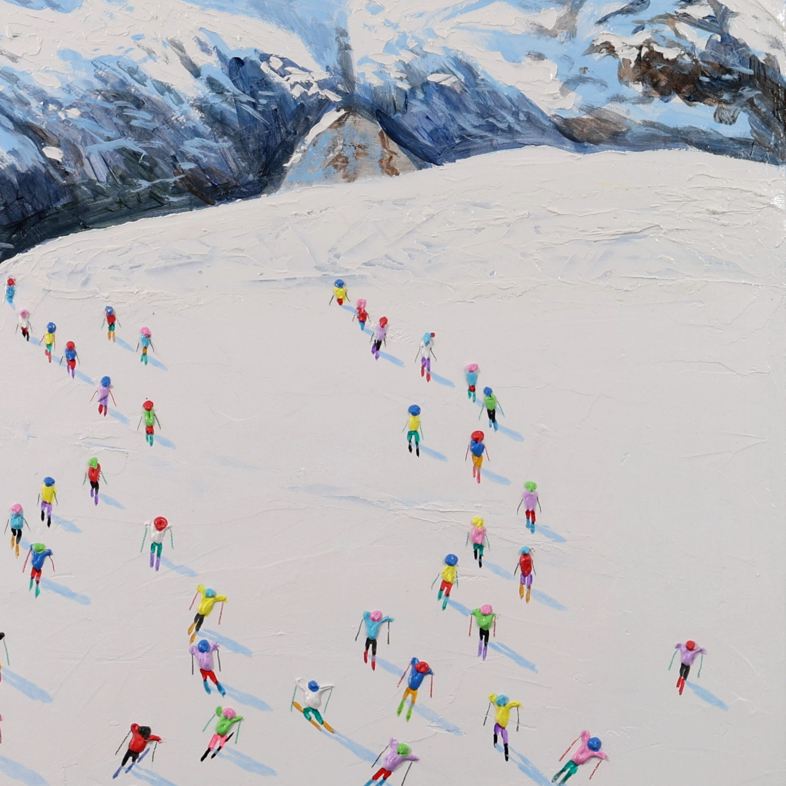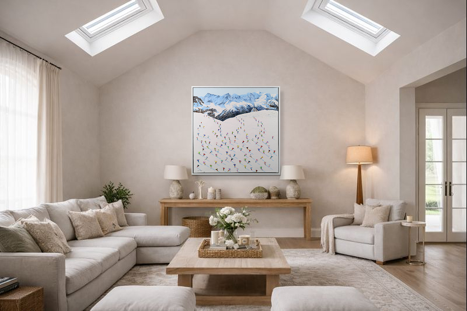 A large colourful painting featuring brightly dressed skiers descending down the slopes. With distant mountains and thick paint applied throughout, each person is further textured to bring them out from the canvas giving a fantastic 3D effect. Framed in a stylish white floating frame as shown and ready to hang.