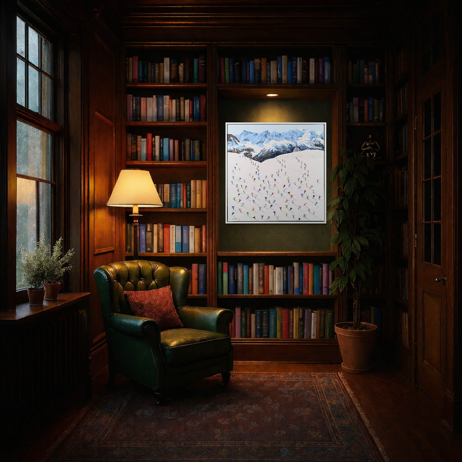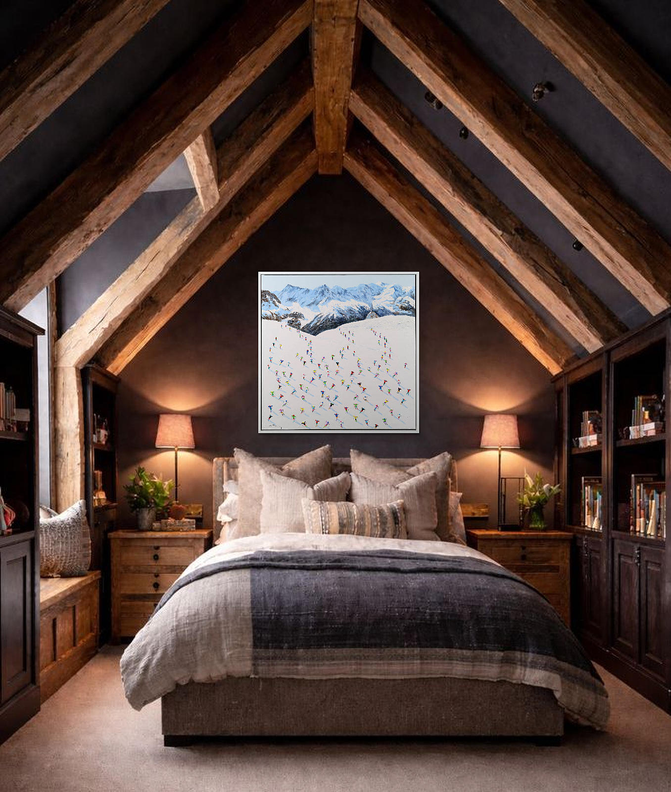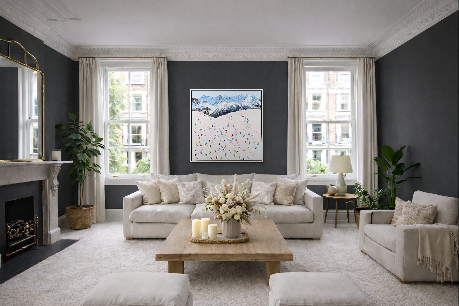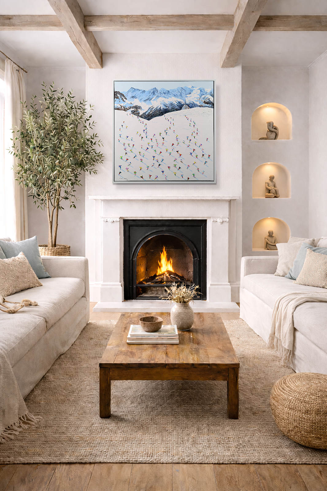 A large colourful painting featuring brightly dressed skiers descending down the slopes. With distant mountains and thick paint applied throughout, each person is further textured to bring them out from the canvas giving a fantastic 3D effect. Framed in a stylish white floating frame as shown and ready to hang.