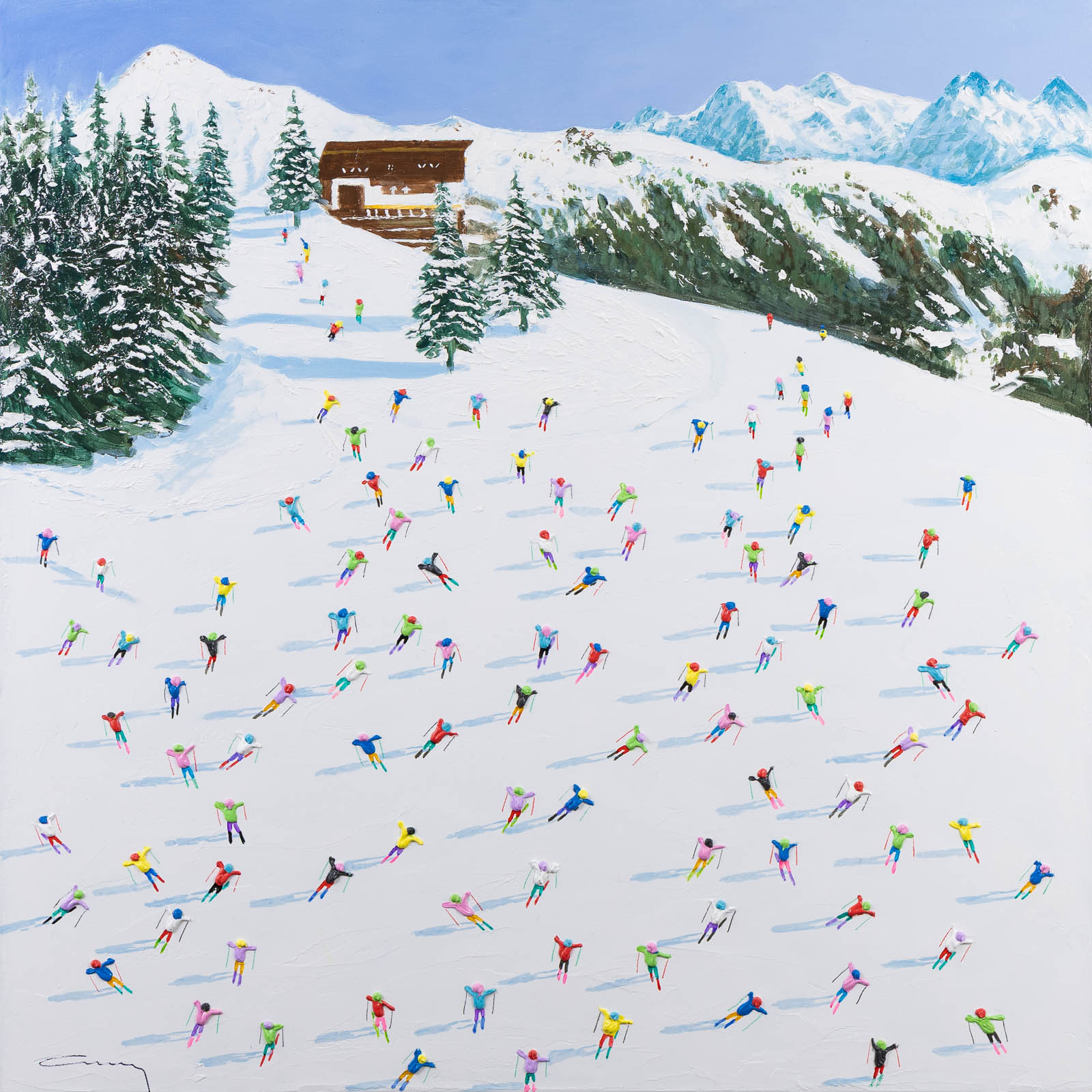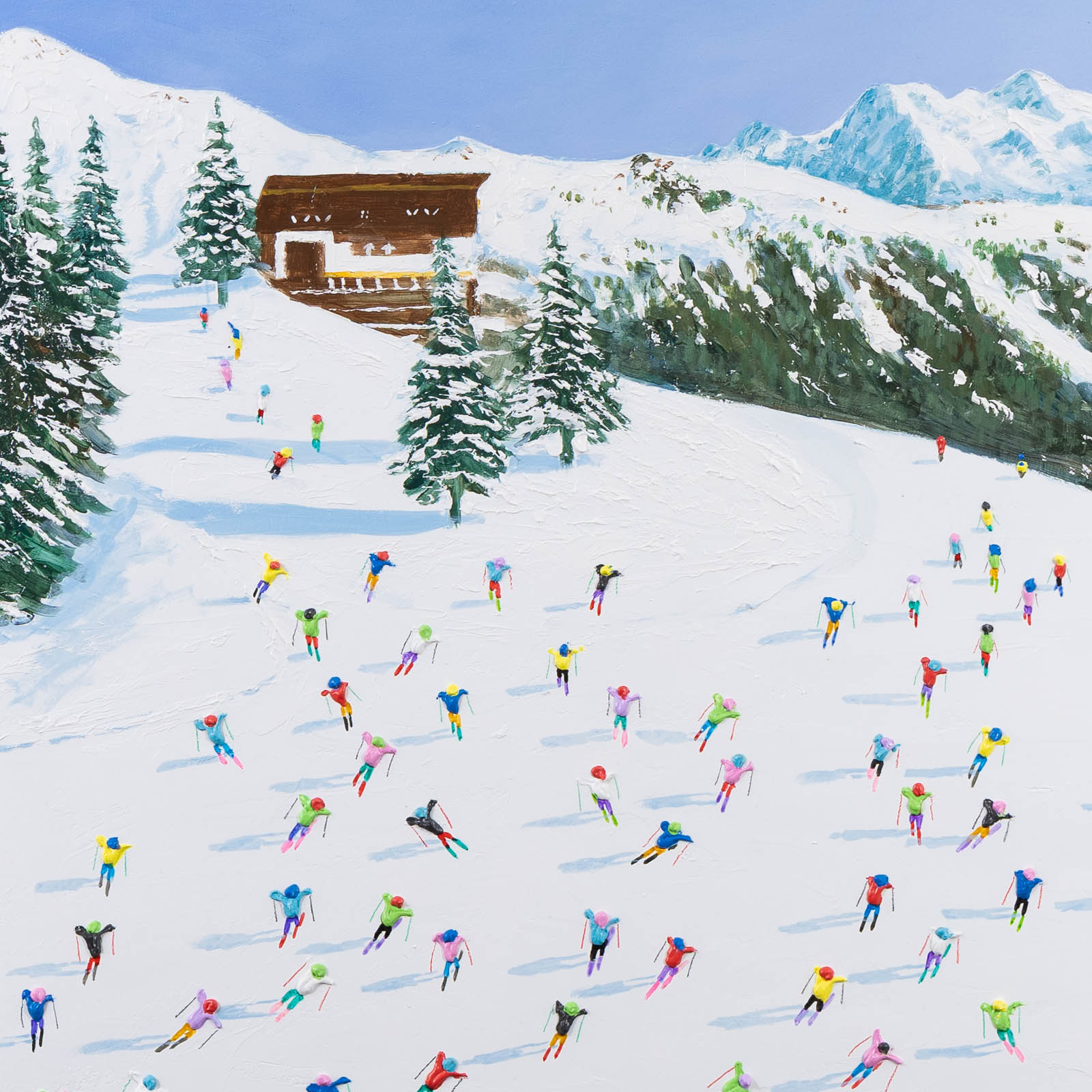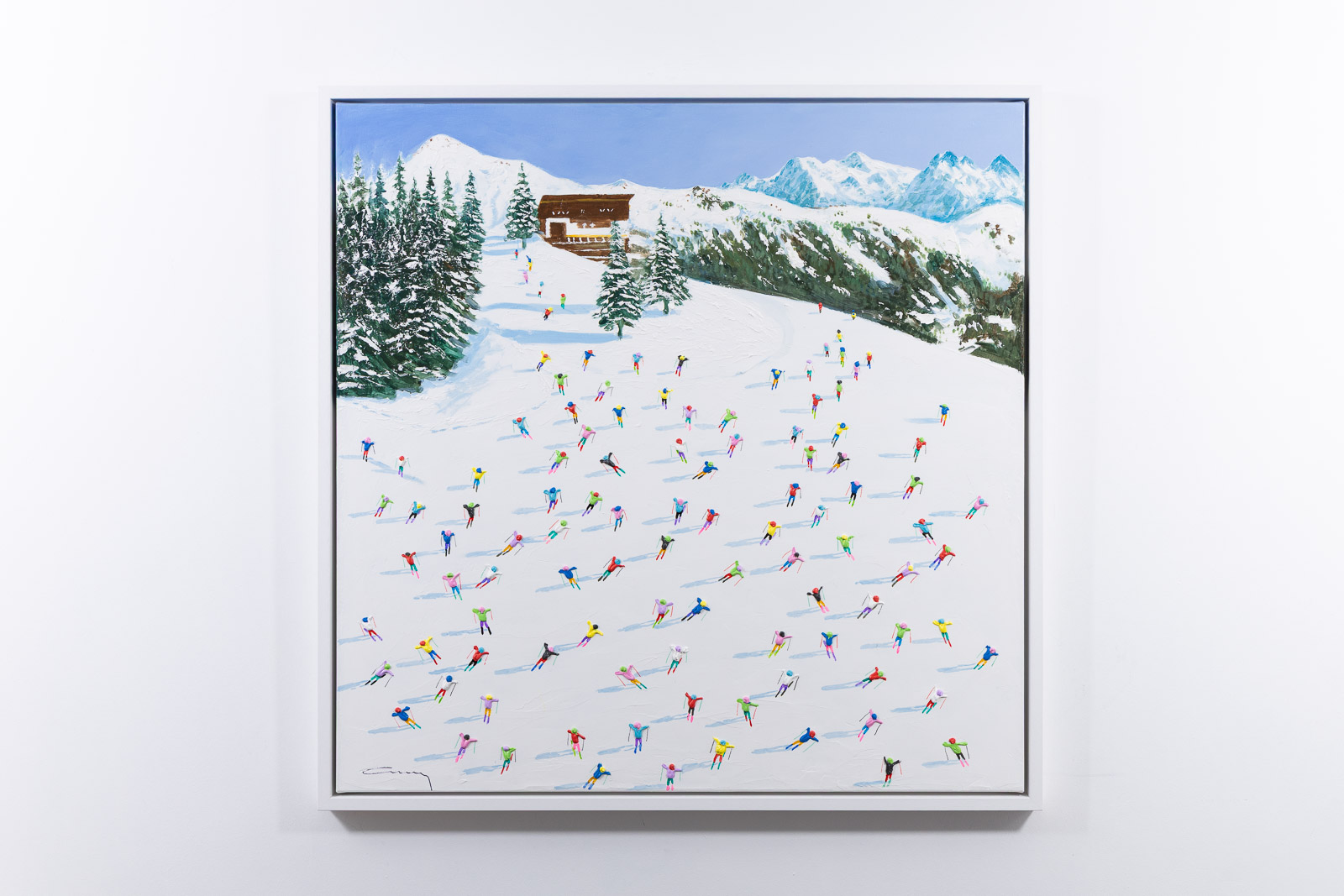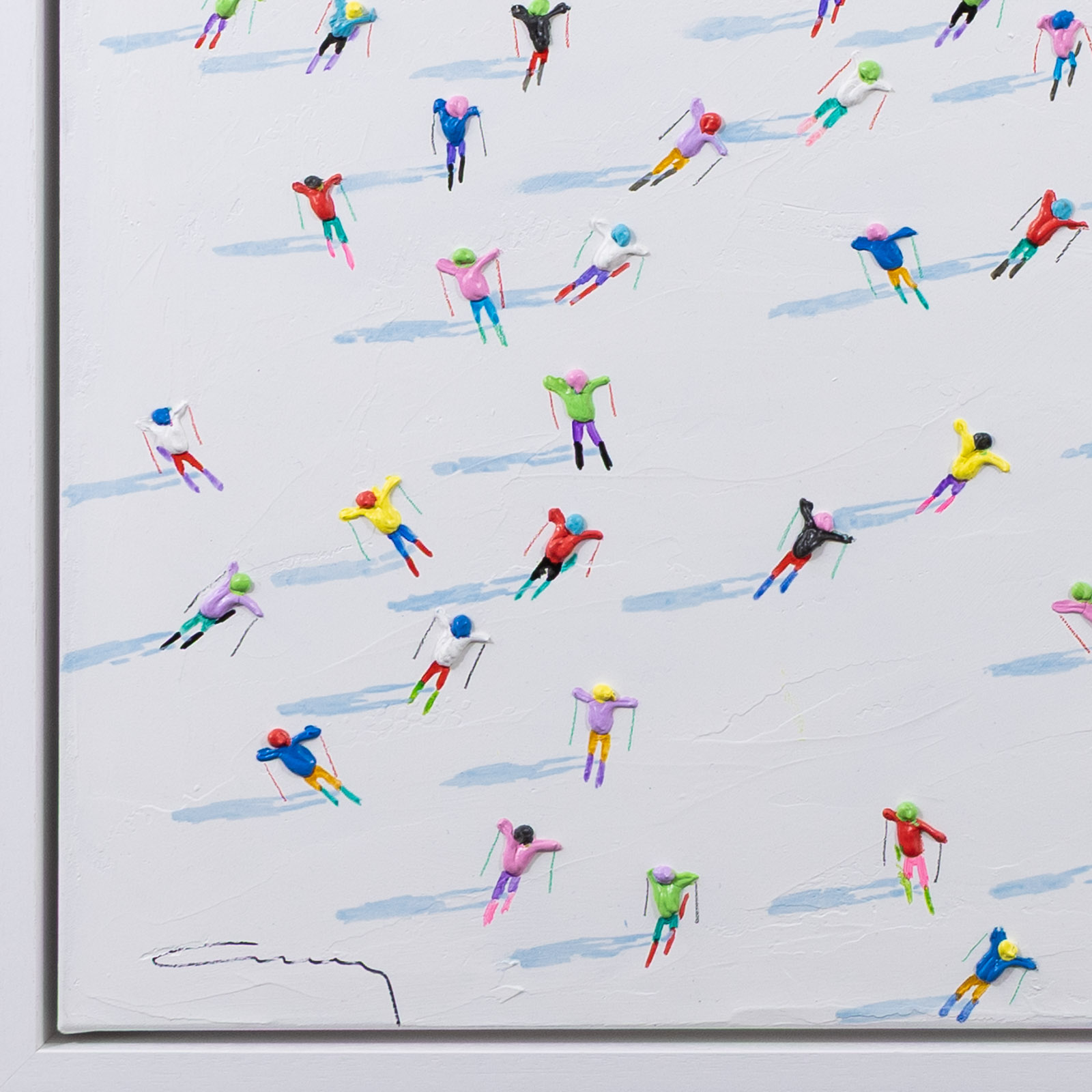 A large colourful painting featuring brightly dressed skiers descending down the slopes. With distant mountains and thick paint applied throughout, each person is further textured to bring them out from the canvas giving a fantastic 3D effect. Framed in a stylish white floating frame as shown and ready to hang.
