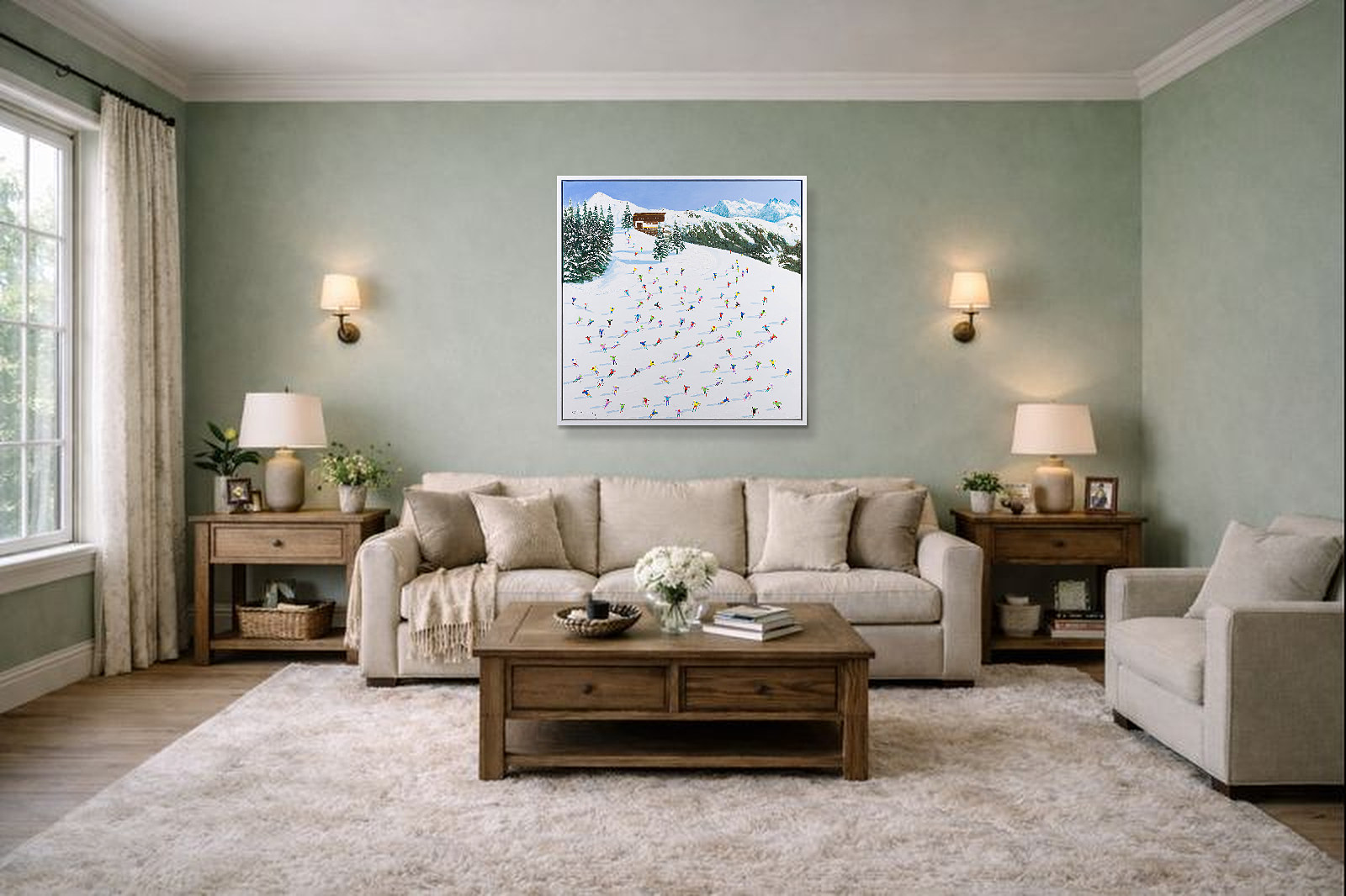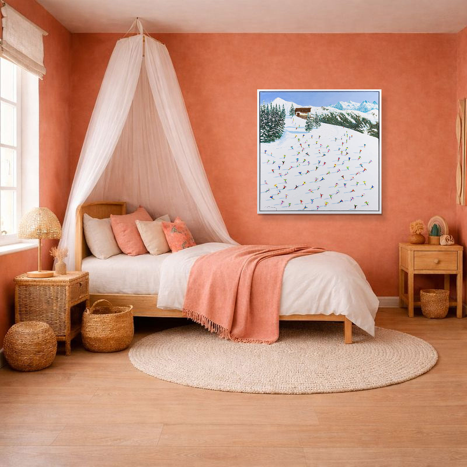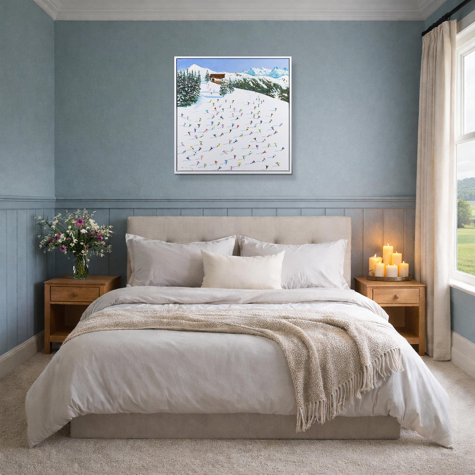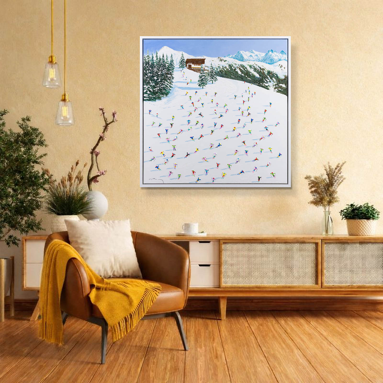 A large colourful painting featuring brightly dressed skiers descending down the slopes. With distant mountains and thick paint applied throughout, each person is further textured to bring them out from the canvas giving a fantastic 3D effect. Framed in a stylish white floating frame as shown and ready to hang.