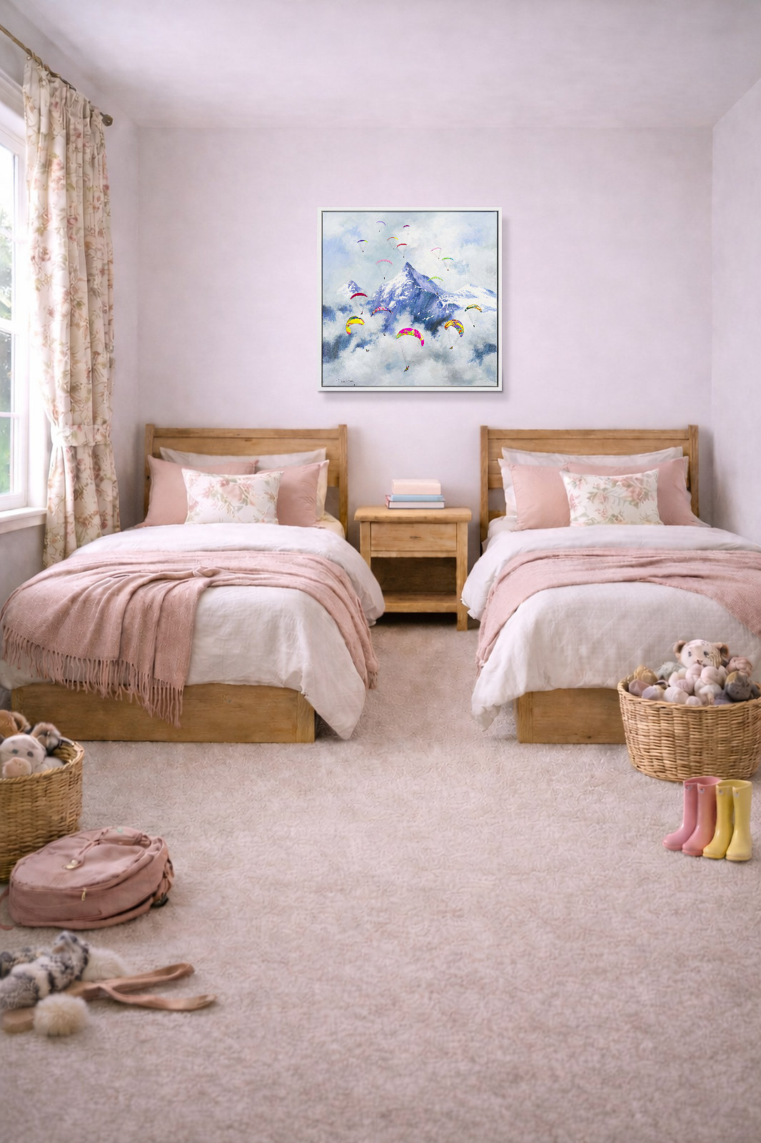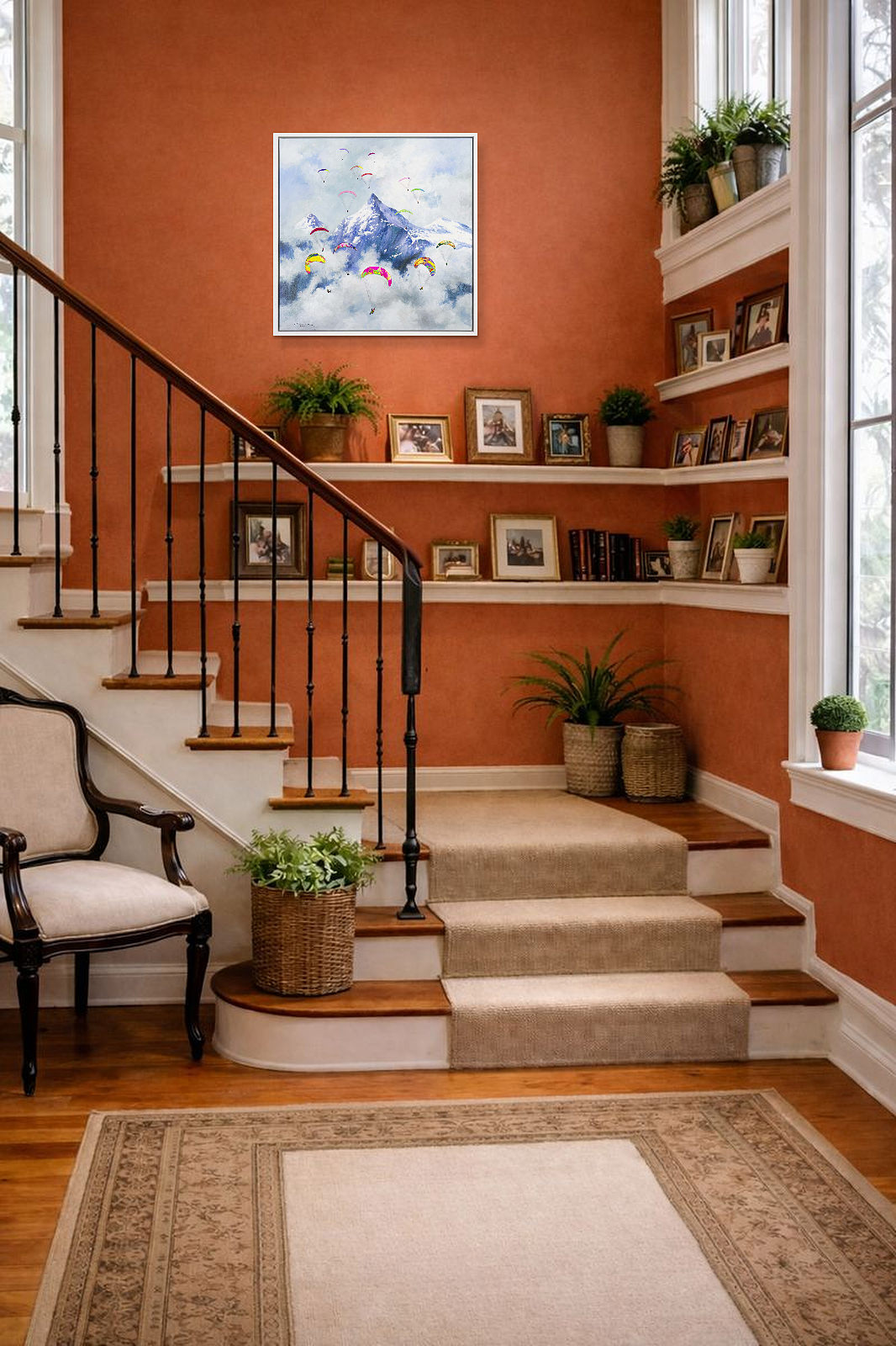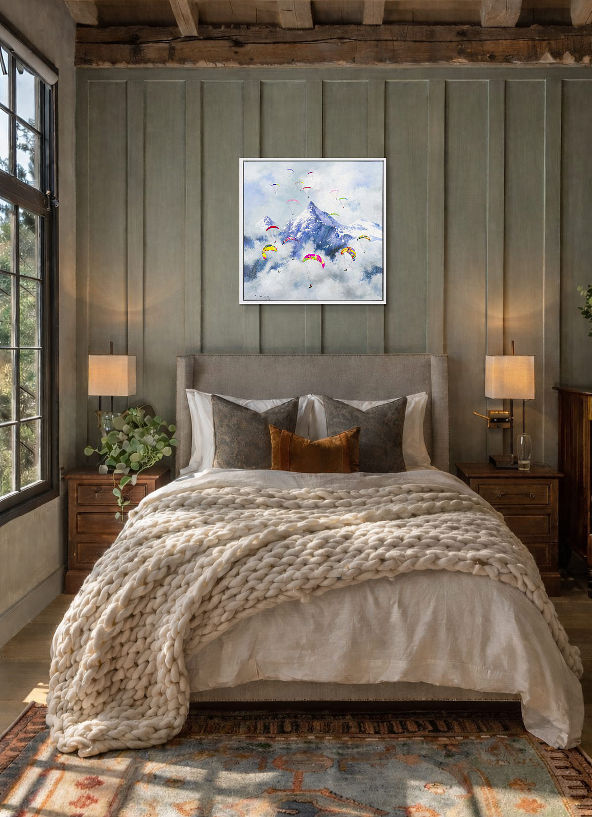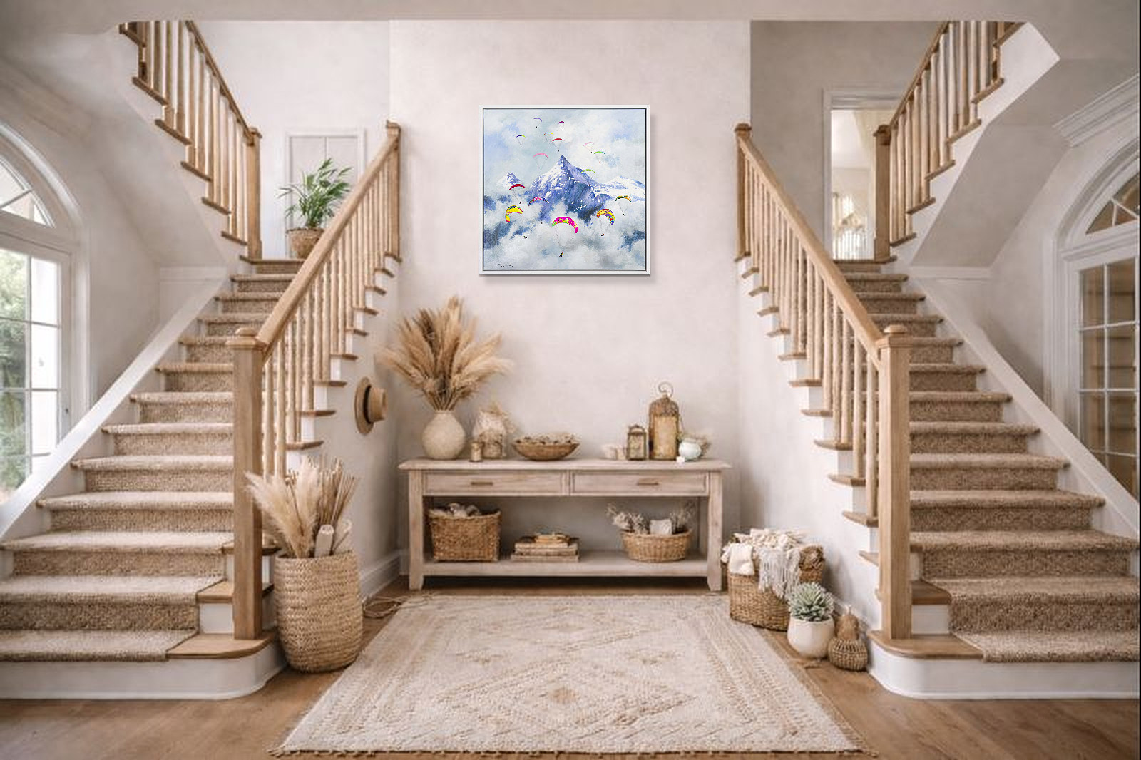 A colourful new style by Casimiro (Antonio Navarro) featuring paragliders against a snowcapped mountainous backdrop. With thick paint applied throughout, each person is further textured to bring them out from the canvas giving a fantastic 3D effect. Framed in a stylish white floating frame as shown and ready to hang.