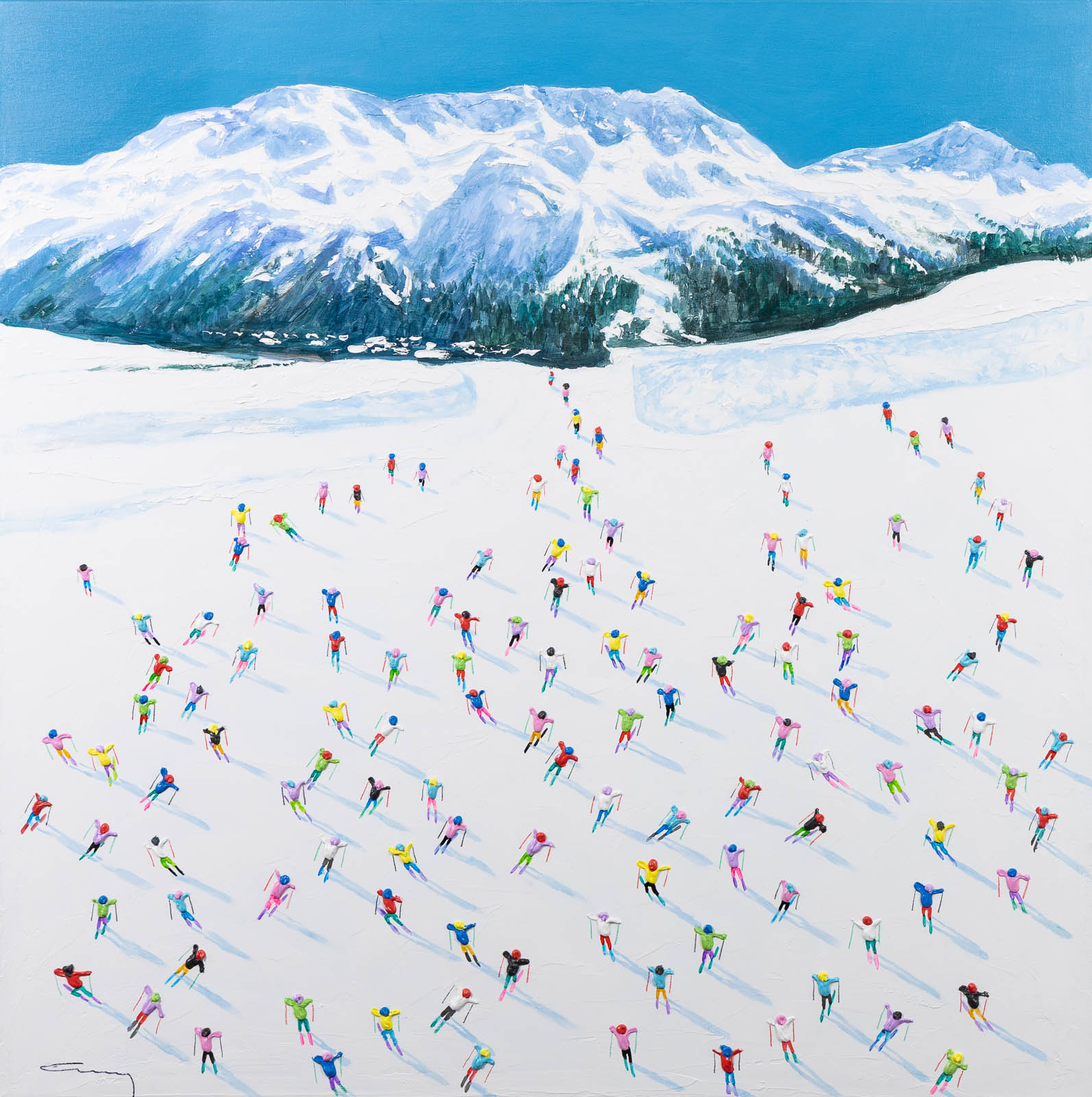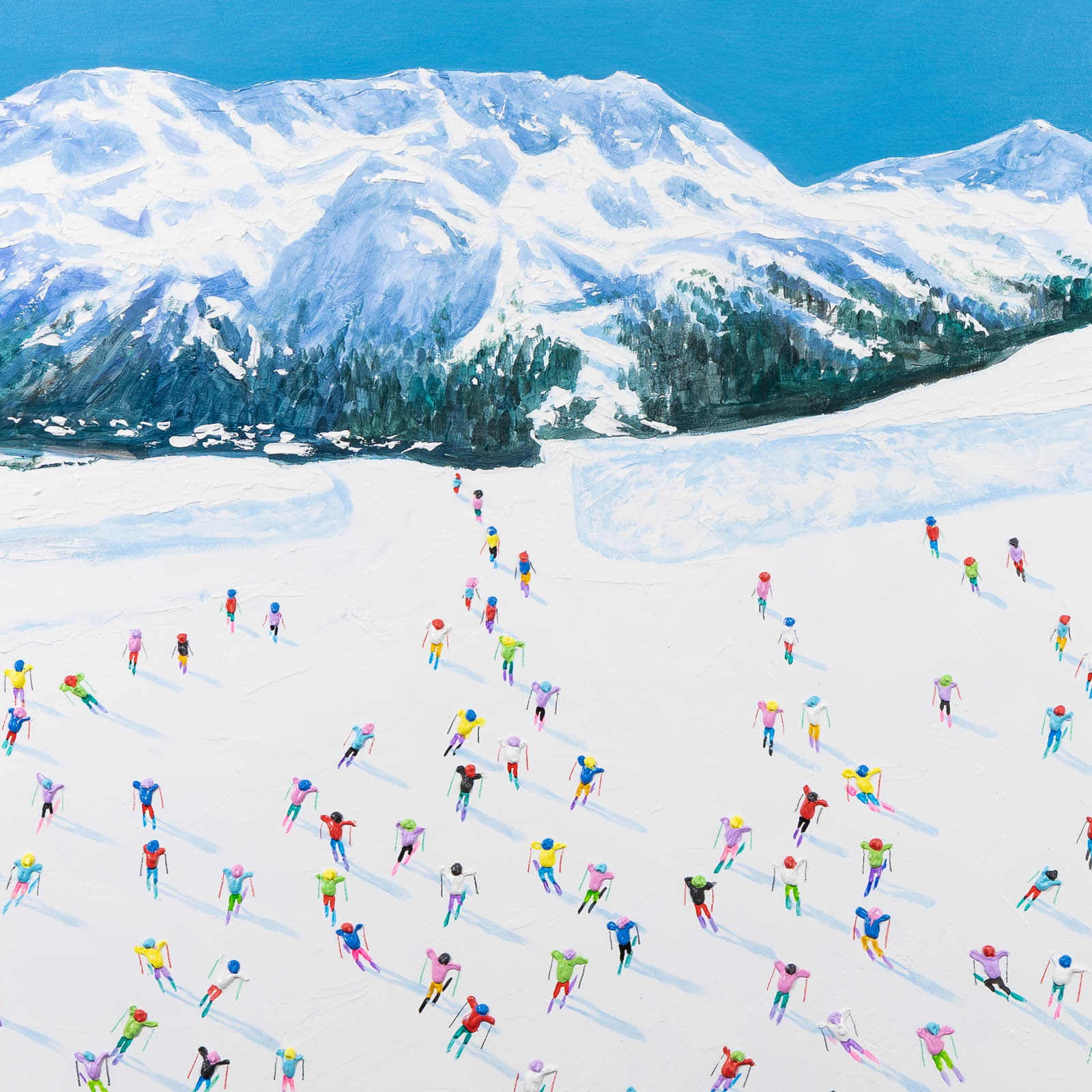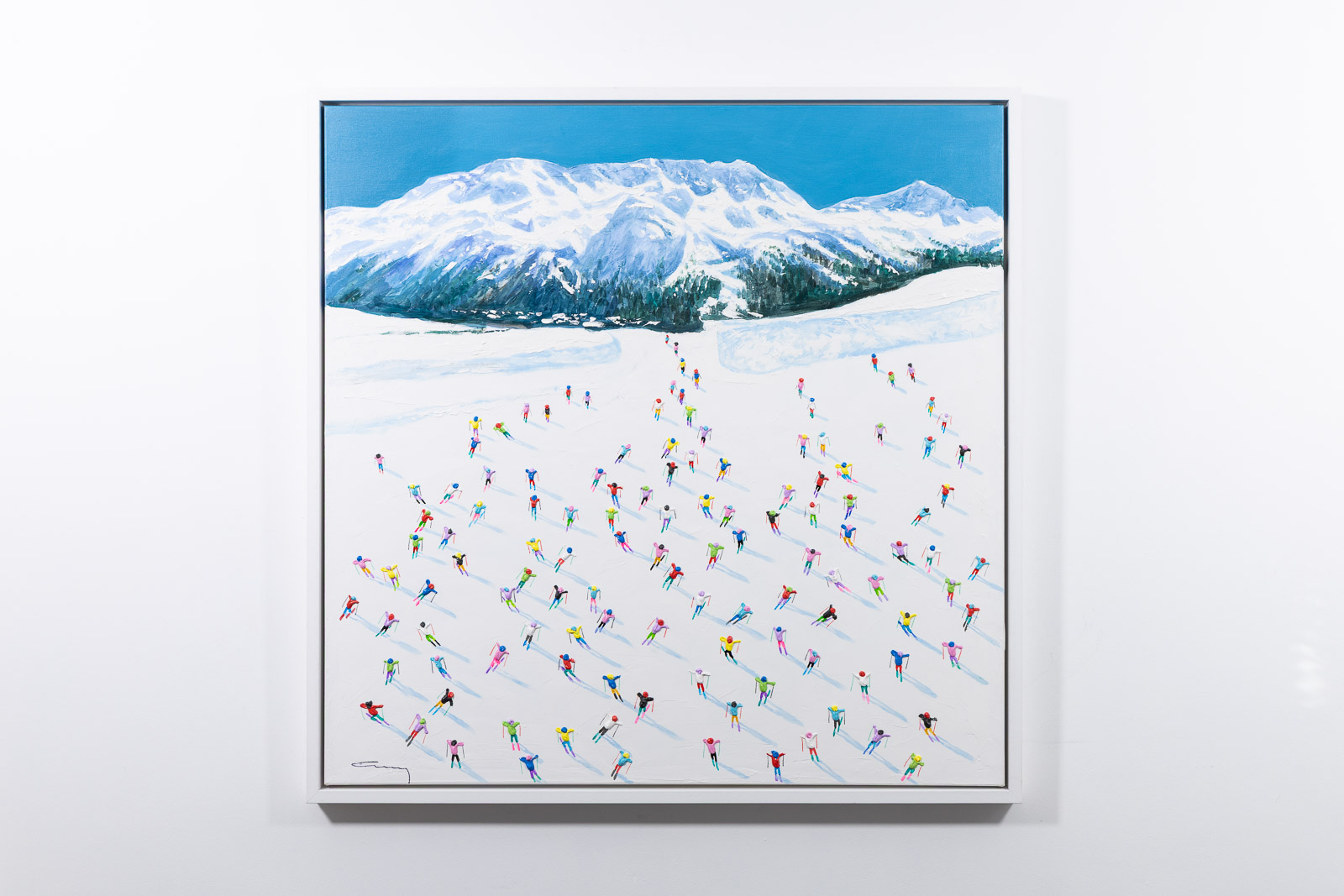 A large colourful painting featuring brightly dressed skiers descending down the slopes. With distant mountains and thick paint applied throughout, each person is further textured to bring them out from the canvas giving a fantastic 3D effect. Framed in a stylish white floating frame as shown and ready to hang.