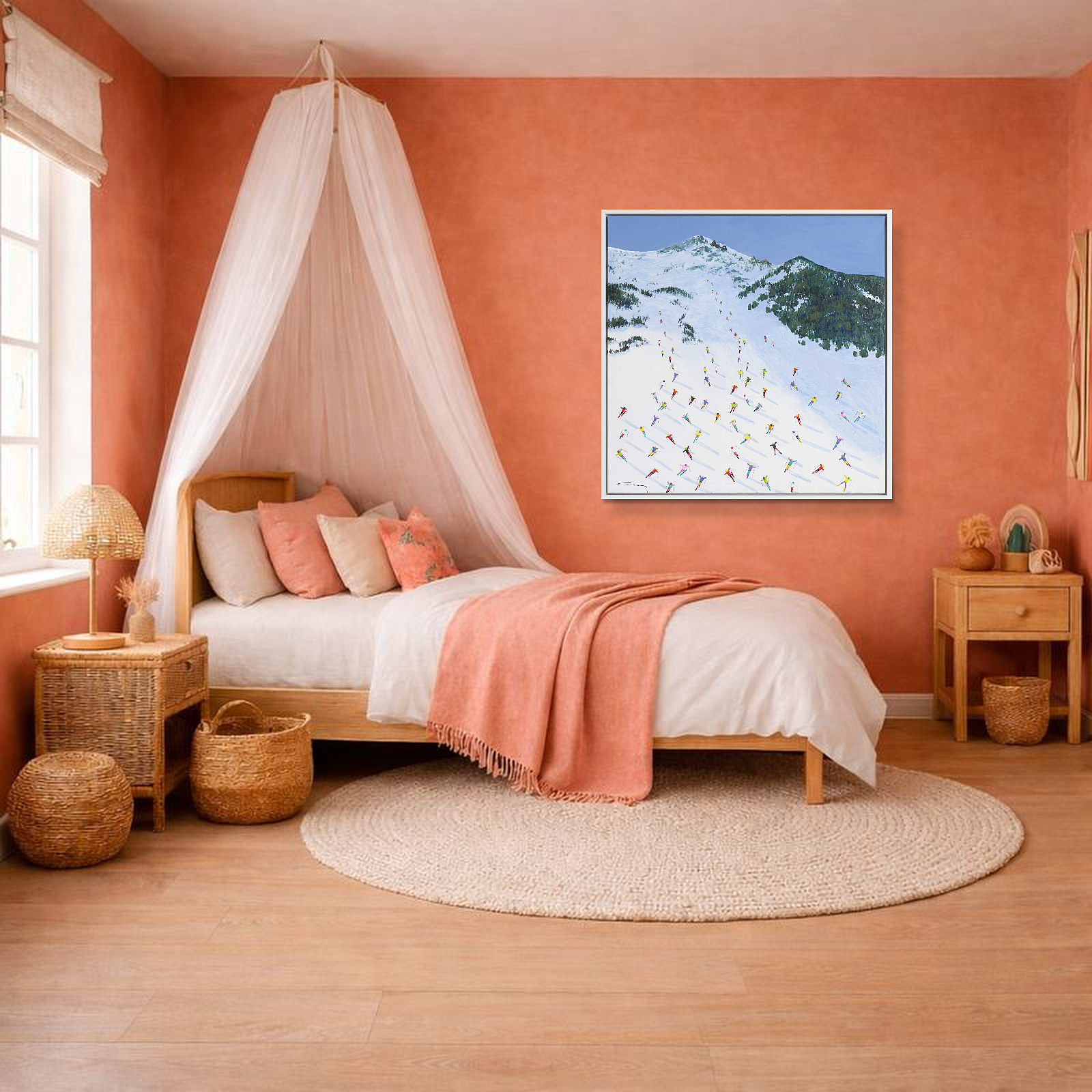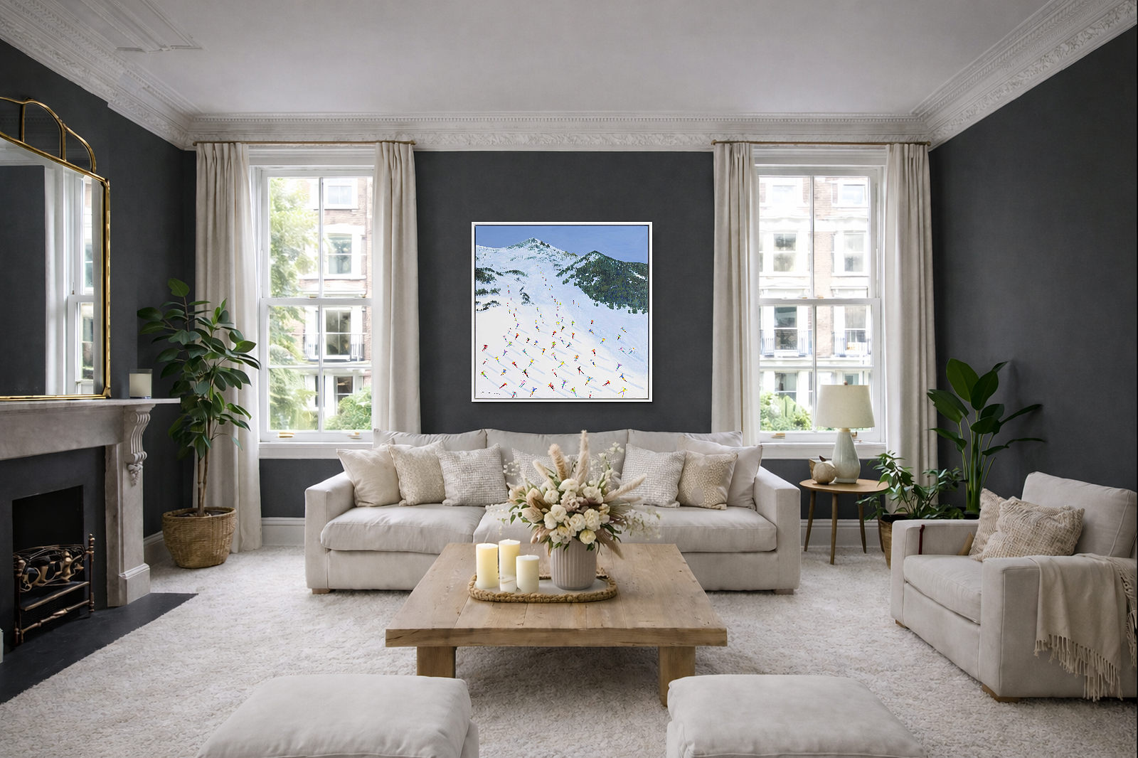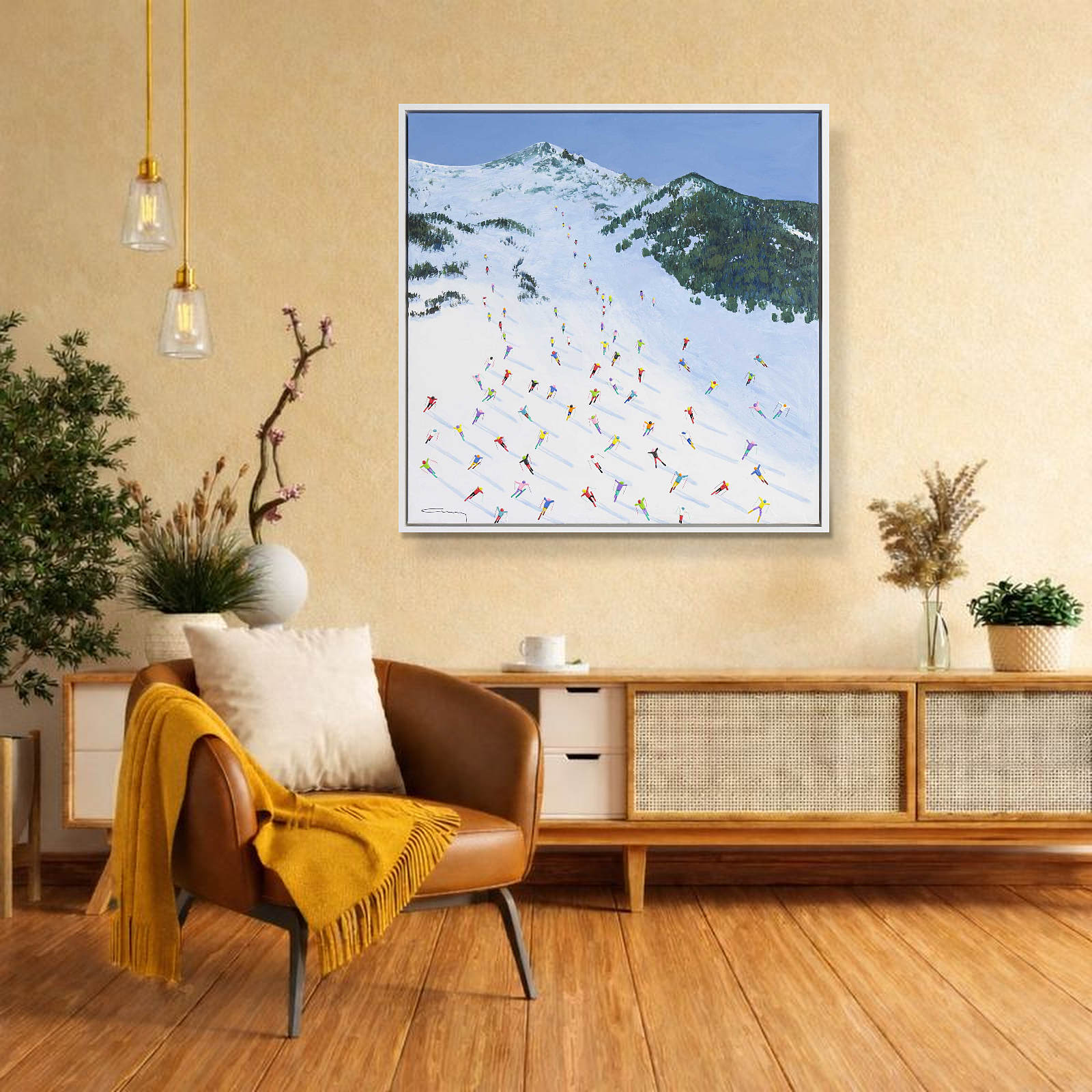 A large colourful painting featuring brightly dressed skiers descending down the slopes in Val D’Isère. With distant mountains and thick paint applied throughout, each person is further textured to bring them out from the canvas giving a fantastic 3D effect. Framed in a stylish white floating frame as shown and ready to hang.