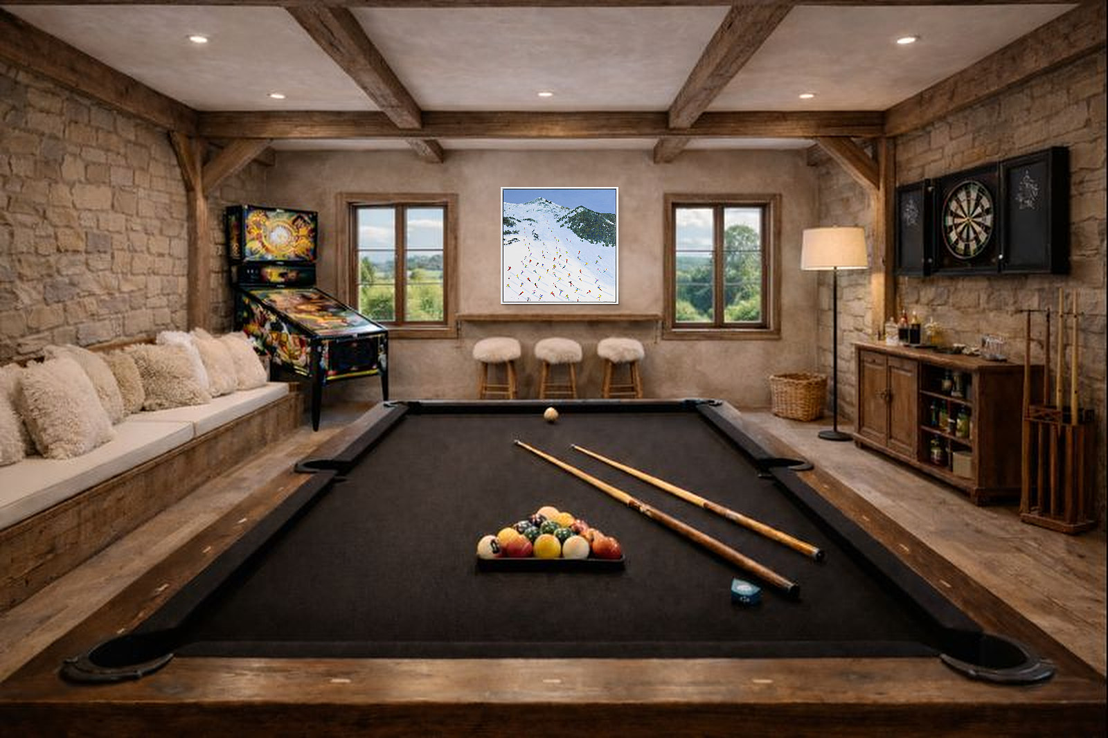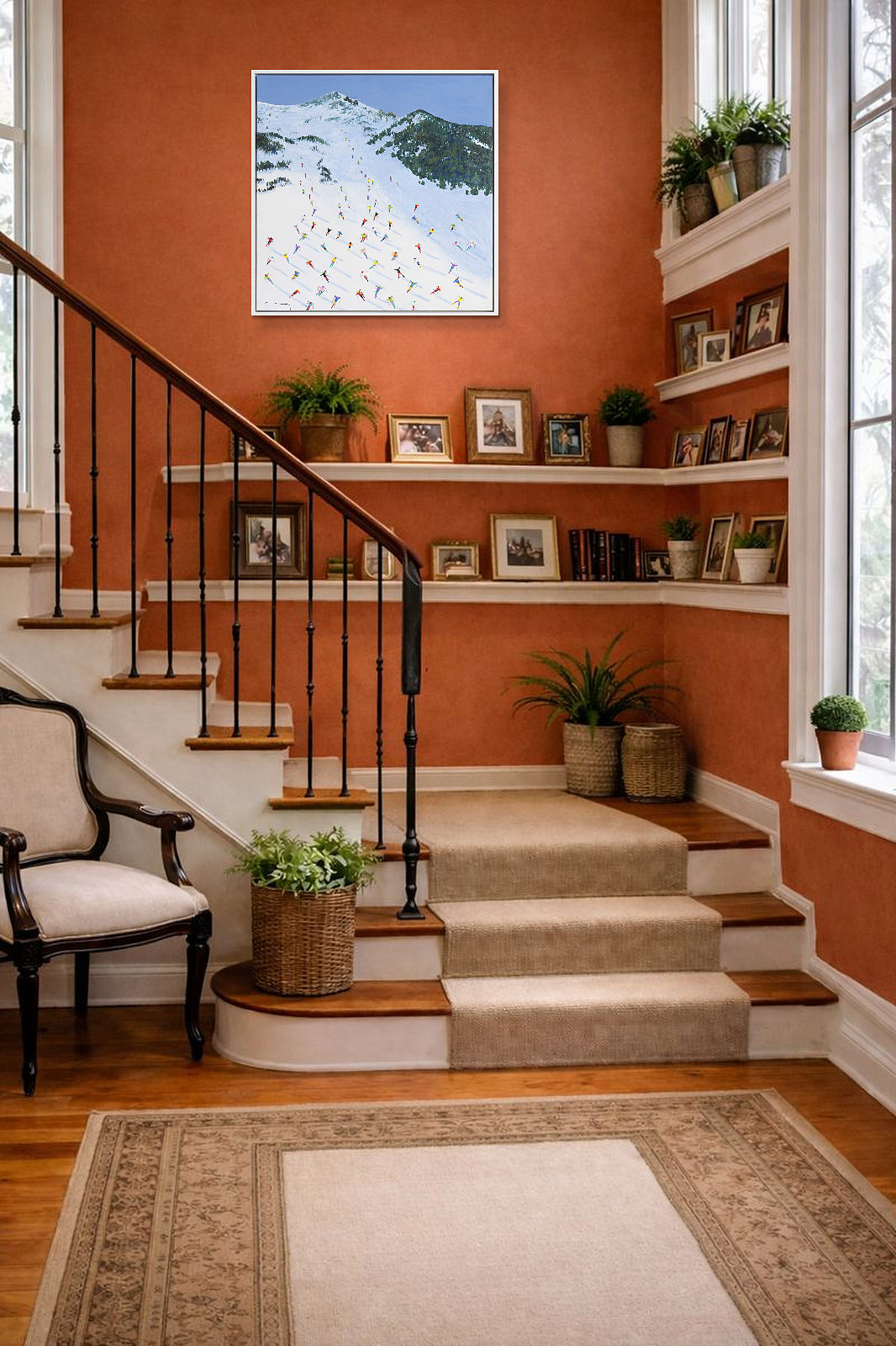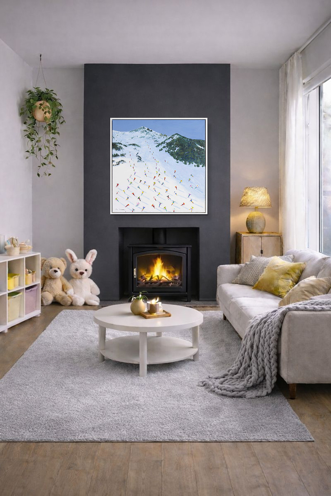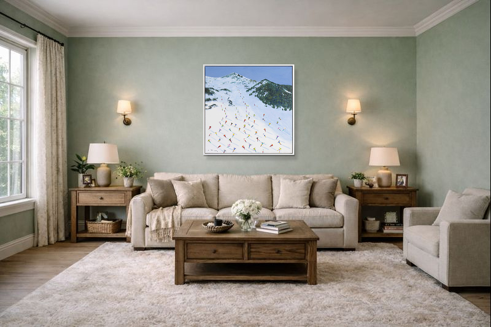 A large colourful painting featuring brightly dressed skiers descending down the slopes in Val D’Isère. With distant mountains and thick paint applied throughout, each person is further textured to bring them out from the canvas giving a fantastic 3D effect. Framed in a stylish white floating frame as shown and ready to hang.
