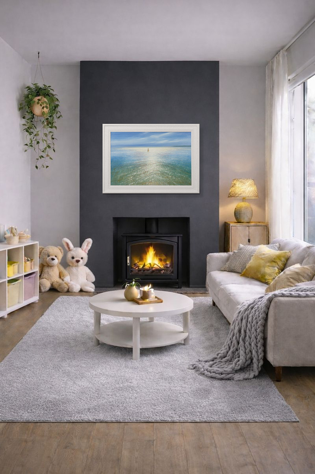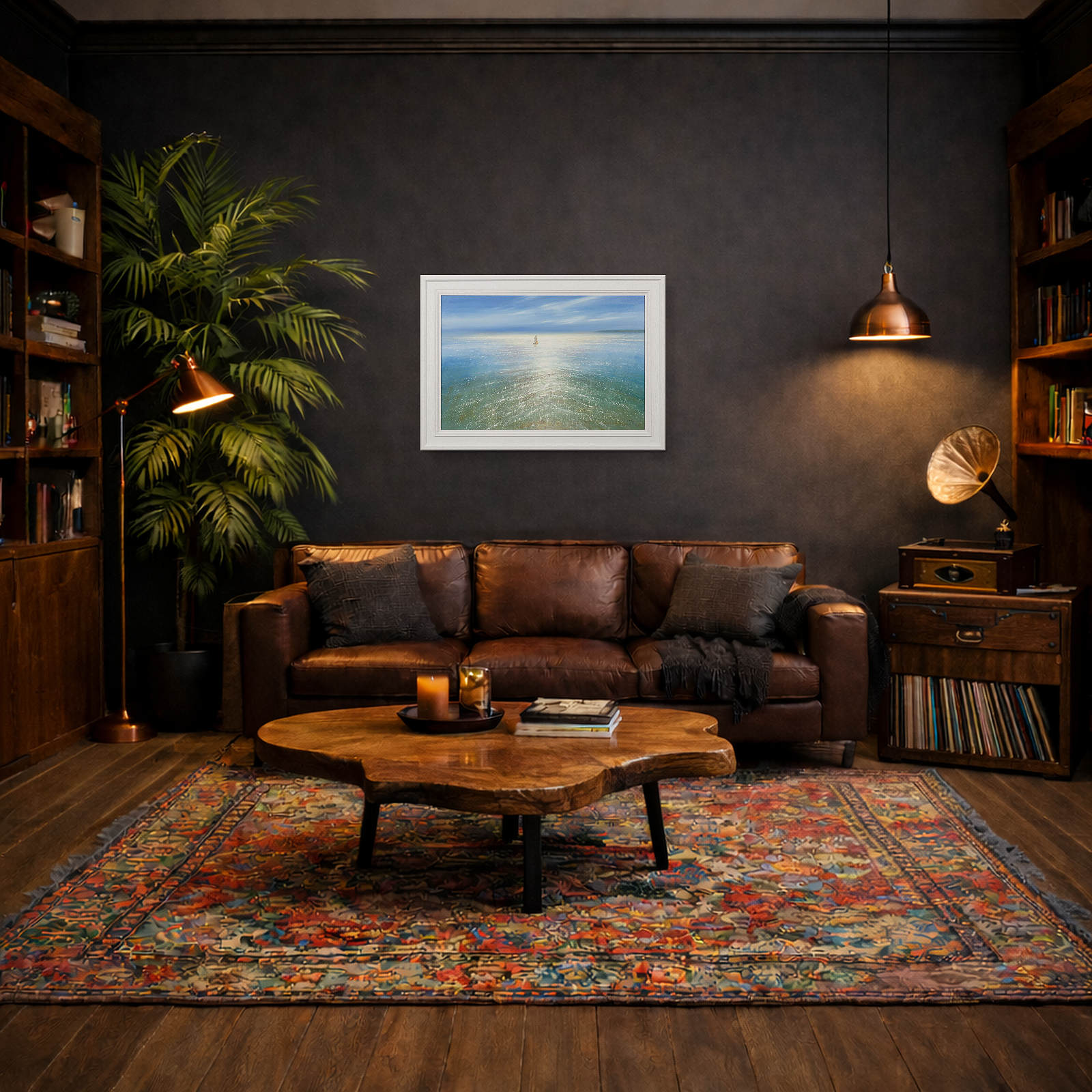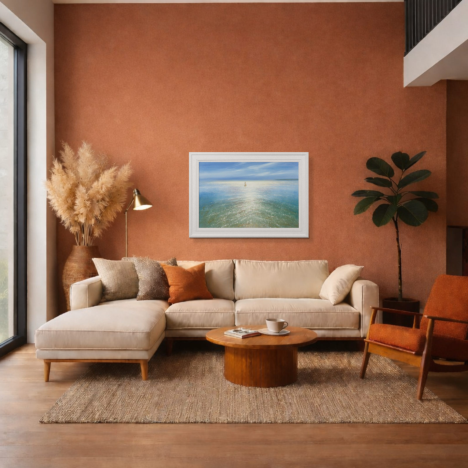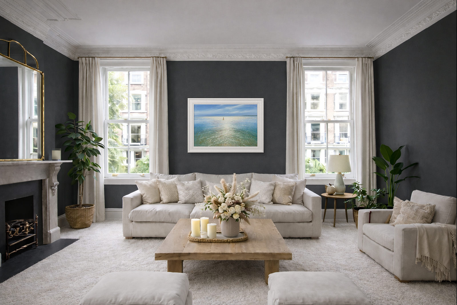 A sparkling seascape by British artist Ben Payne. This original oil painting is presented in a white painted wood frame as shown and ready to hang.