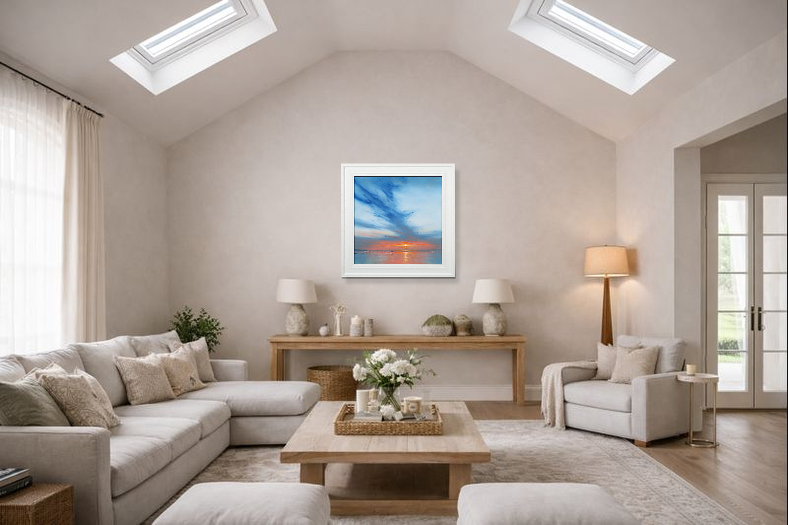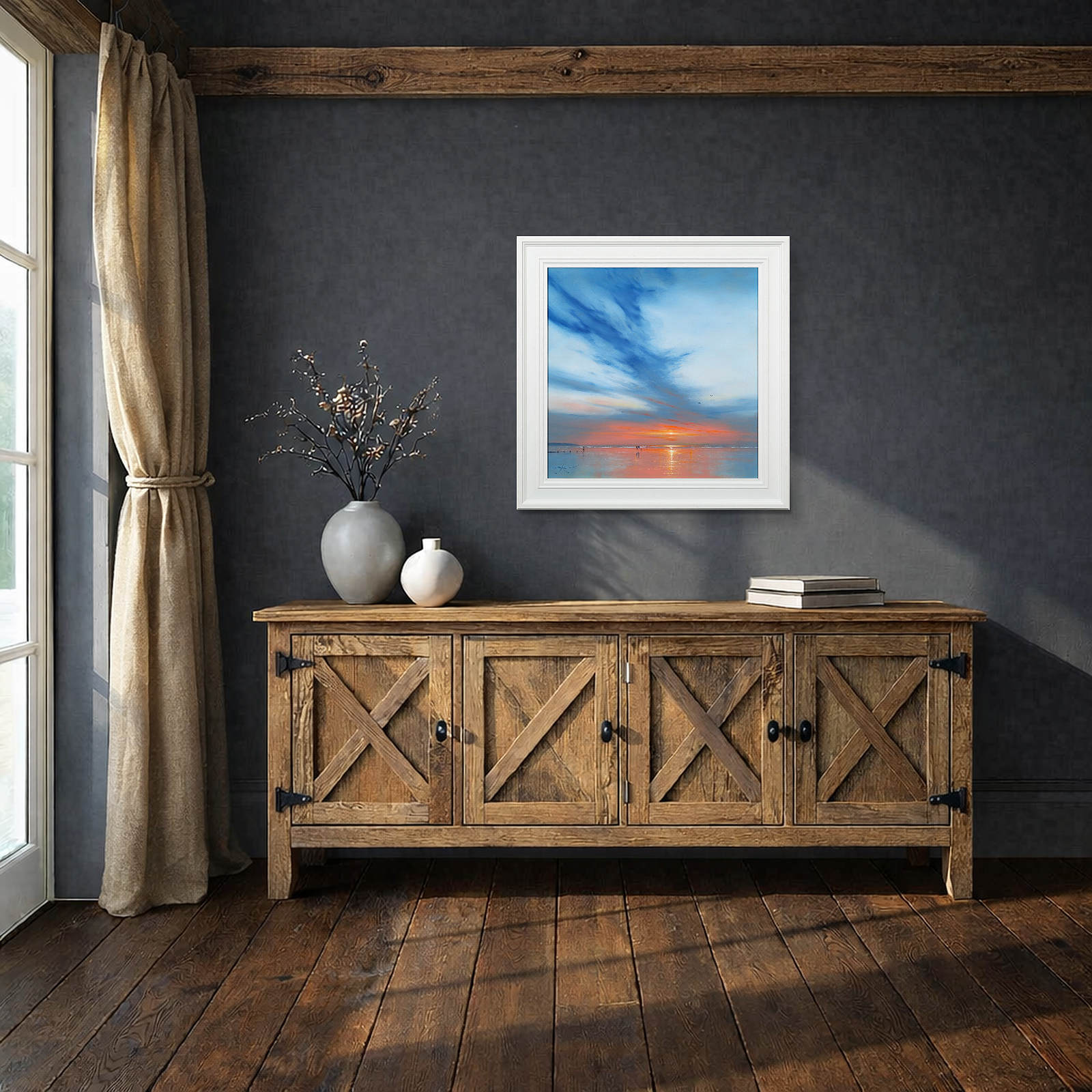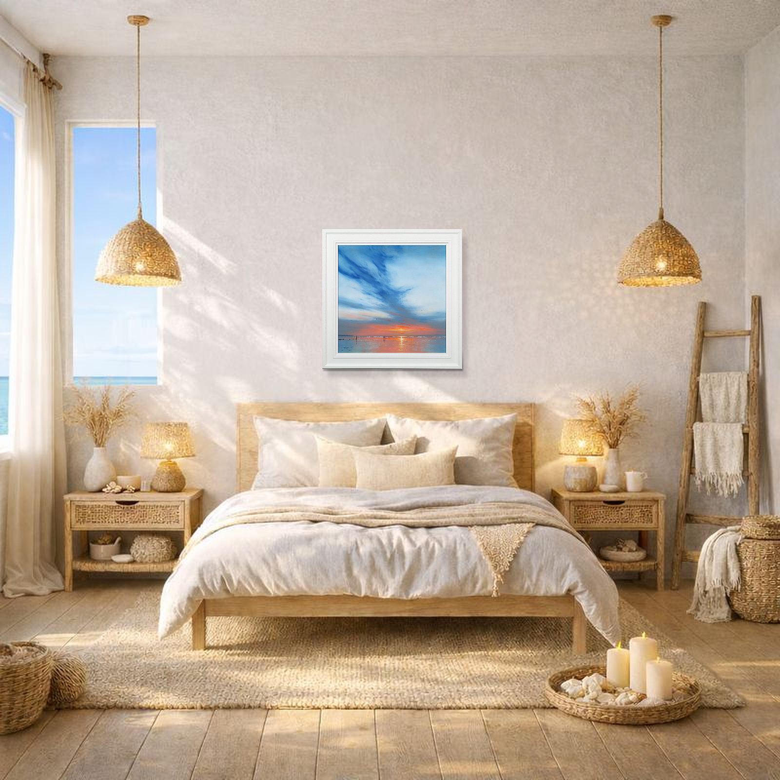A sumptuous seascape by British artist Ben Payne. Presented in white painted wood frame as shown and ready to hang.