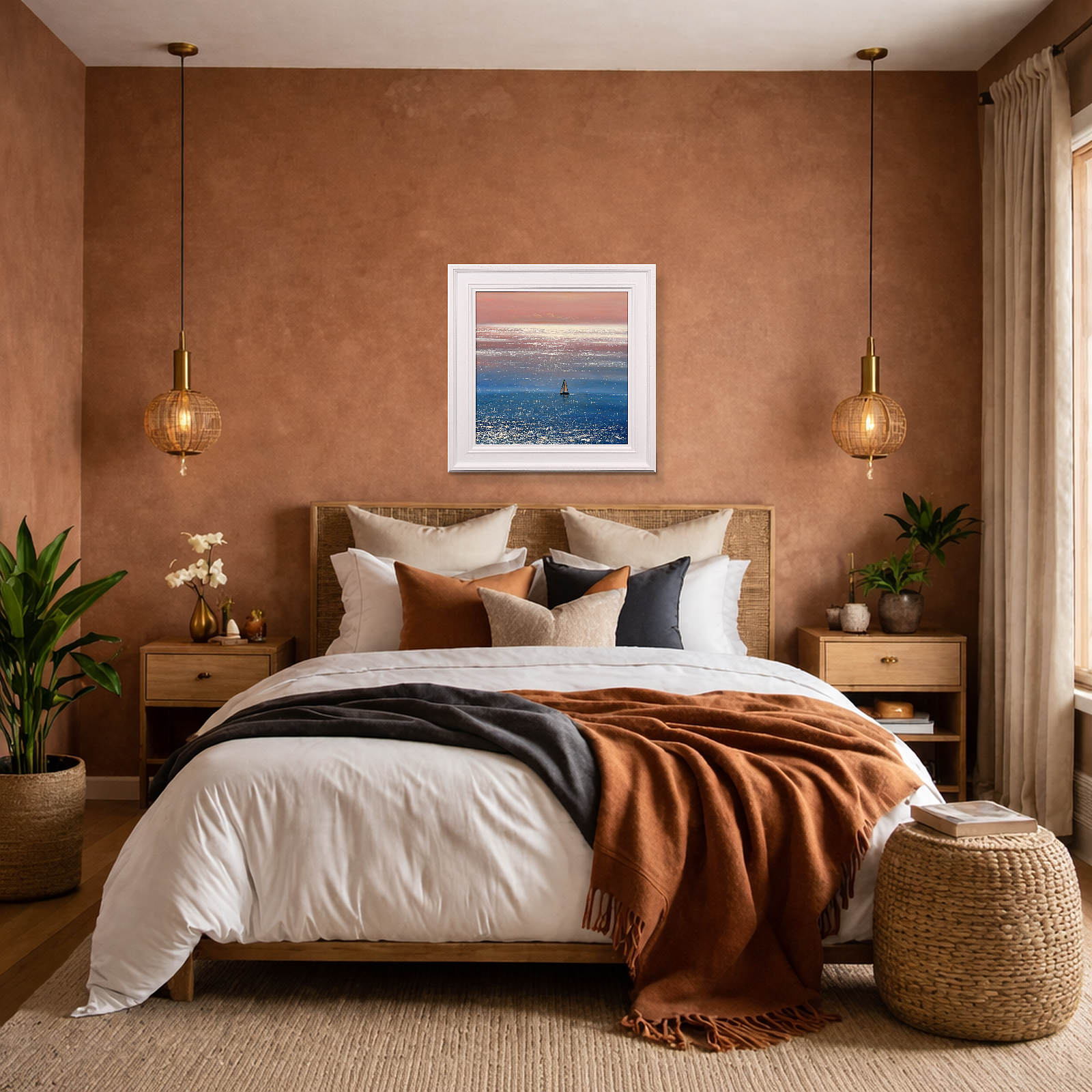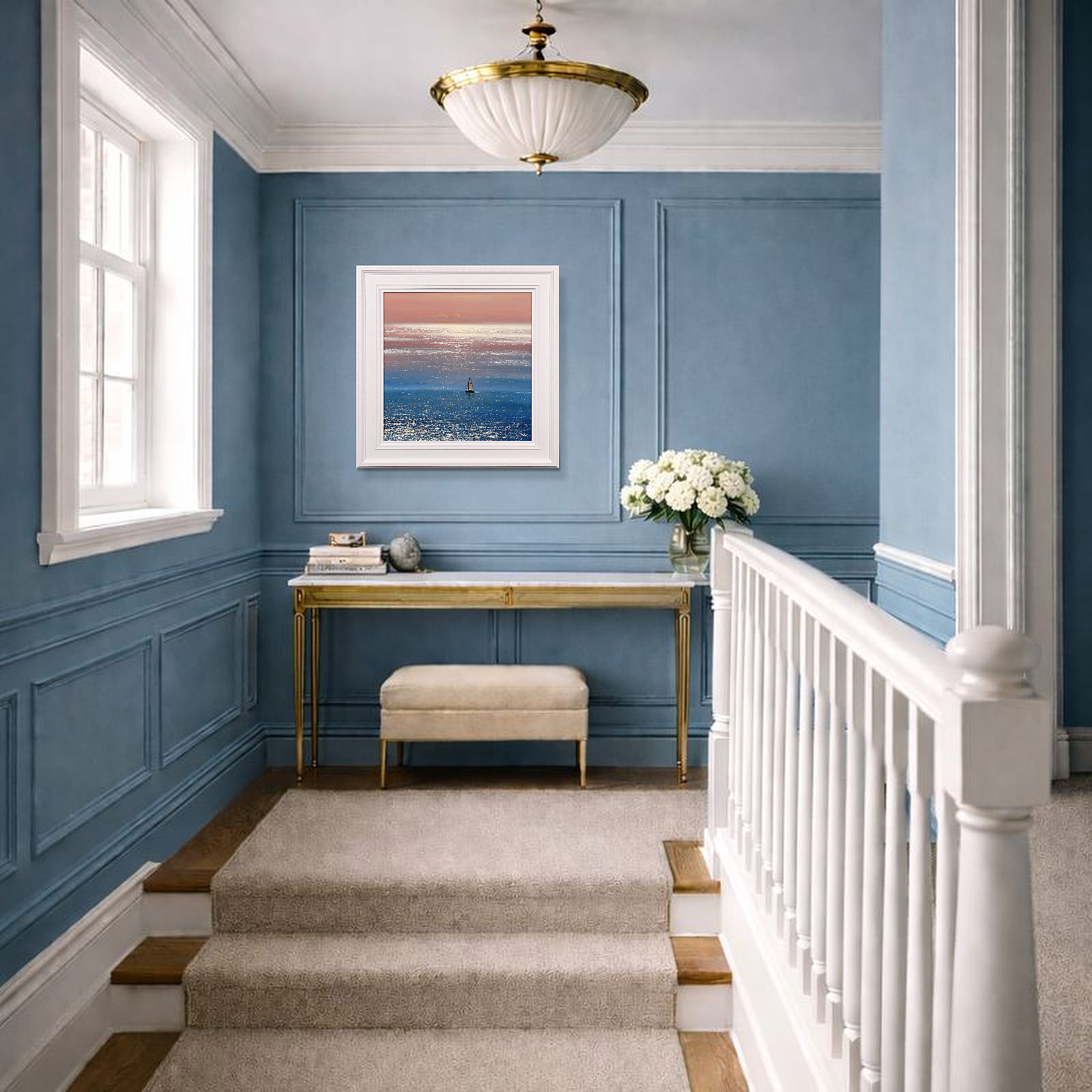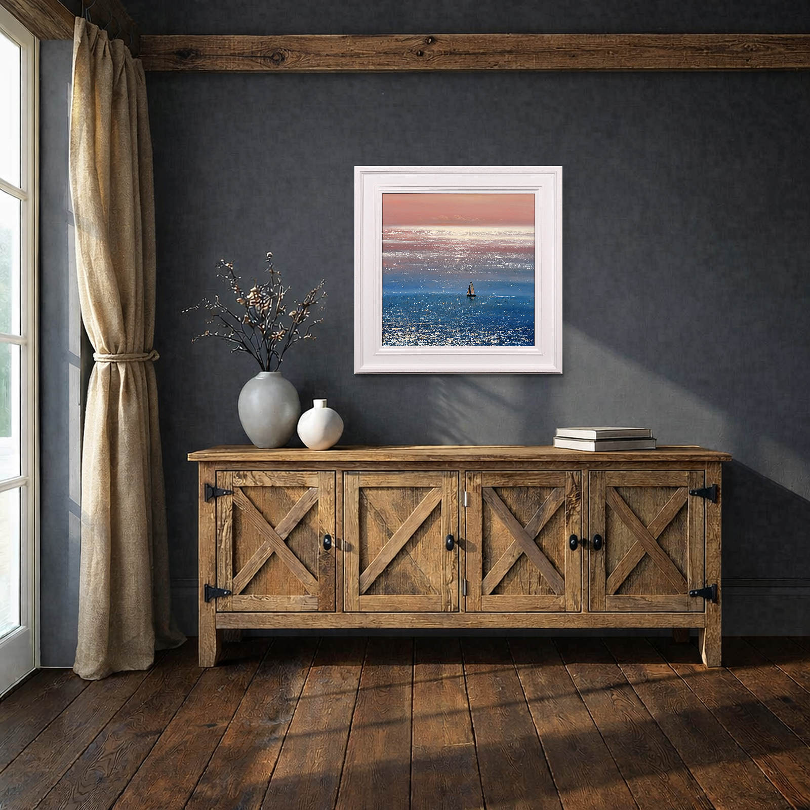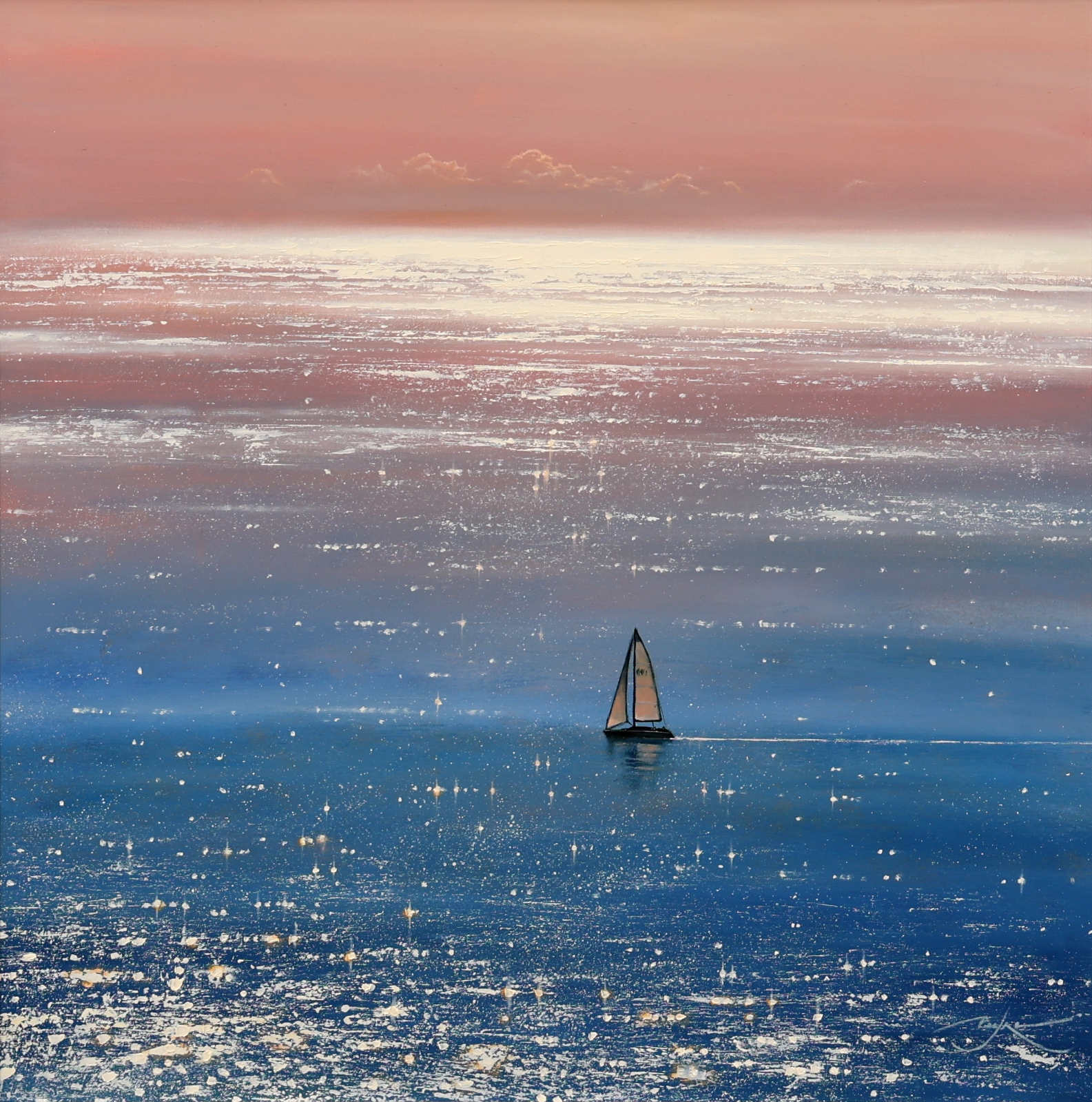 A sparkling seascape by British artist Ben Payne. Presented in white painted wood frame as shown and ready to hang.