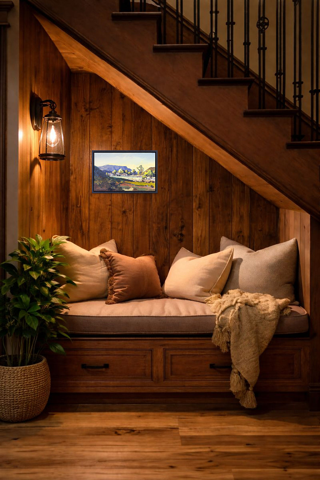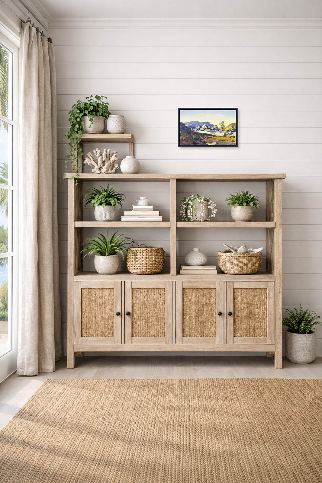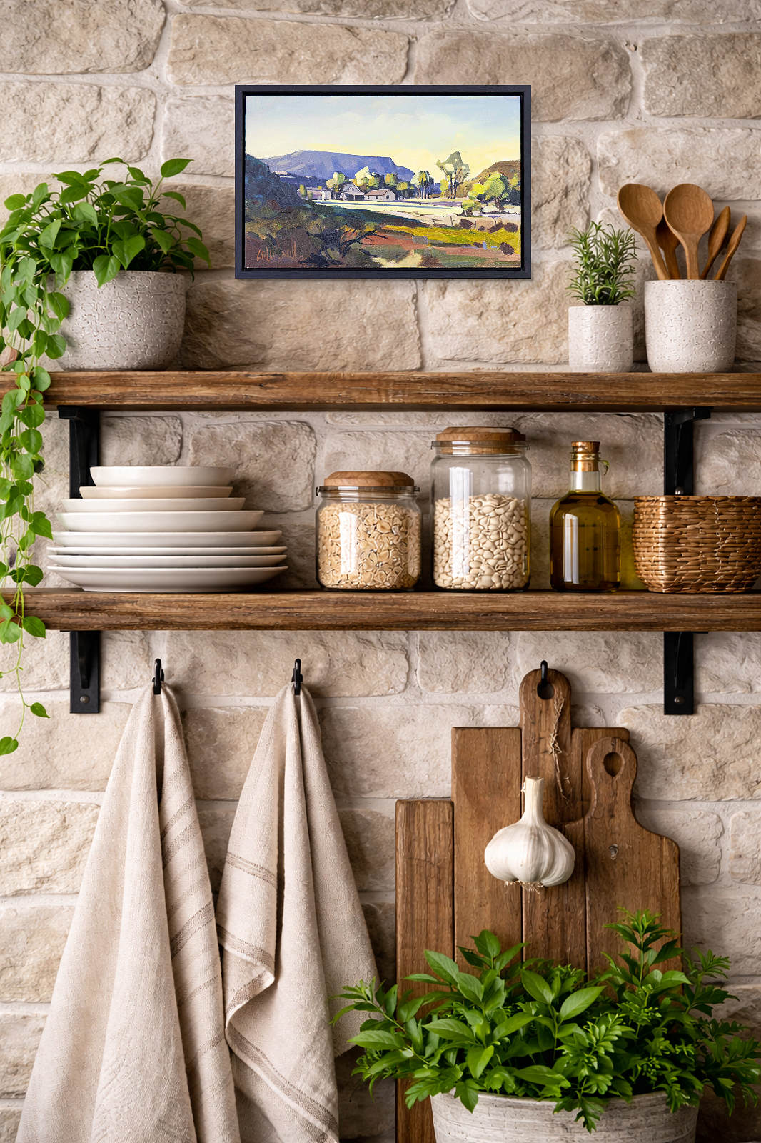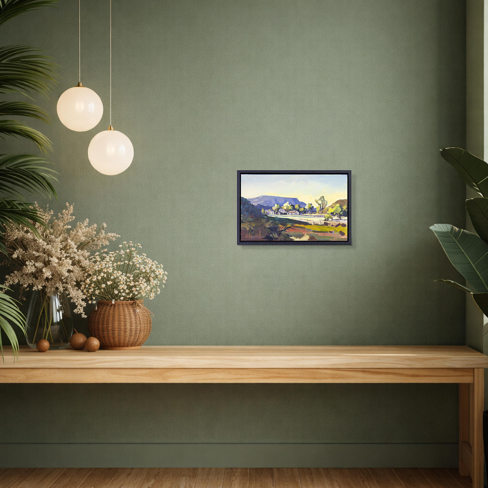 A quiet day on the ranch provides a gorgeous and subtle painting by South African born artist Carla Bosch. Presented in a contemporary black frame as shown and ready to display.