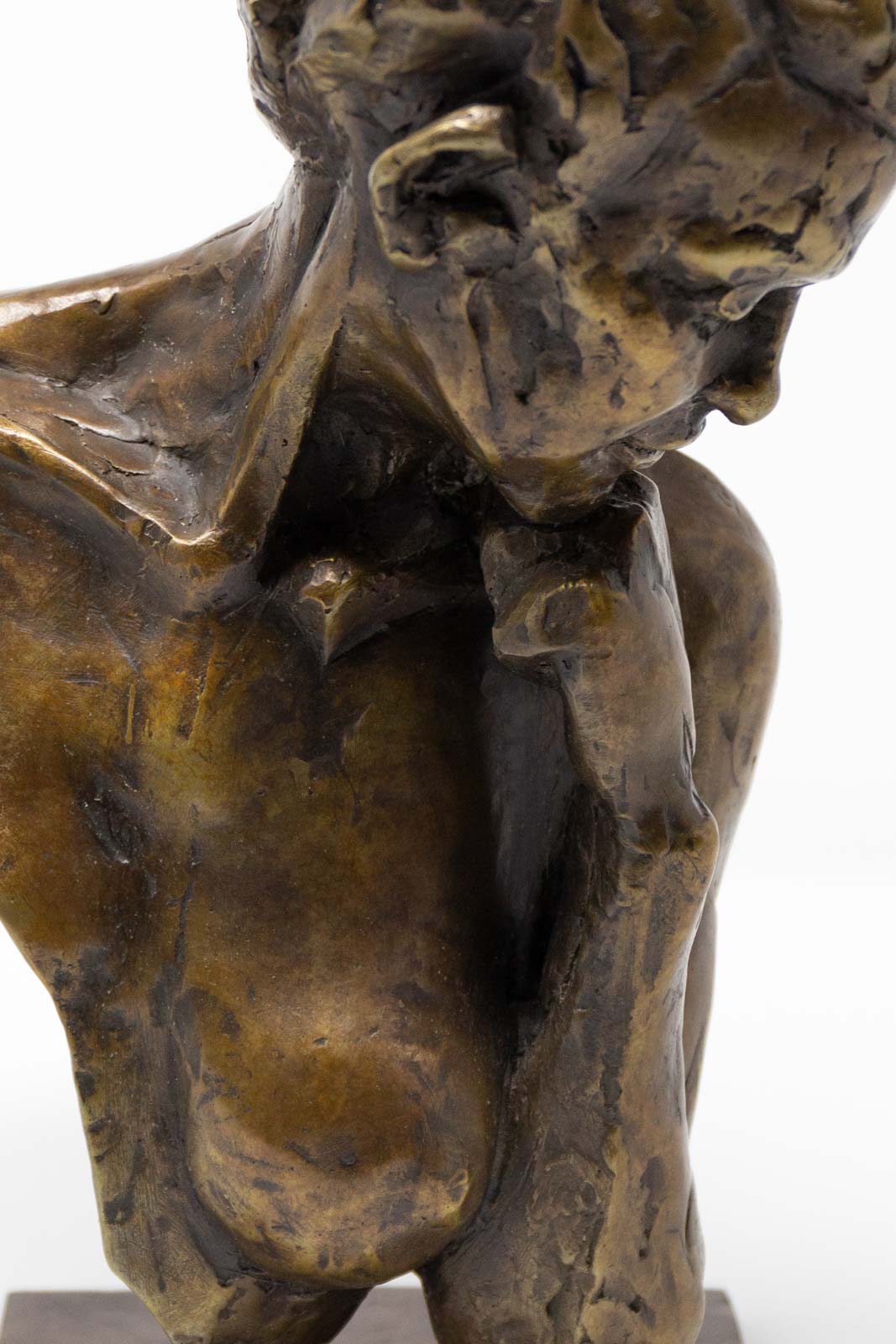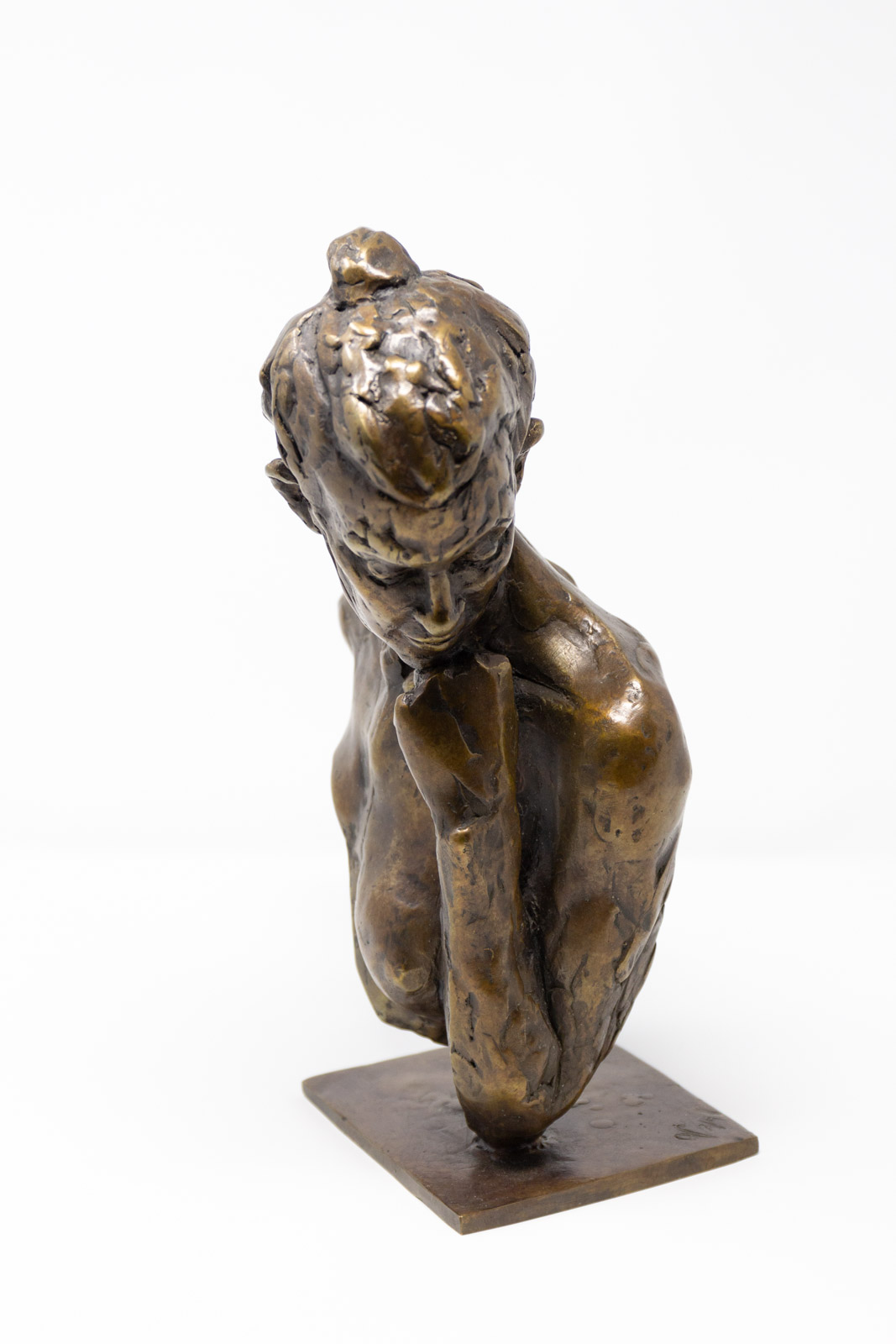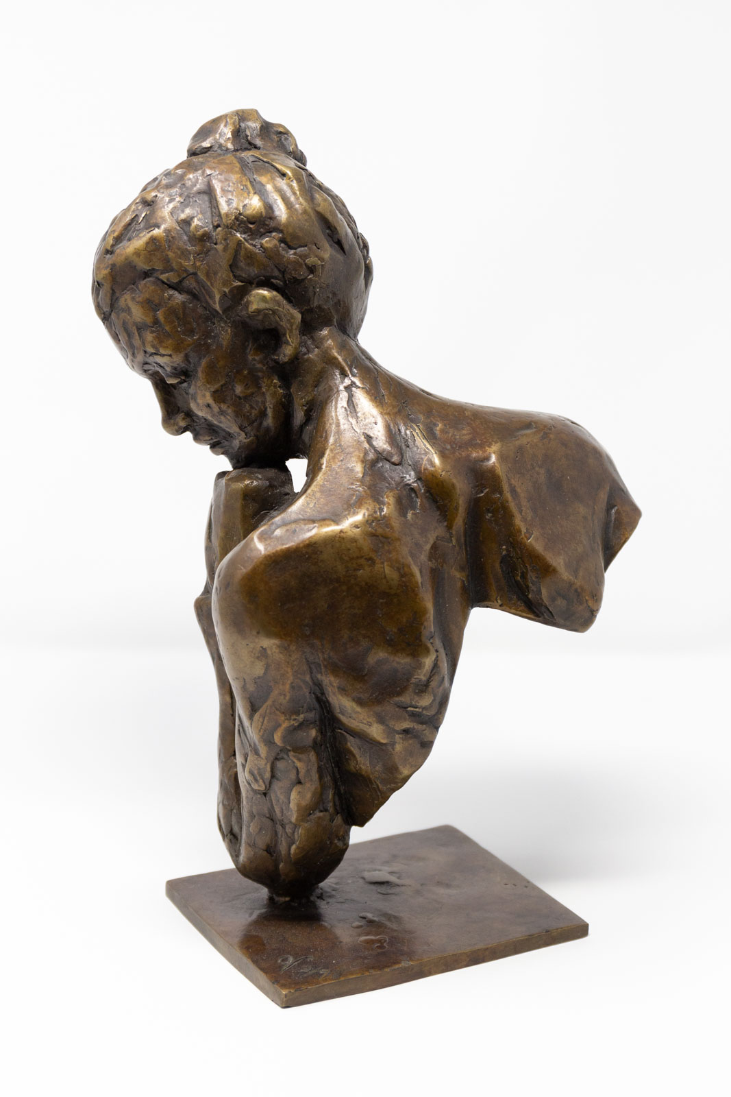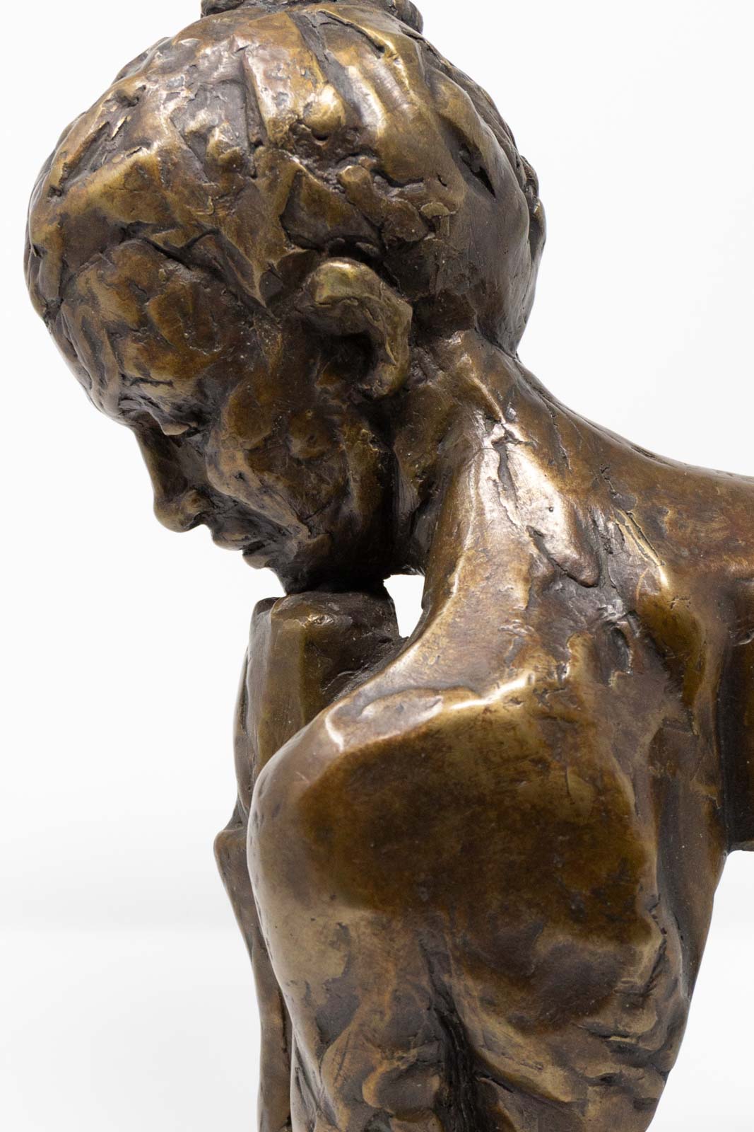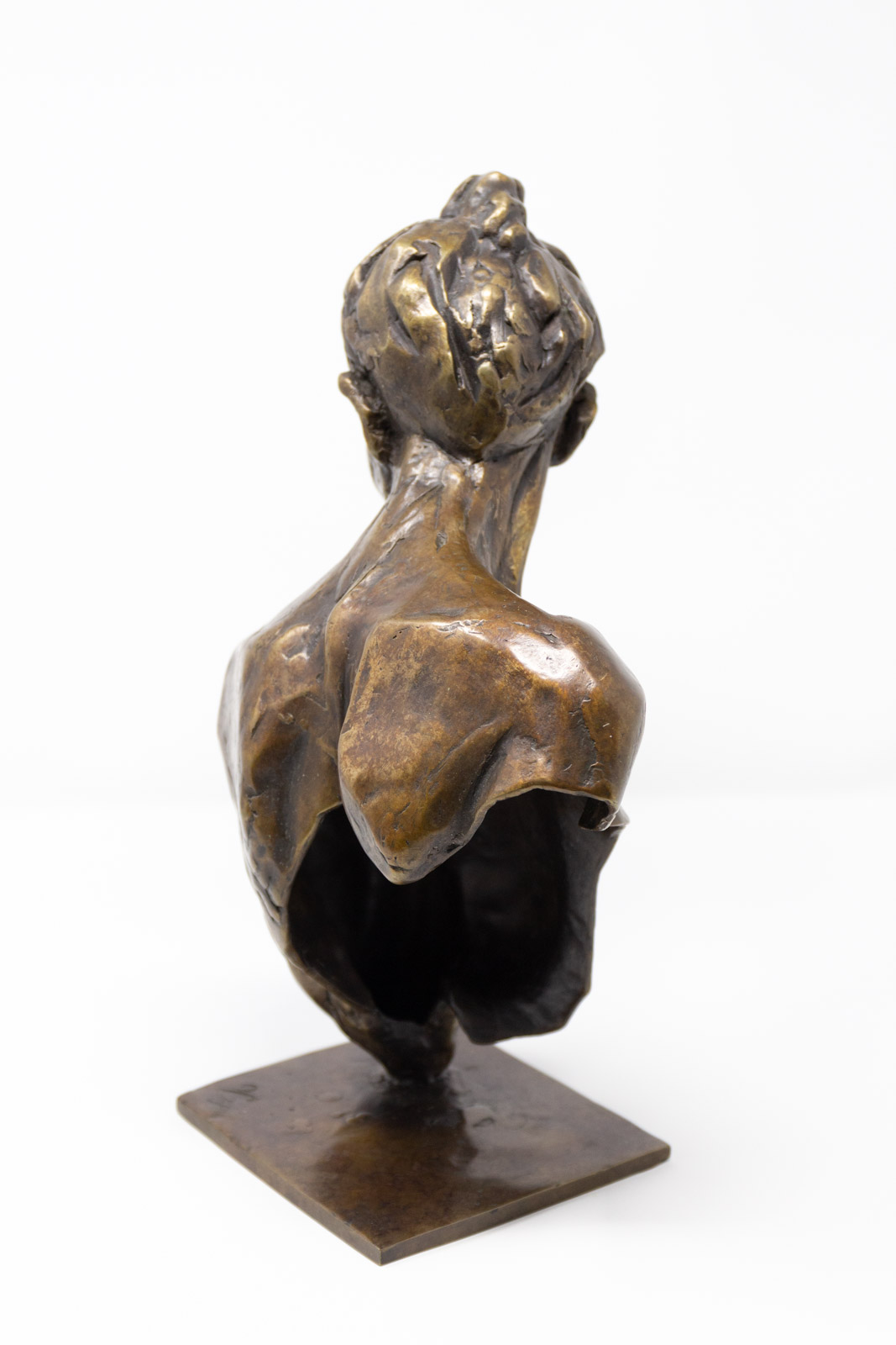 The materiality of her practice mirrors these shape-shifting processes through her bronze casting methods, in which figurative forms are enhanced by experimental burnouts of organic matter as a development of the lost wax casting method. Material such as feathers and local flora are burnt out directly as part of the sculptural form, combining strong outlines with an intense level of detail which ties the final work inextricably to the landscape from which it is derived.