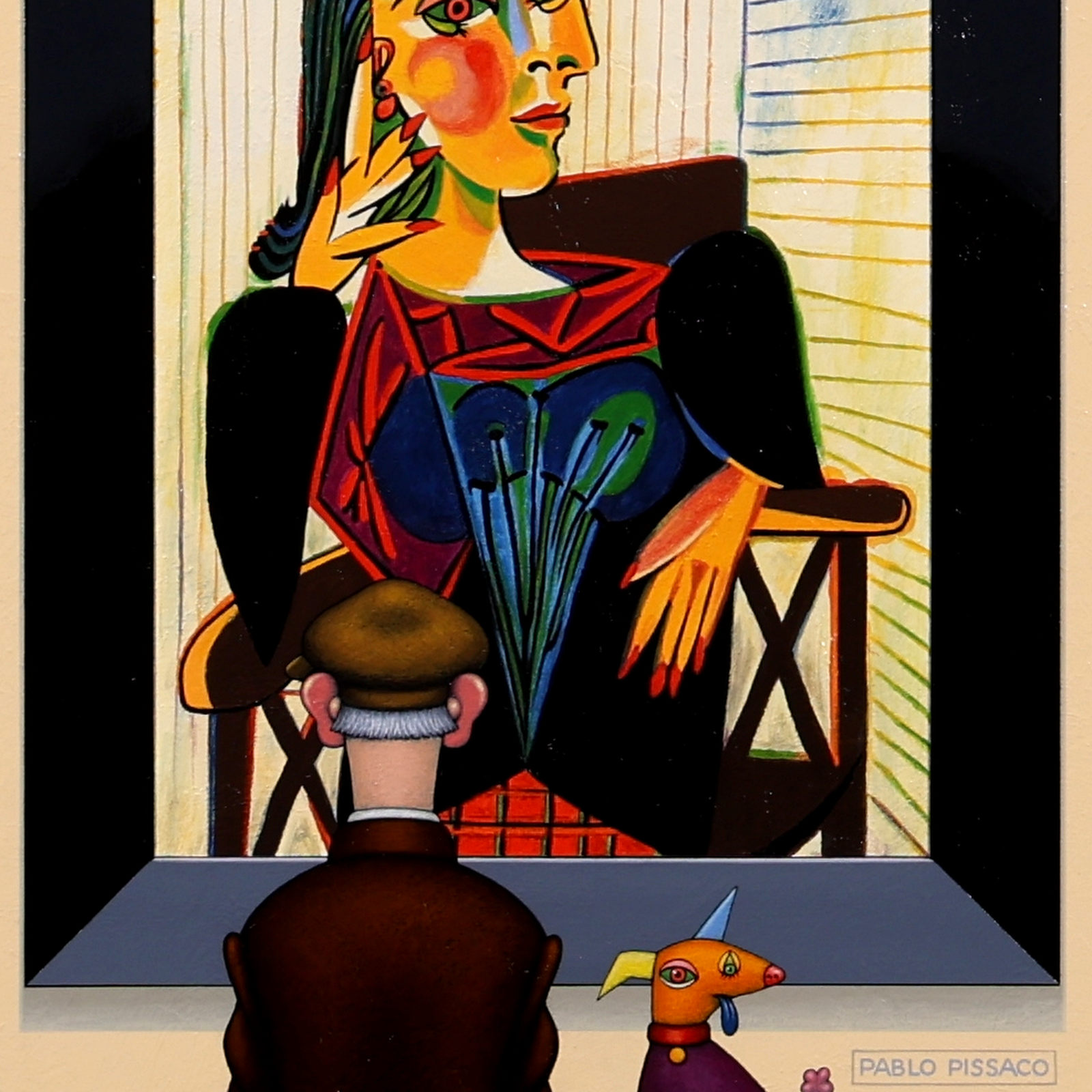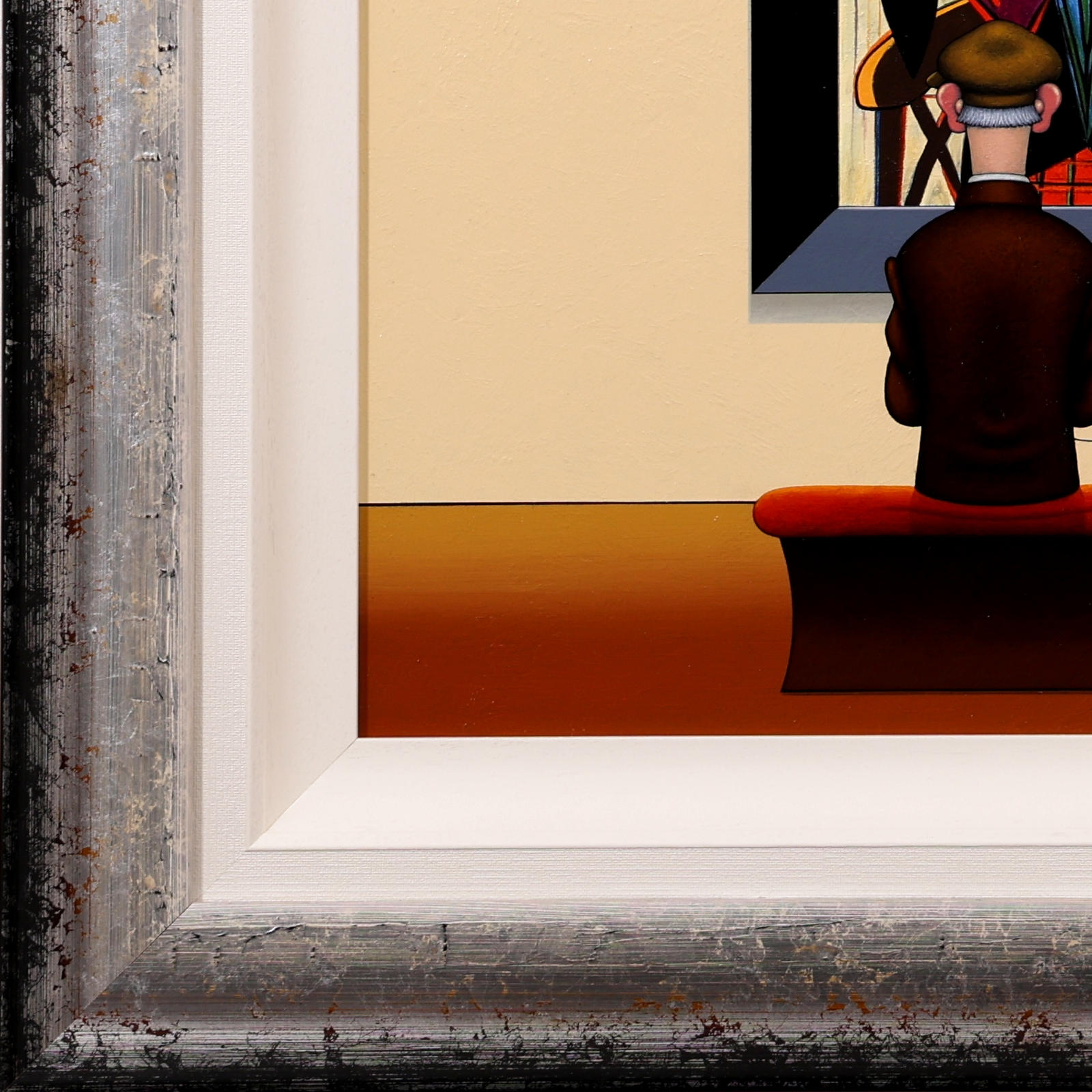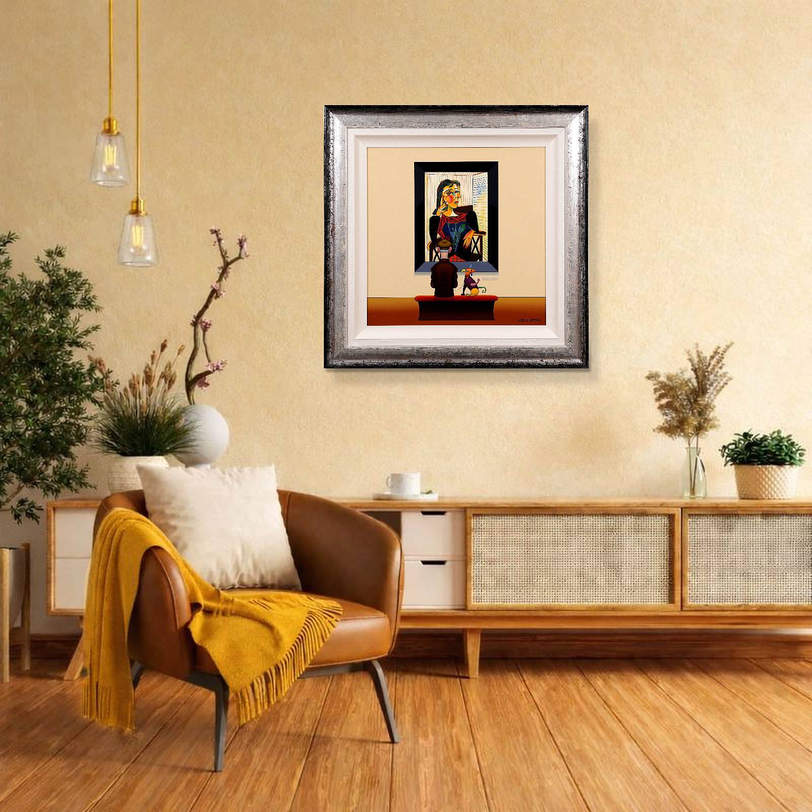A fun and characterful original painting by Chris Chapman, created in the spirit of Pablo Picasso’s iconic style. Framed with a white slip and dappled silver wooden frame, as shown, and ready to hang.