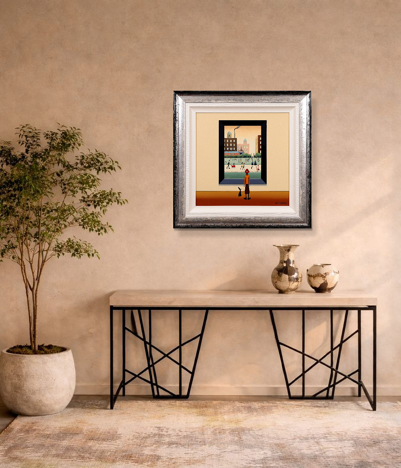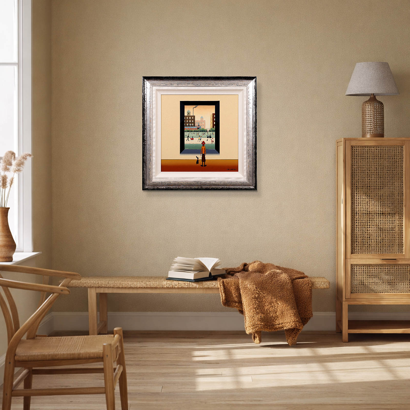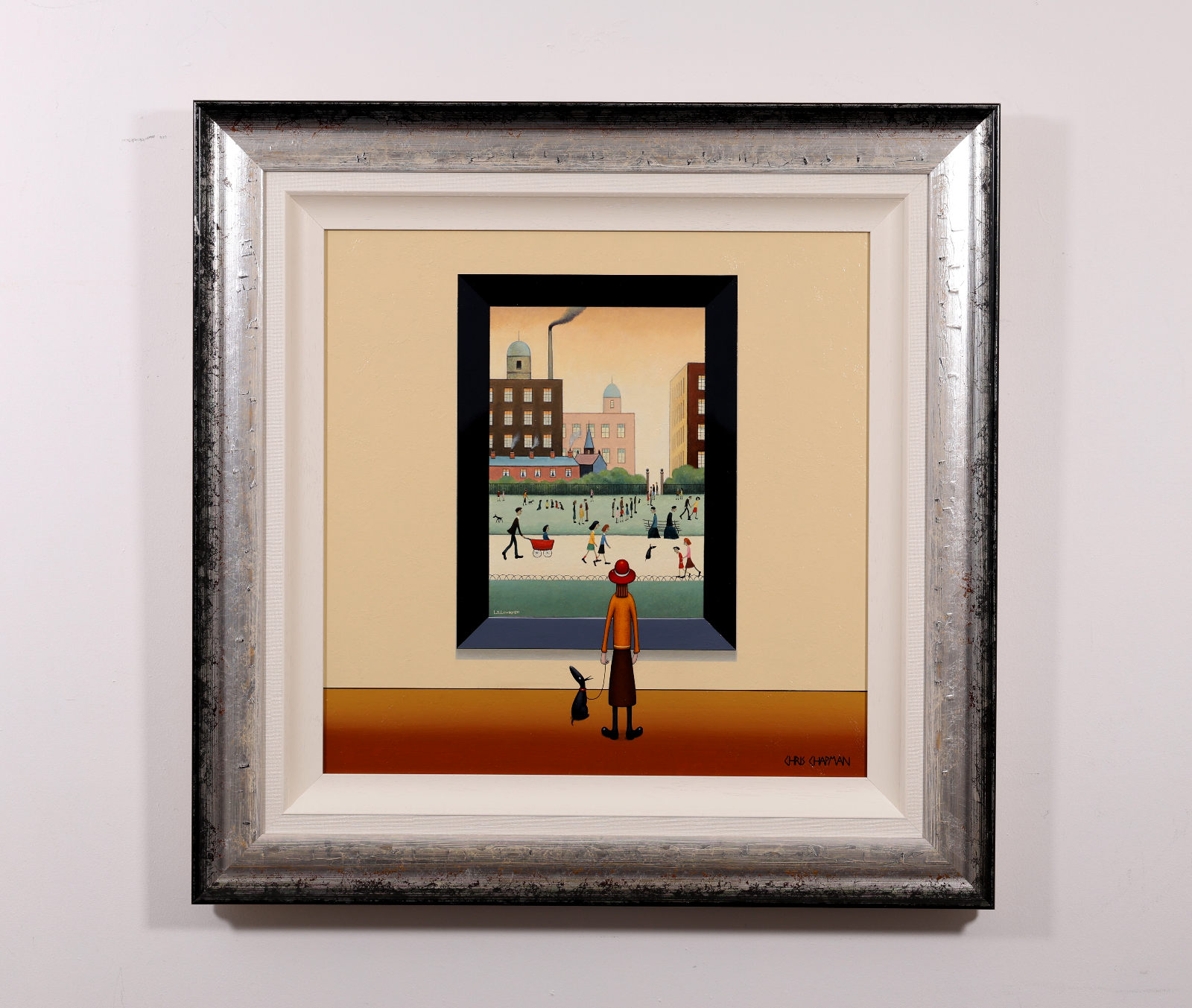 A fun and characterful original painting by Chris Chapman, created in the spirit of L.S. Lowry’s iconic style. Framed with a white slip and dappled silver wooden frame, as shown, and ready to hang.
