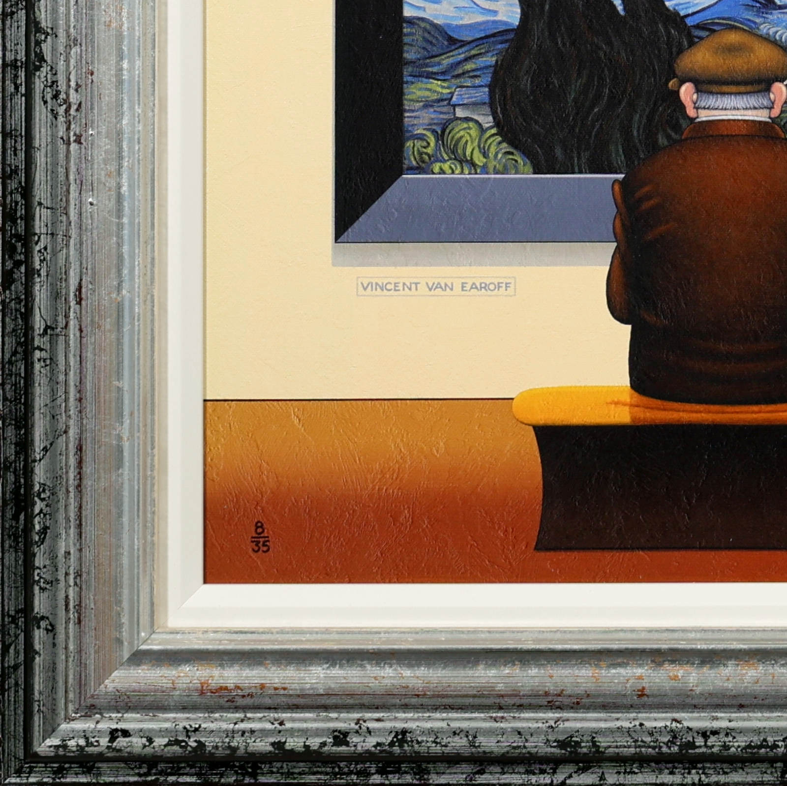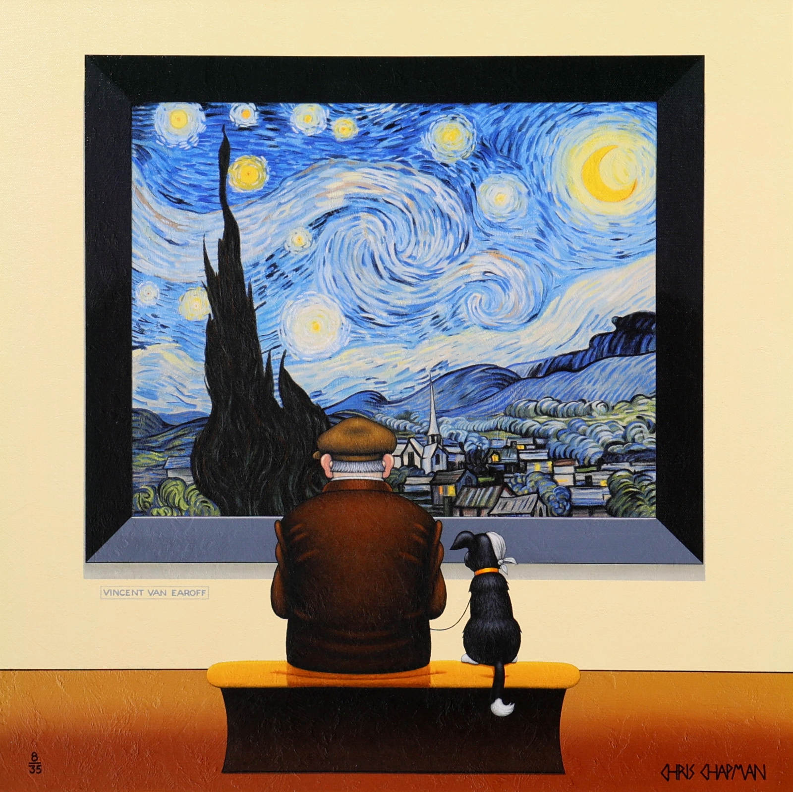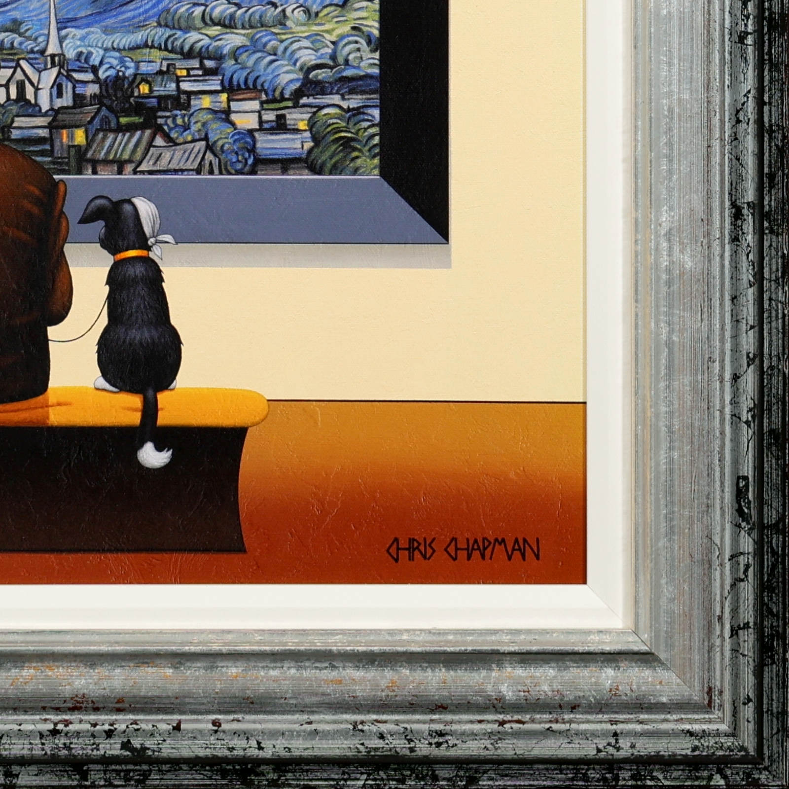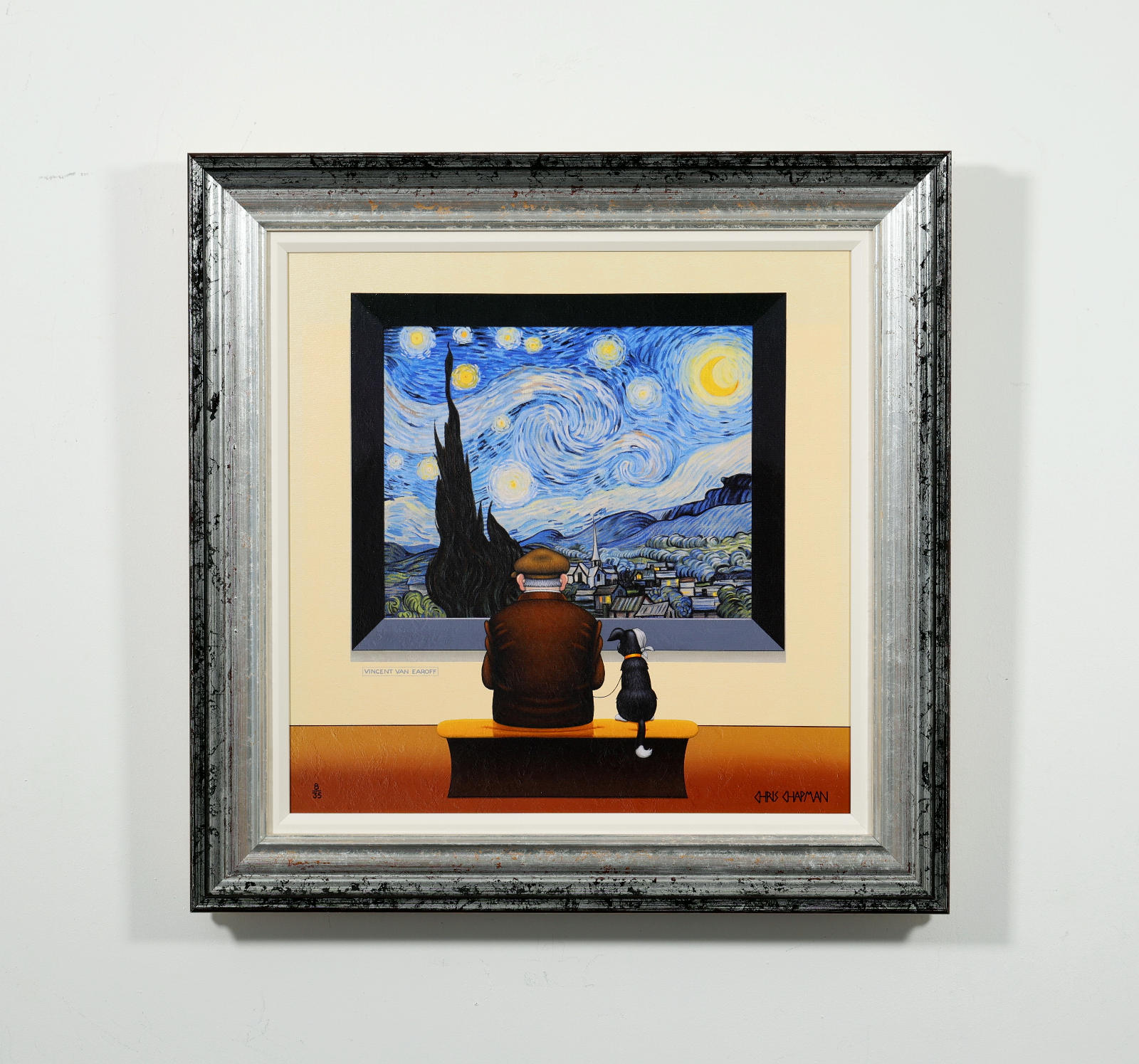 Chris Chapman Van Gogh inspired print, forming part of the ‘Artist Series’. Clever and humorous, taking inspiration from the iconic Starry Night collection of paintings by Vincent Van Gogh. Limited edition of 35. Framed in a contemporary distressed frame with white slip (as shown).