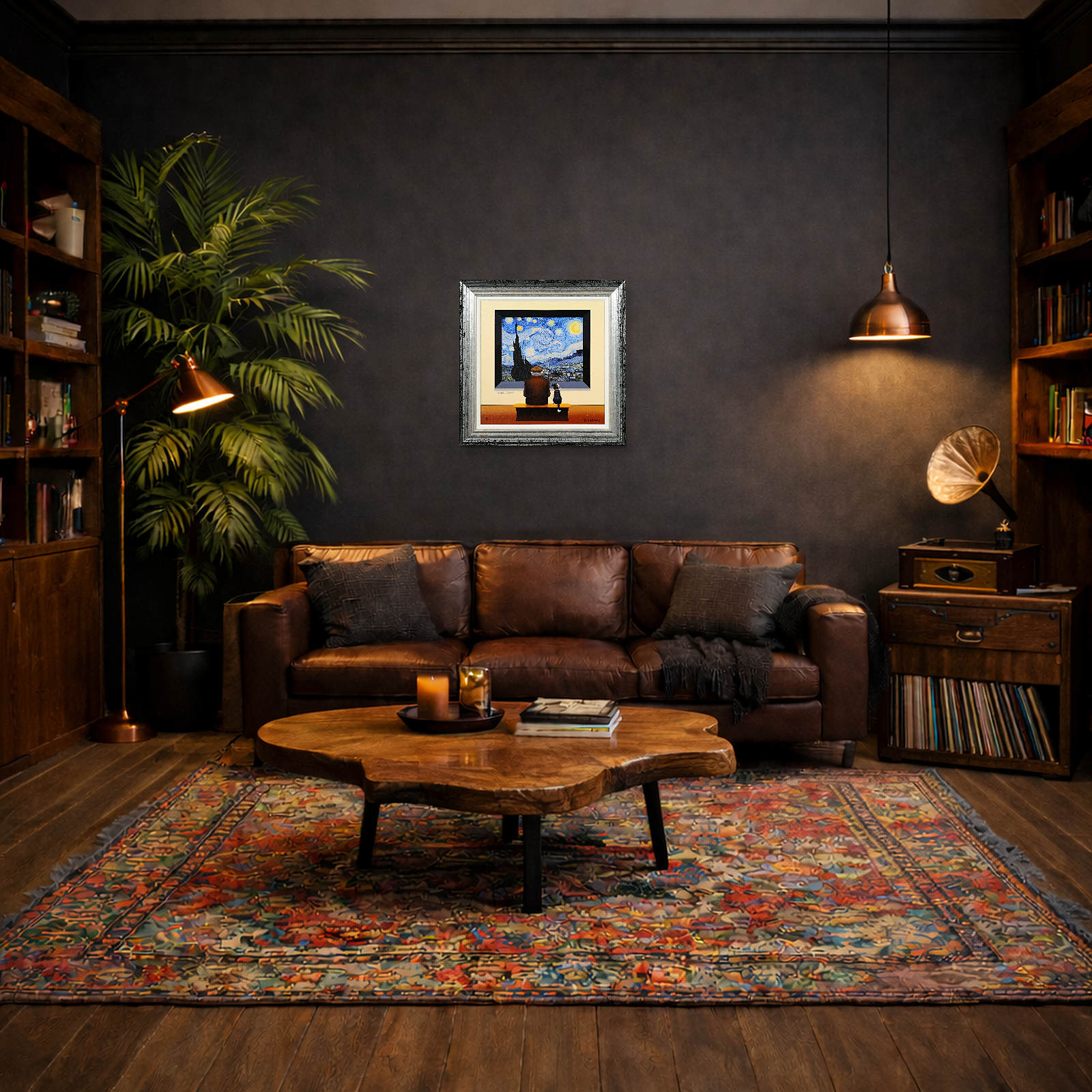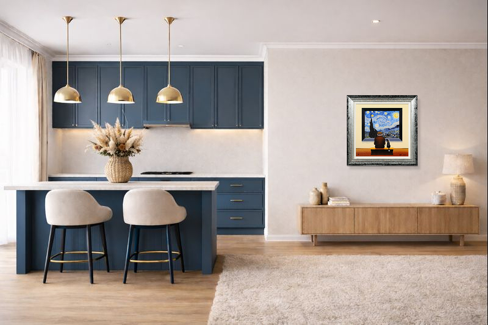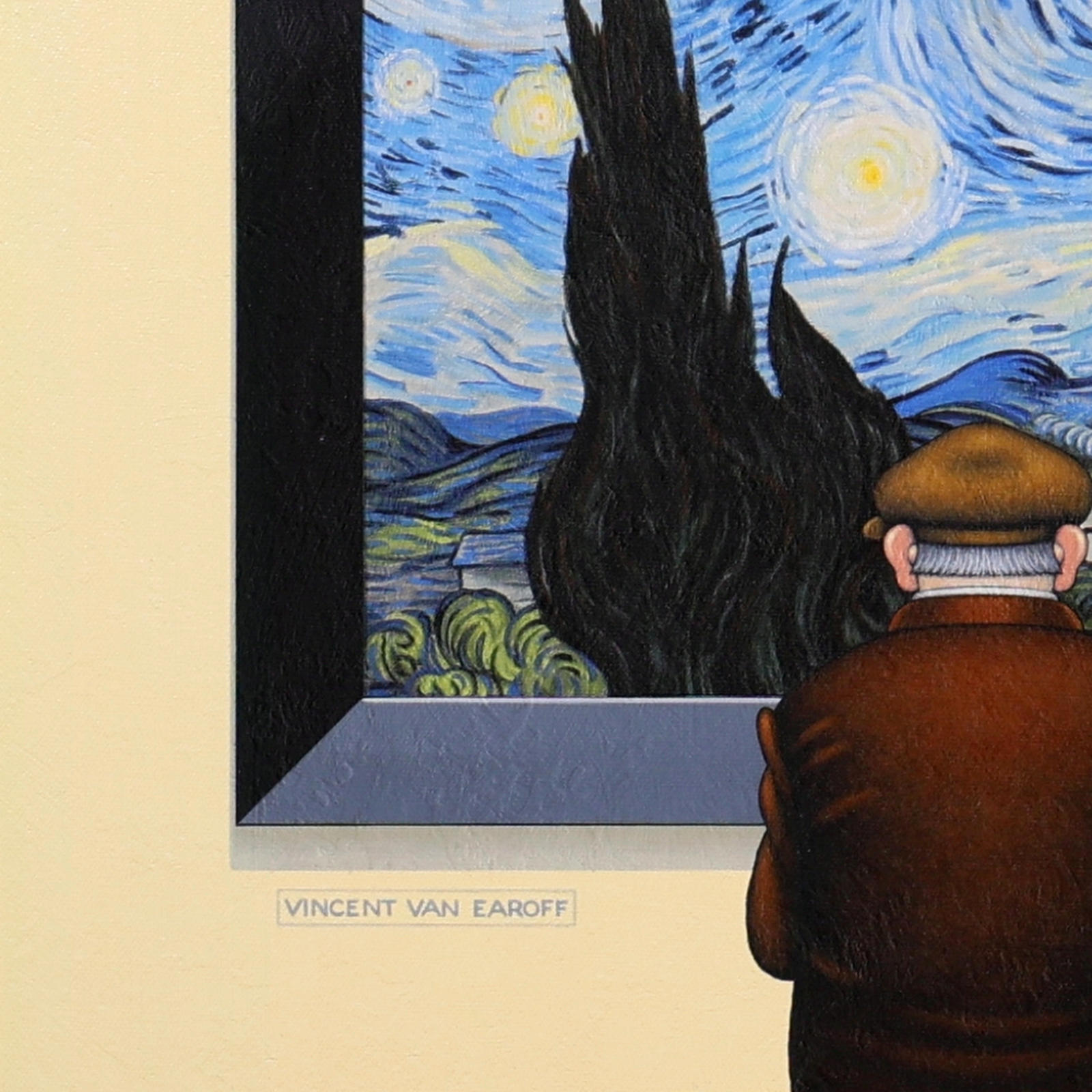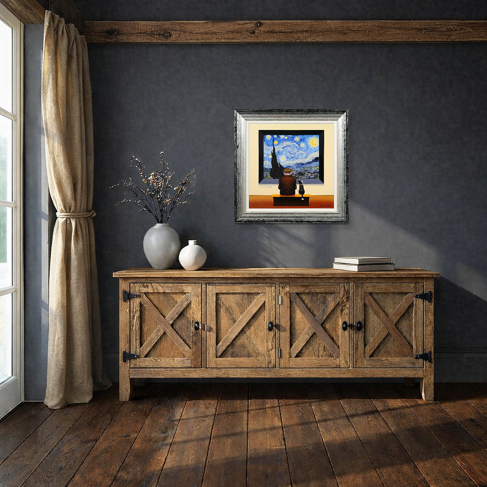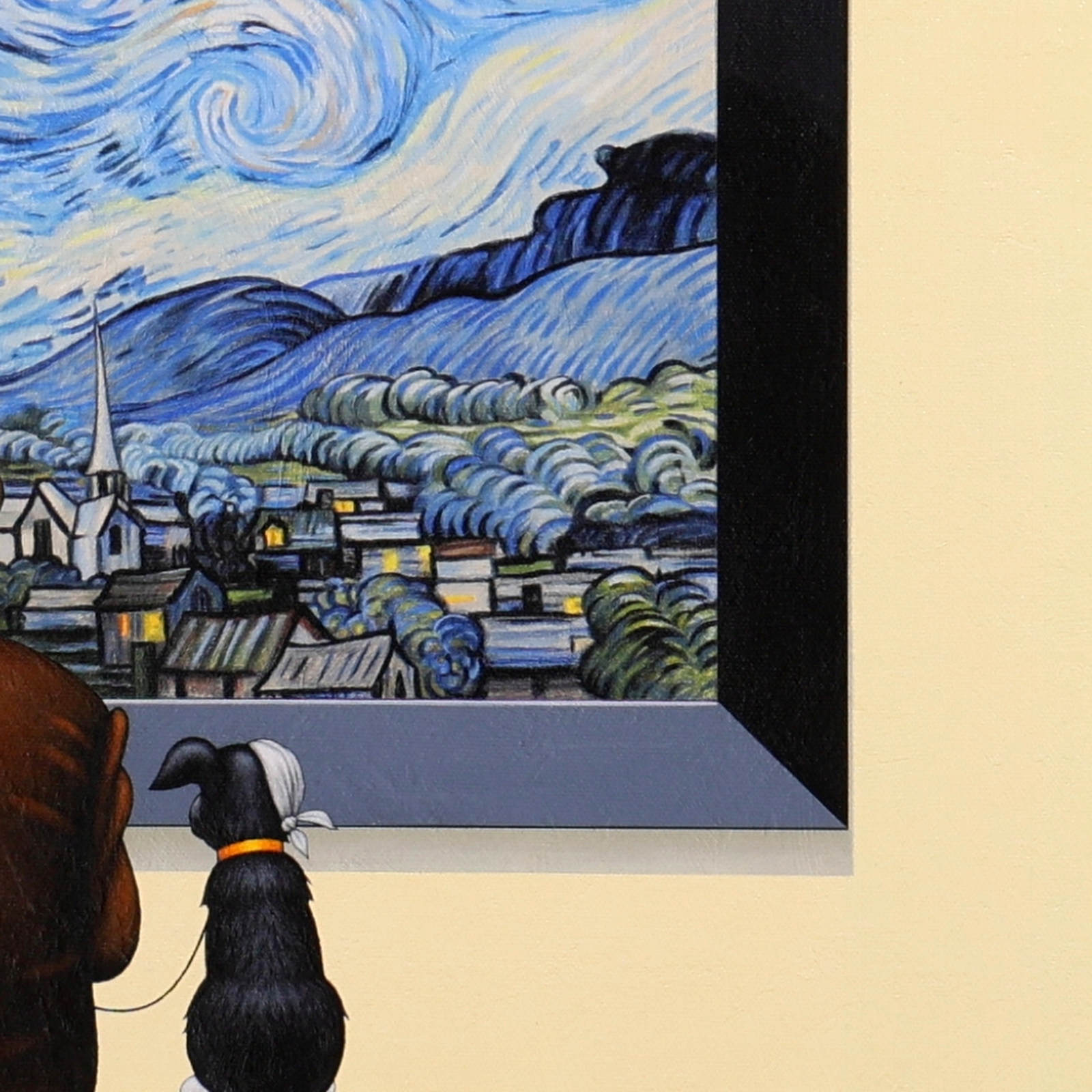 Chris Chapman Van Gogh inspired print, forming part of the ‘Artist Series’. Clever and humorous, taking inspiration from the iconic Starry Night collection of paintings by Vincent Van Gogh. Limited edition of 35. Framed in a contemporary distressed frame with white slip (as shown).