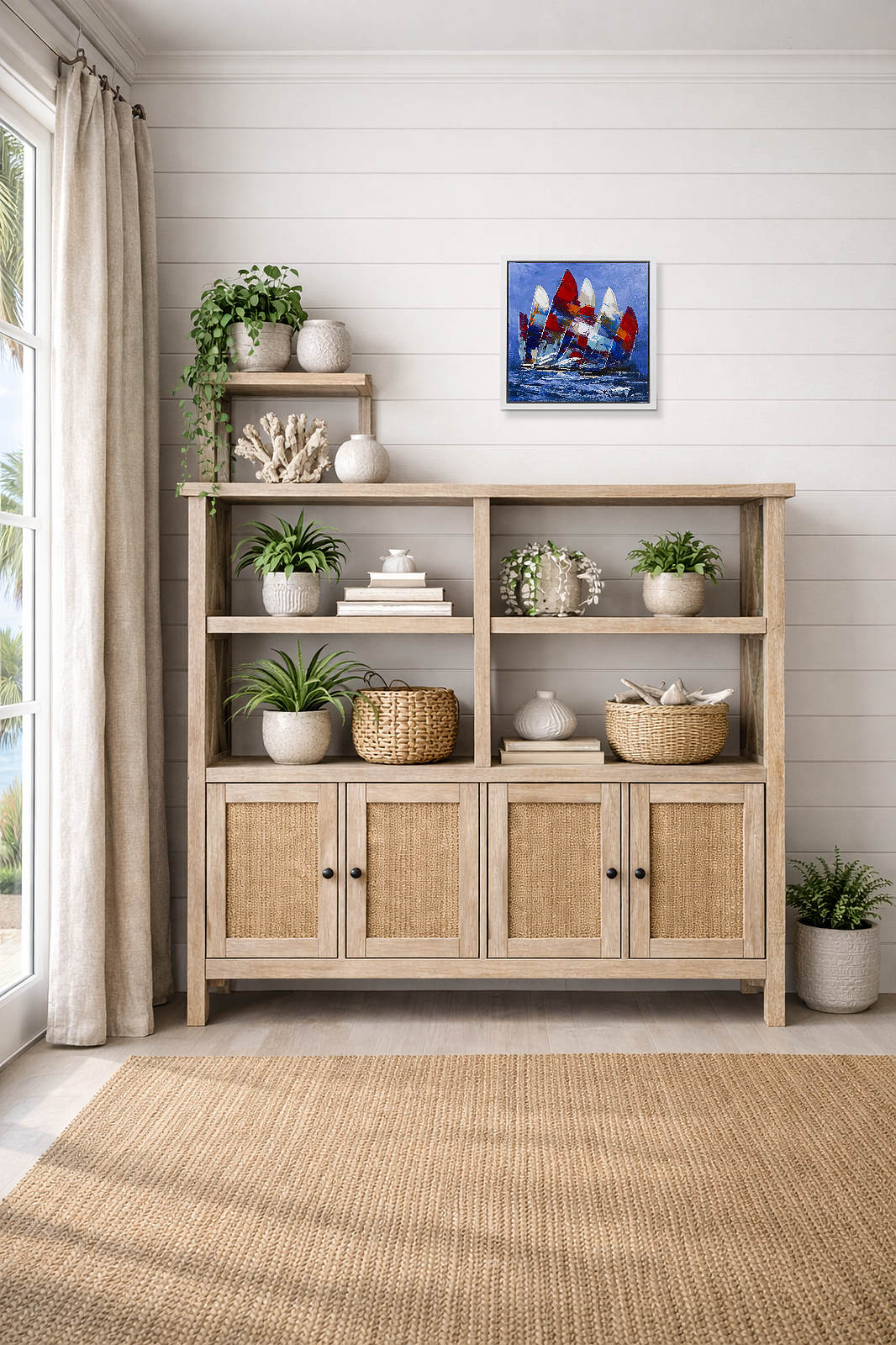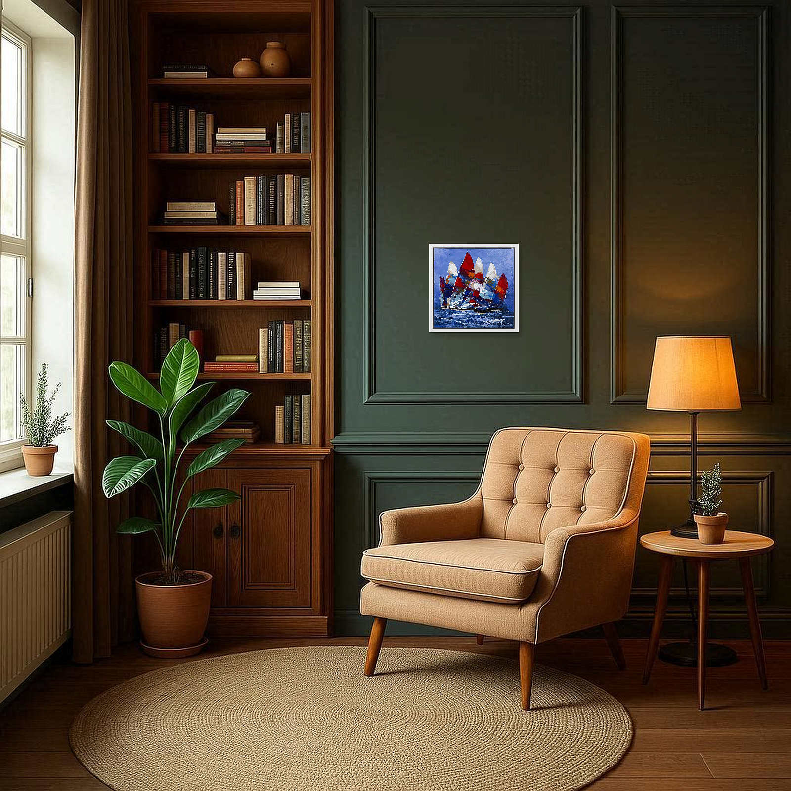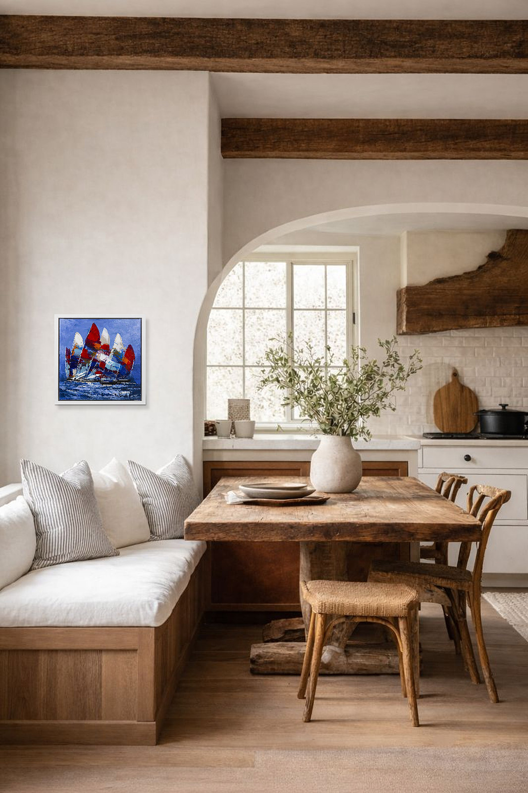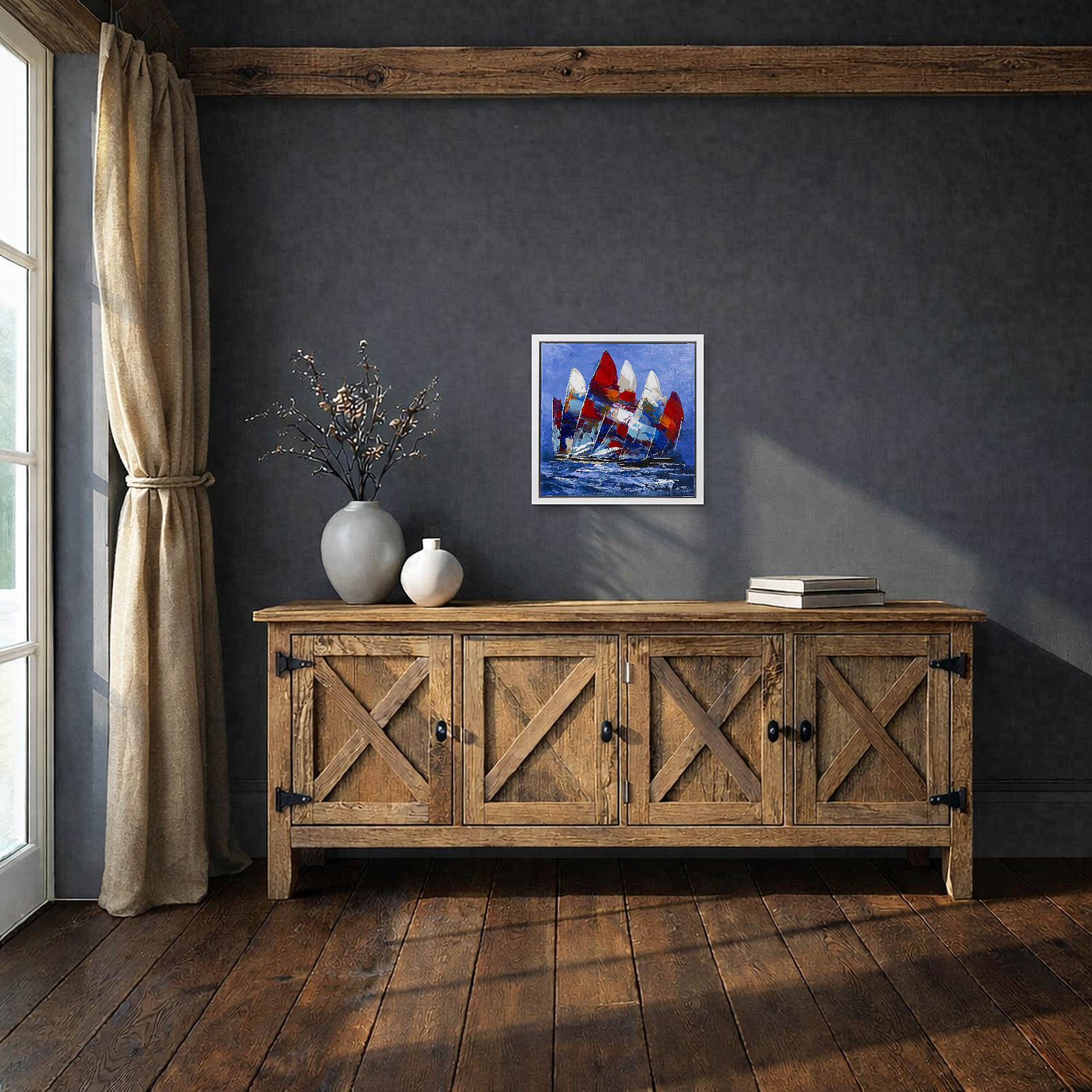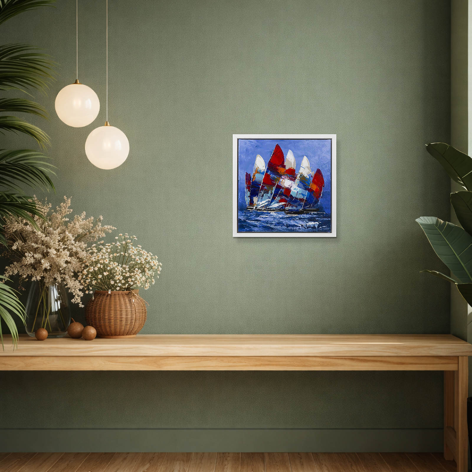 Dynamic original painting by the artist Cortes featuring striking colourful sail boats. Framed in a contemporary white floating frame as shown and ready to hang.