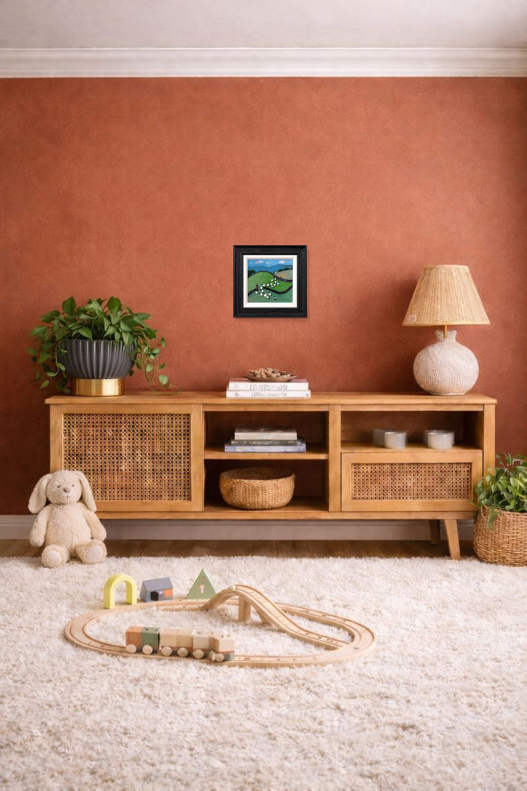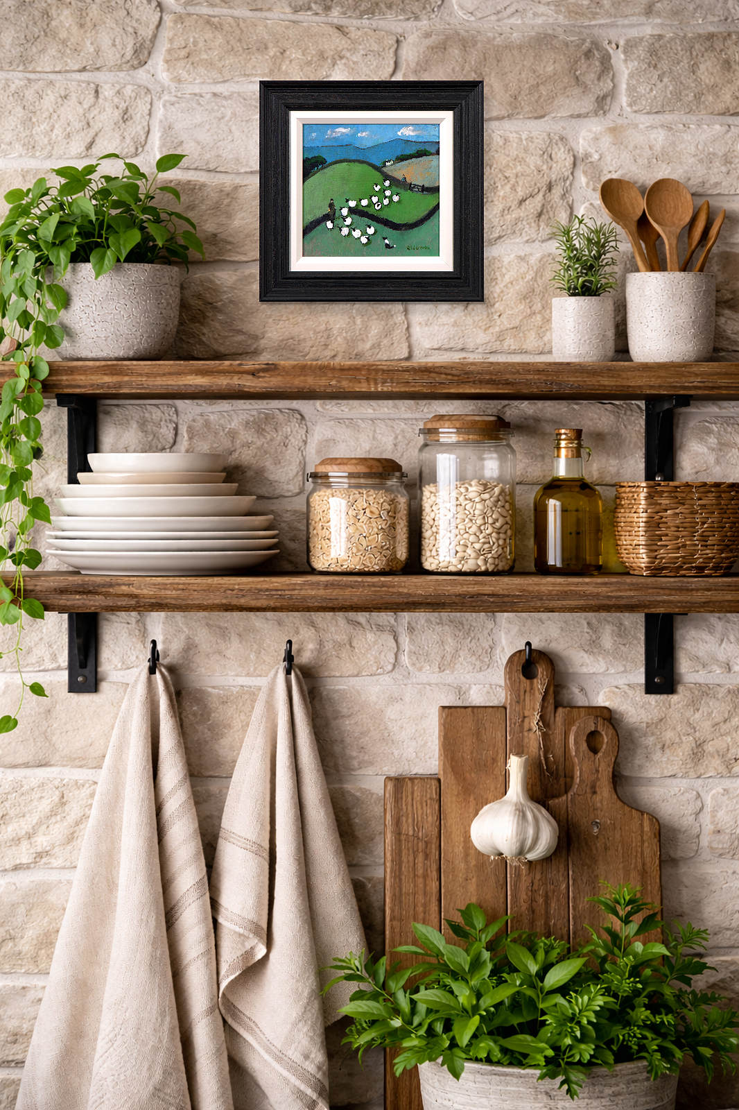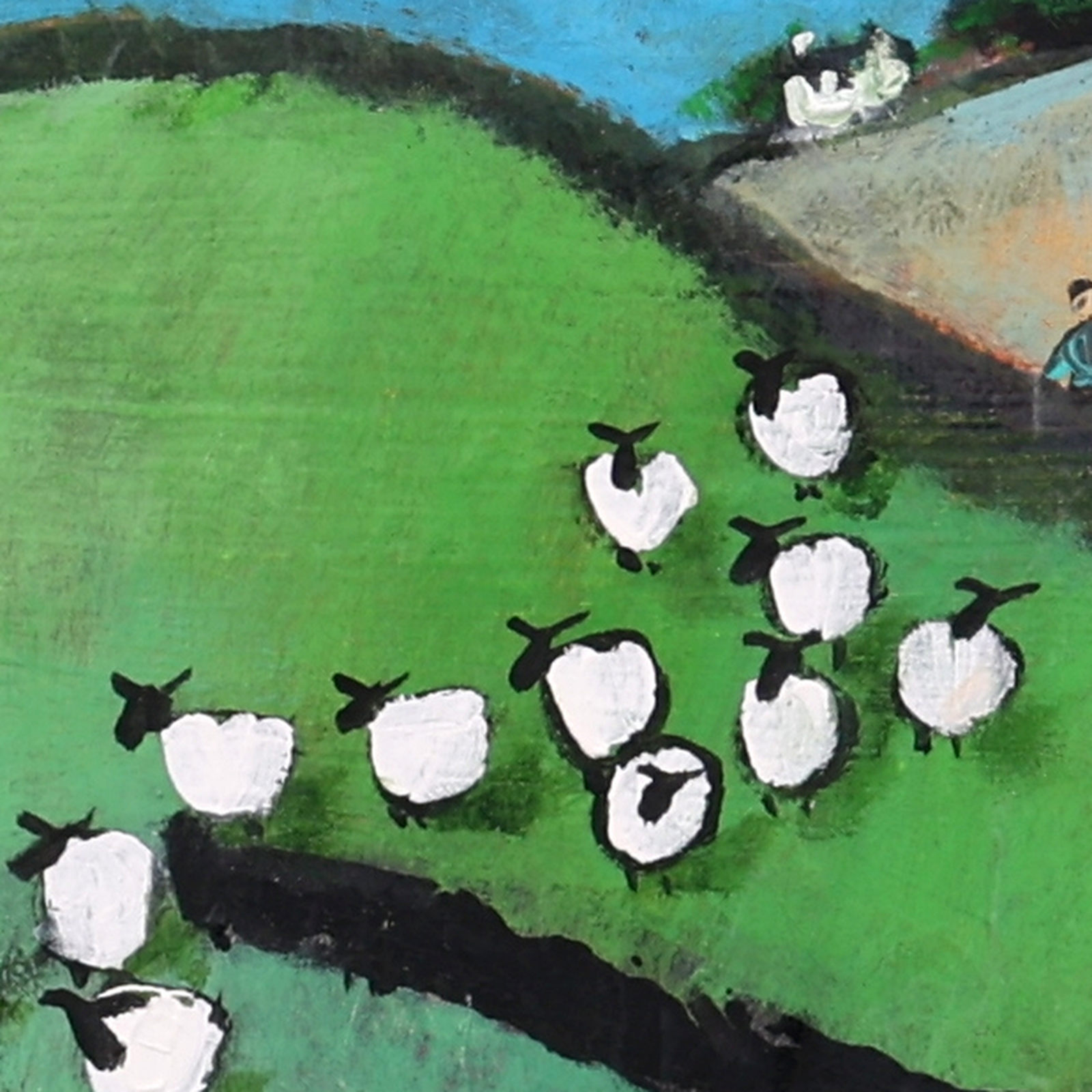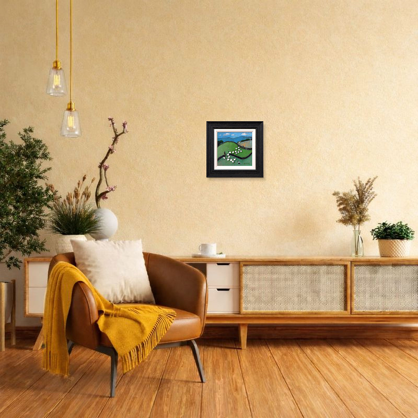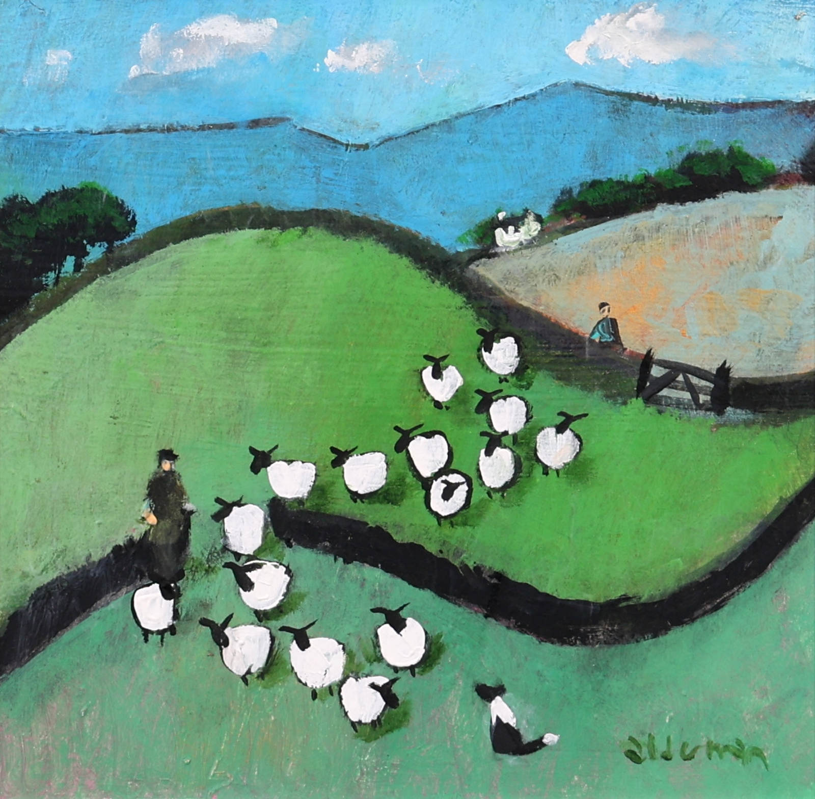 A colourful original painting by British artist David Alderman as part of the artist’s ‘sheepscape’ series. Framed as pictured and ready to hang.