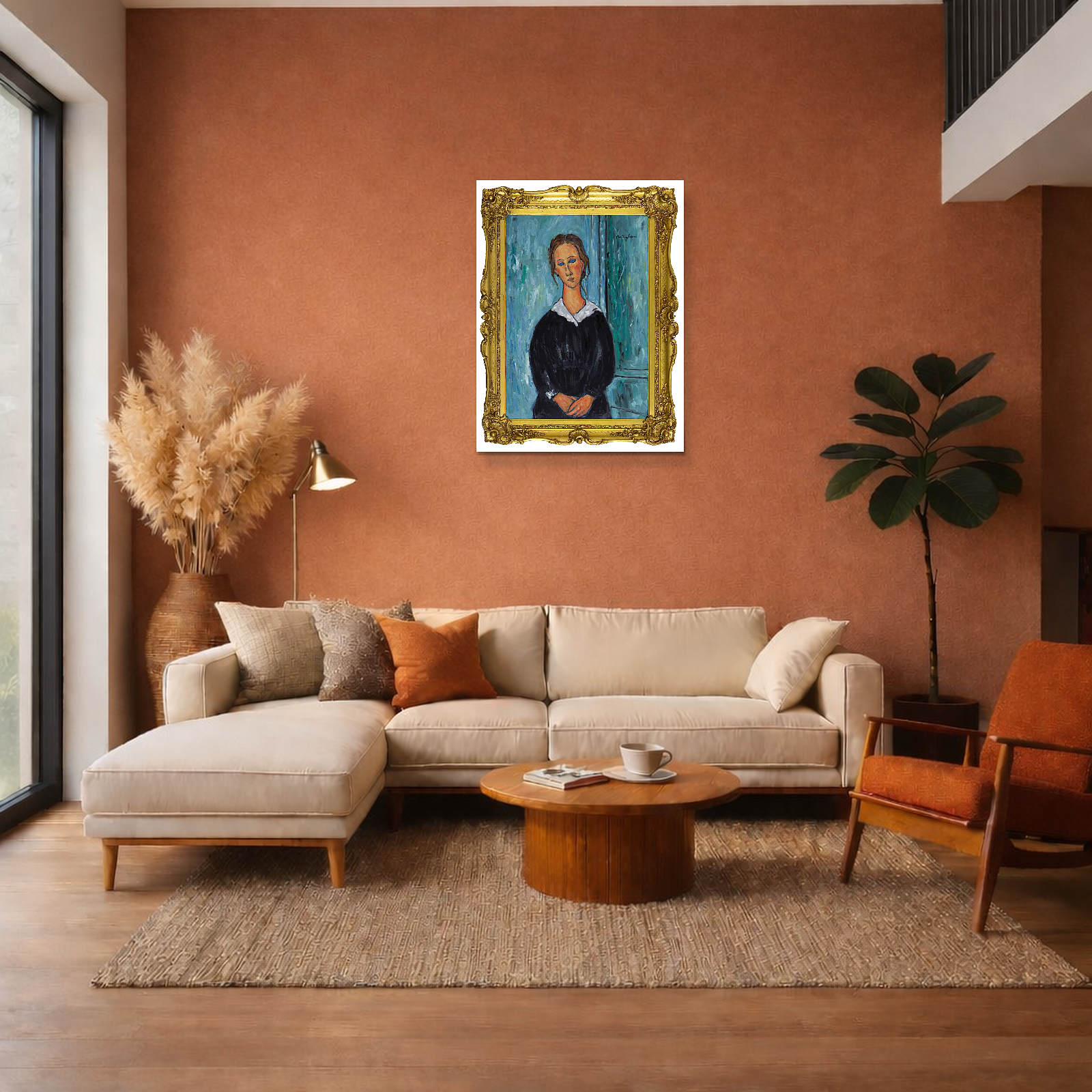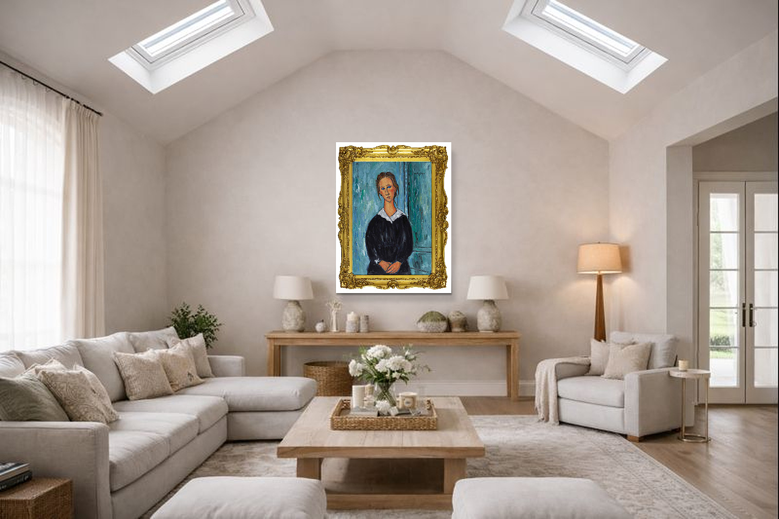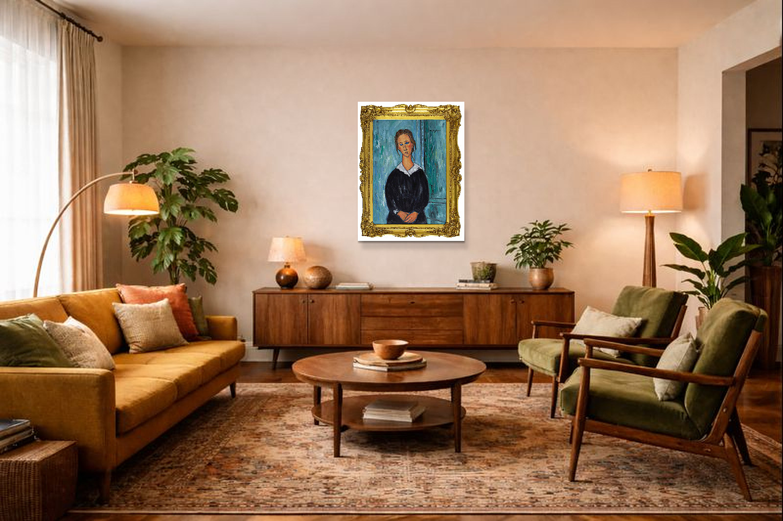 Original oil painting by David Henty in the style of a painting by Amedeo Modigliani created in 1918. Presented in ornate antique frame as shown and ready to display. Signed on the reverse ‘David Henty’.